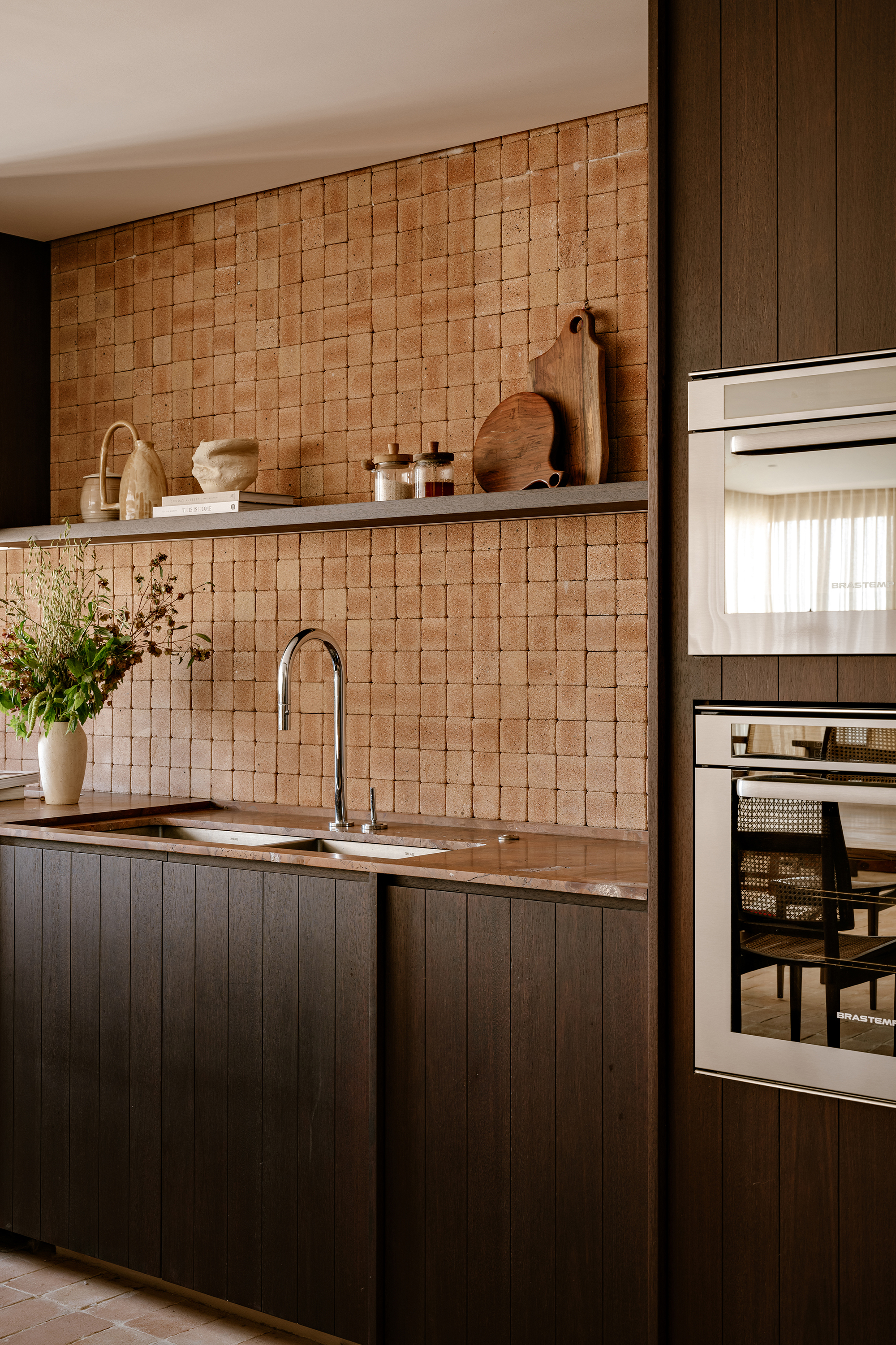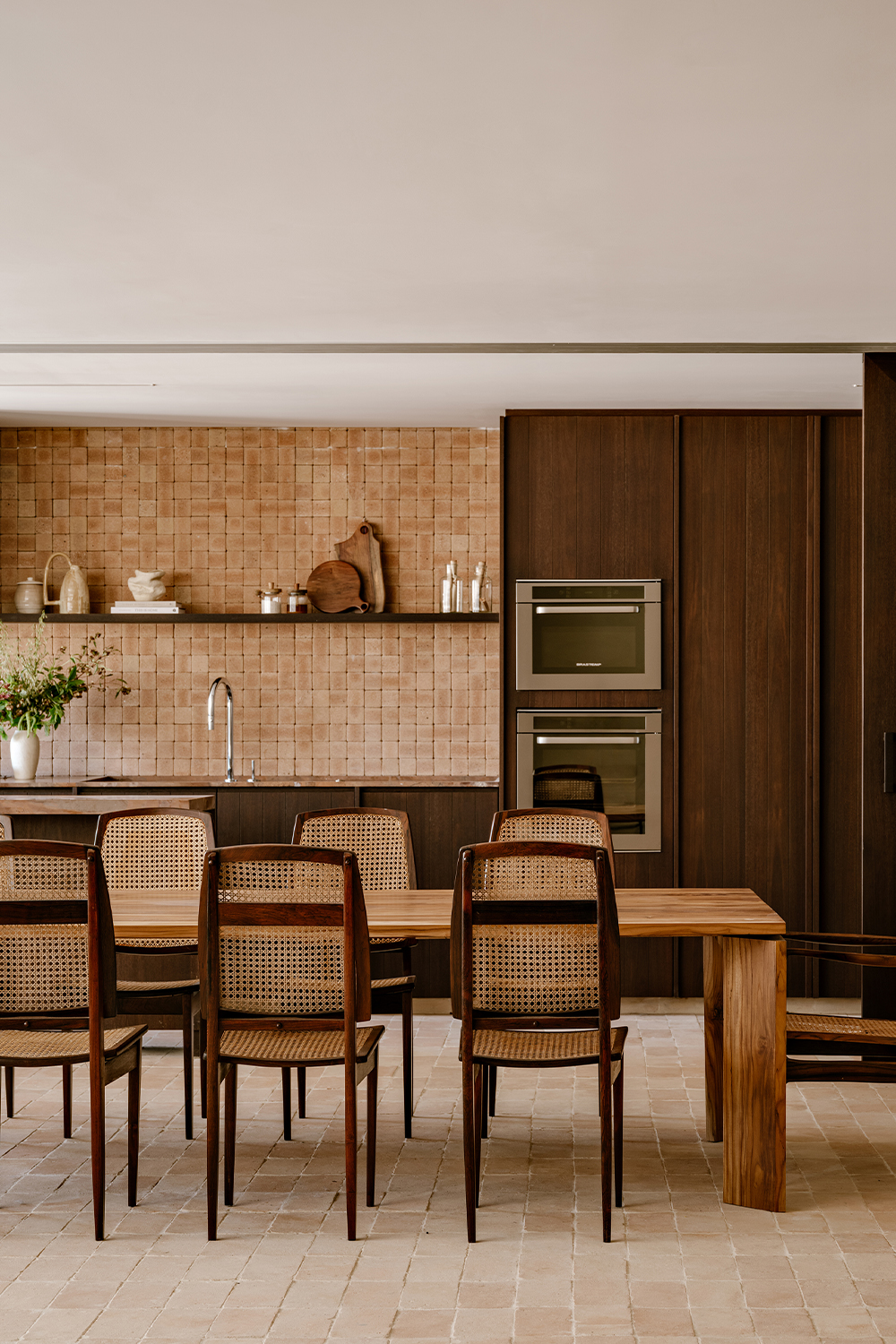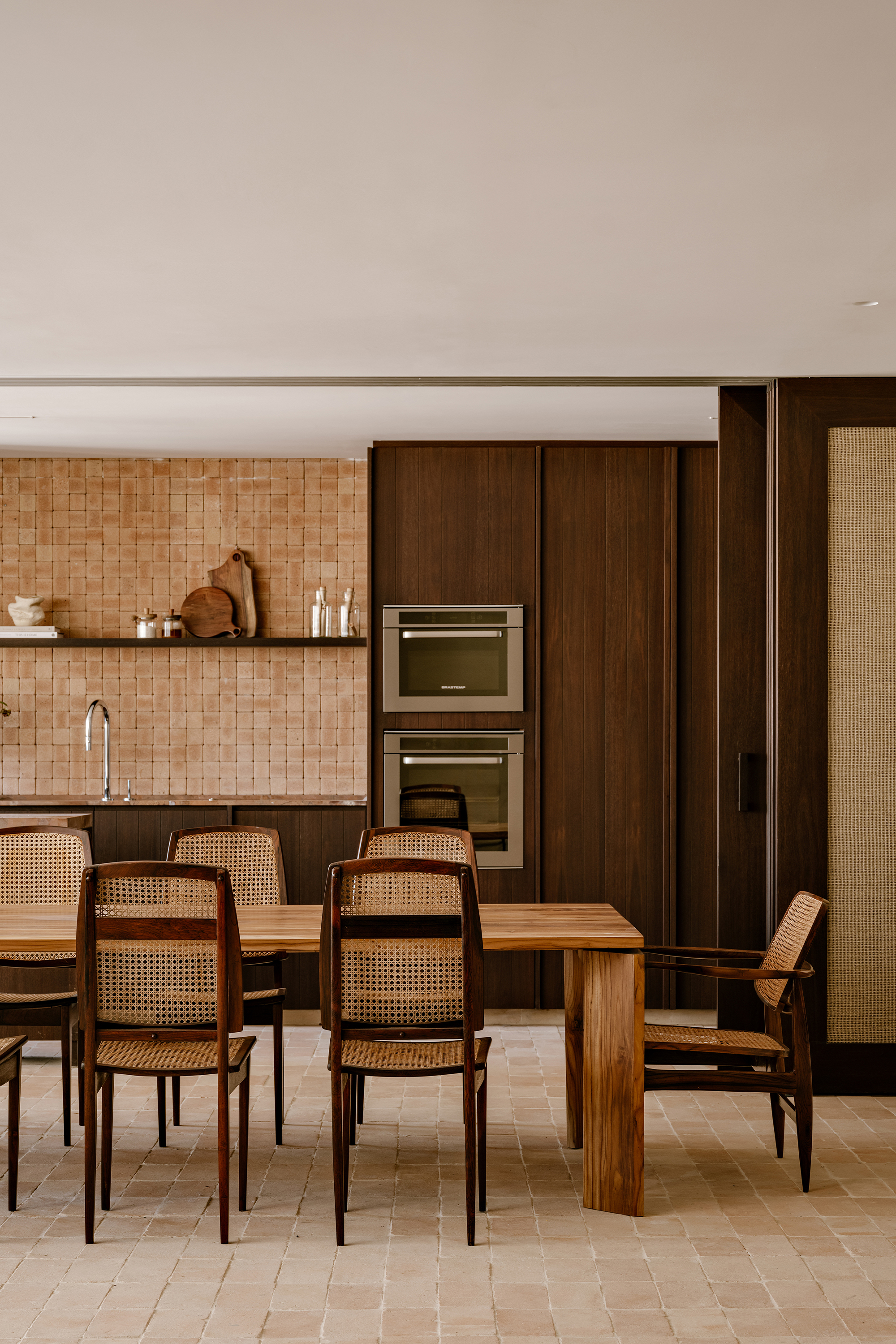 The kitchen and dining area were designed as the protagonists of the space, reflecting the couple’s lifestyle and their wish to host friends and family. Custom cabinetry in sucupira wood contrasts with the warmth of natural ceramic finishes, while made-to-measure joinery ensures clarity of proportions and a continuous visual rhythm.
