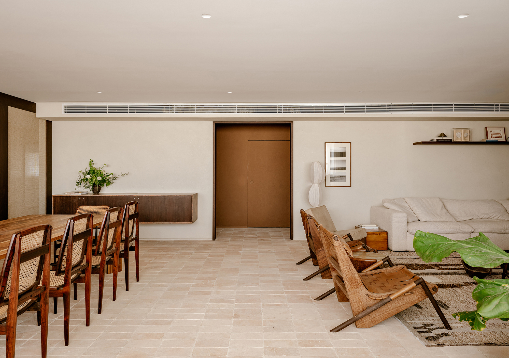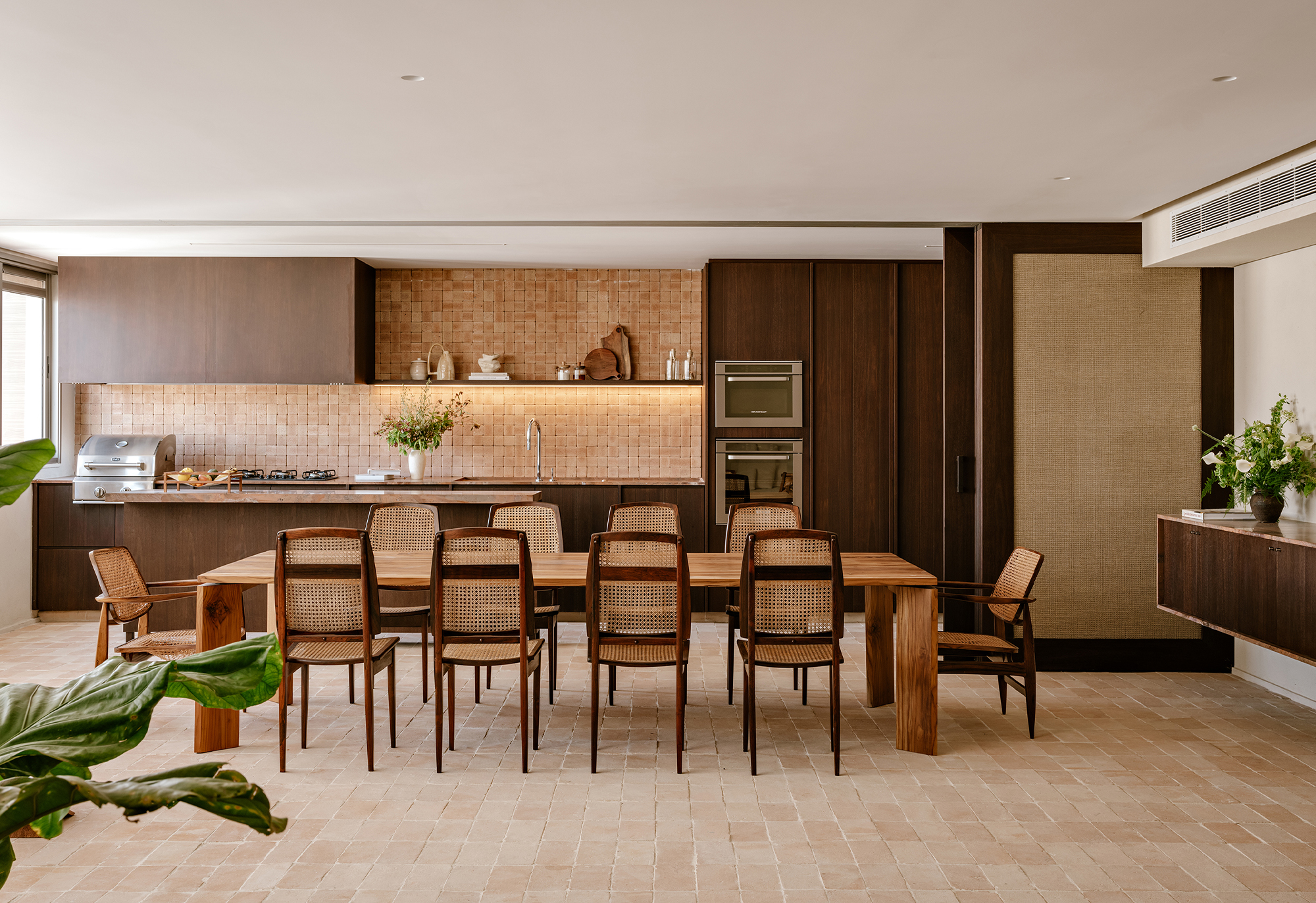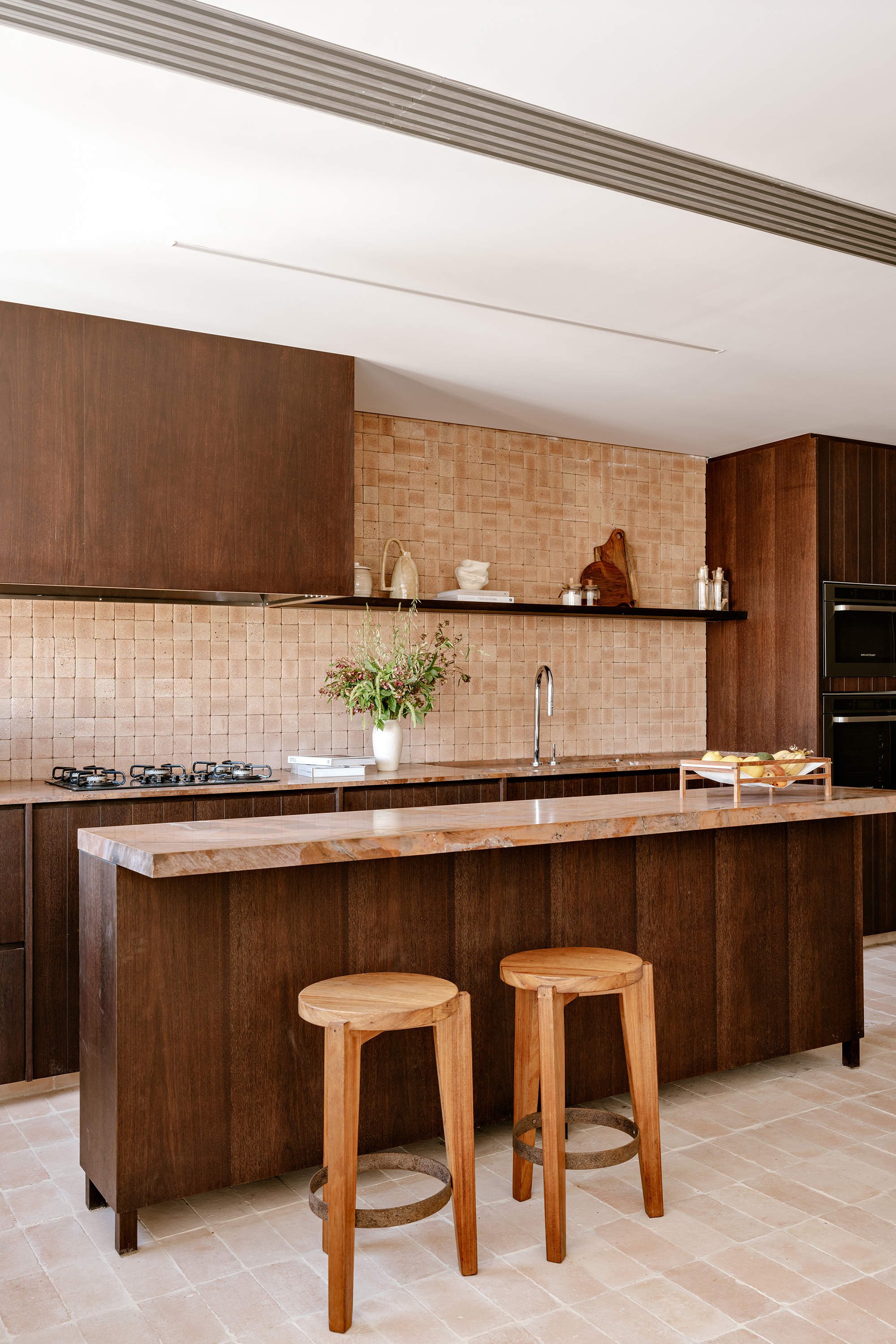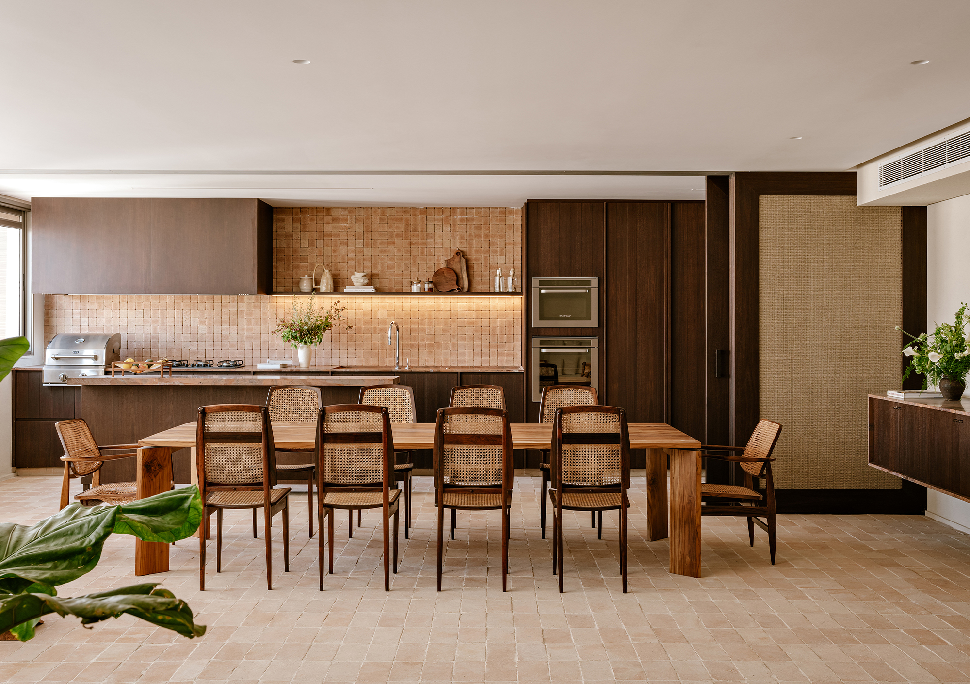 The kitchen and dining area were designed as the protagonists of the space, reflecting the couple’s lifestyle and their wish to host friends and family. Custom cabinetry in sucupira wood contrasts with the warmth of natural ceramic finishes, while made-to-measure joinery ensures clarity of proportions and a continuous visual rhythm.