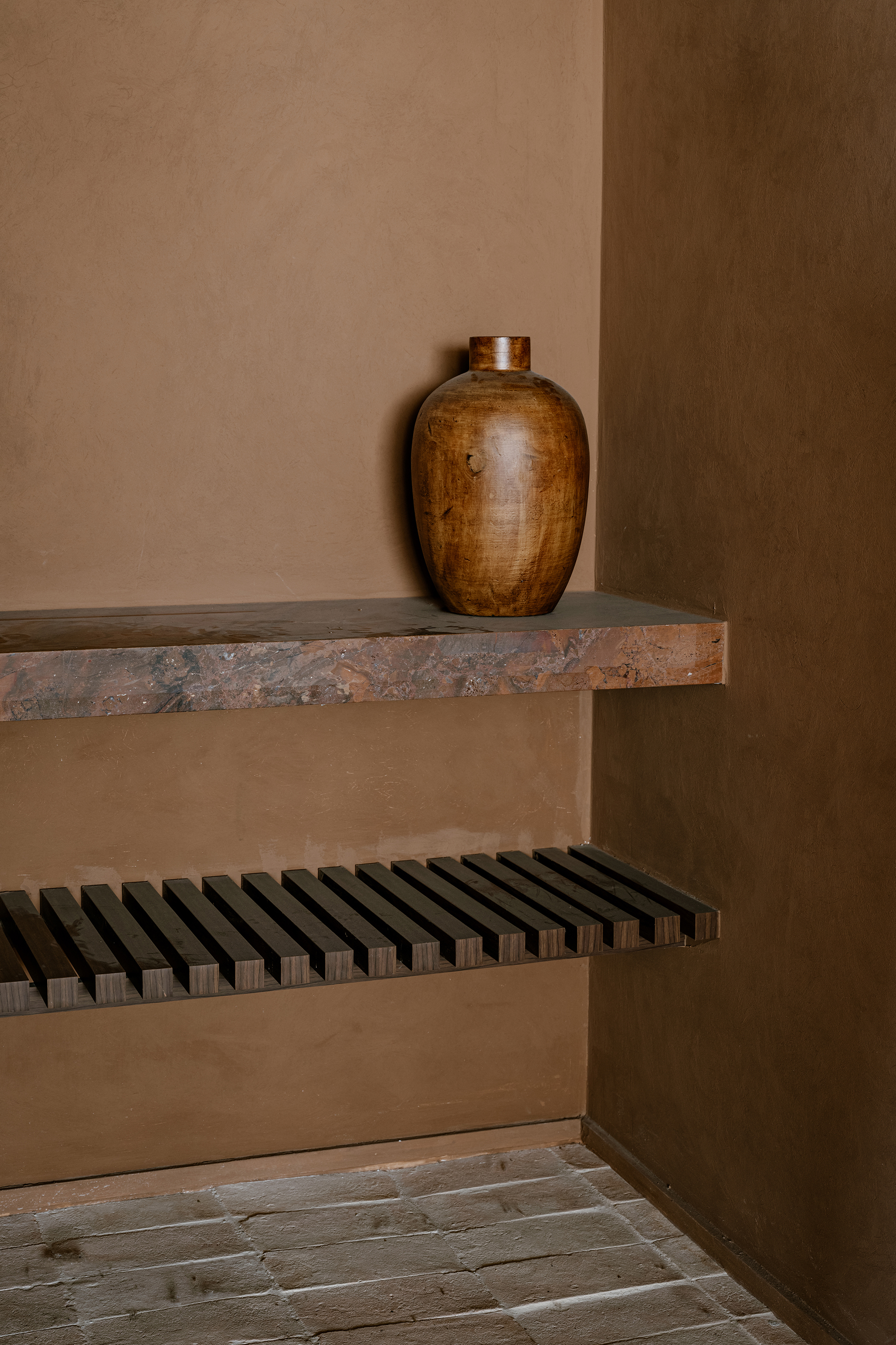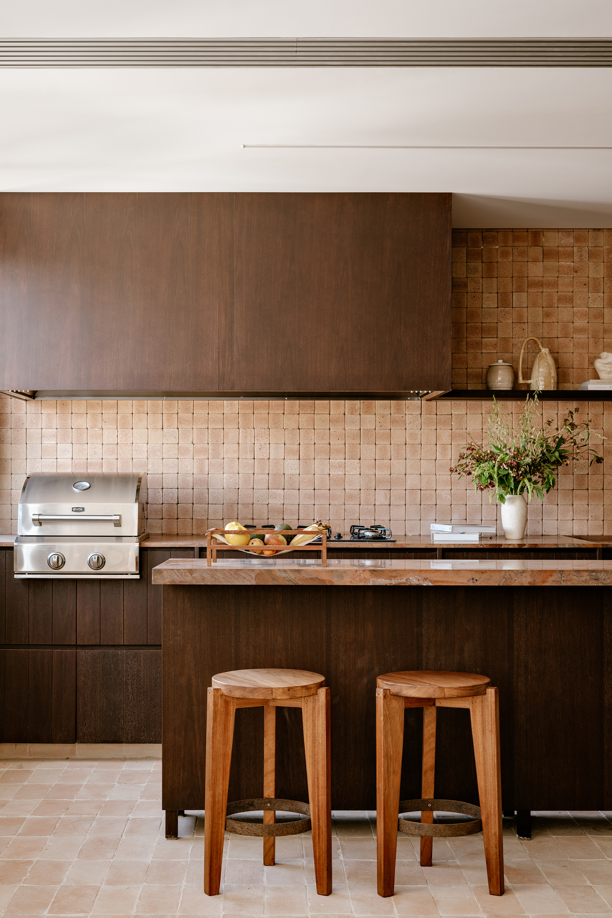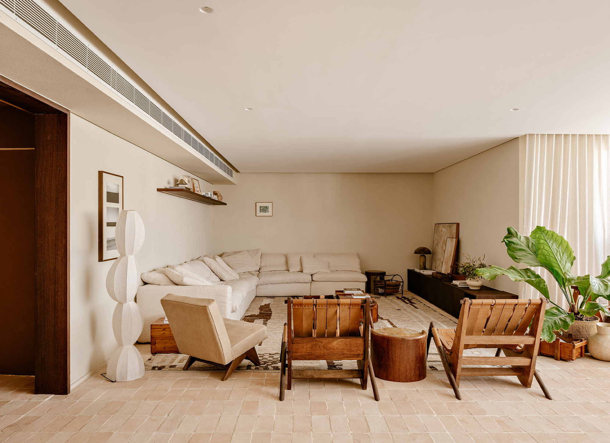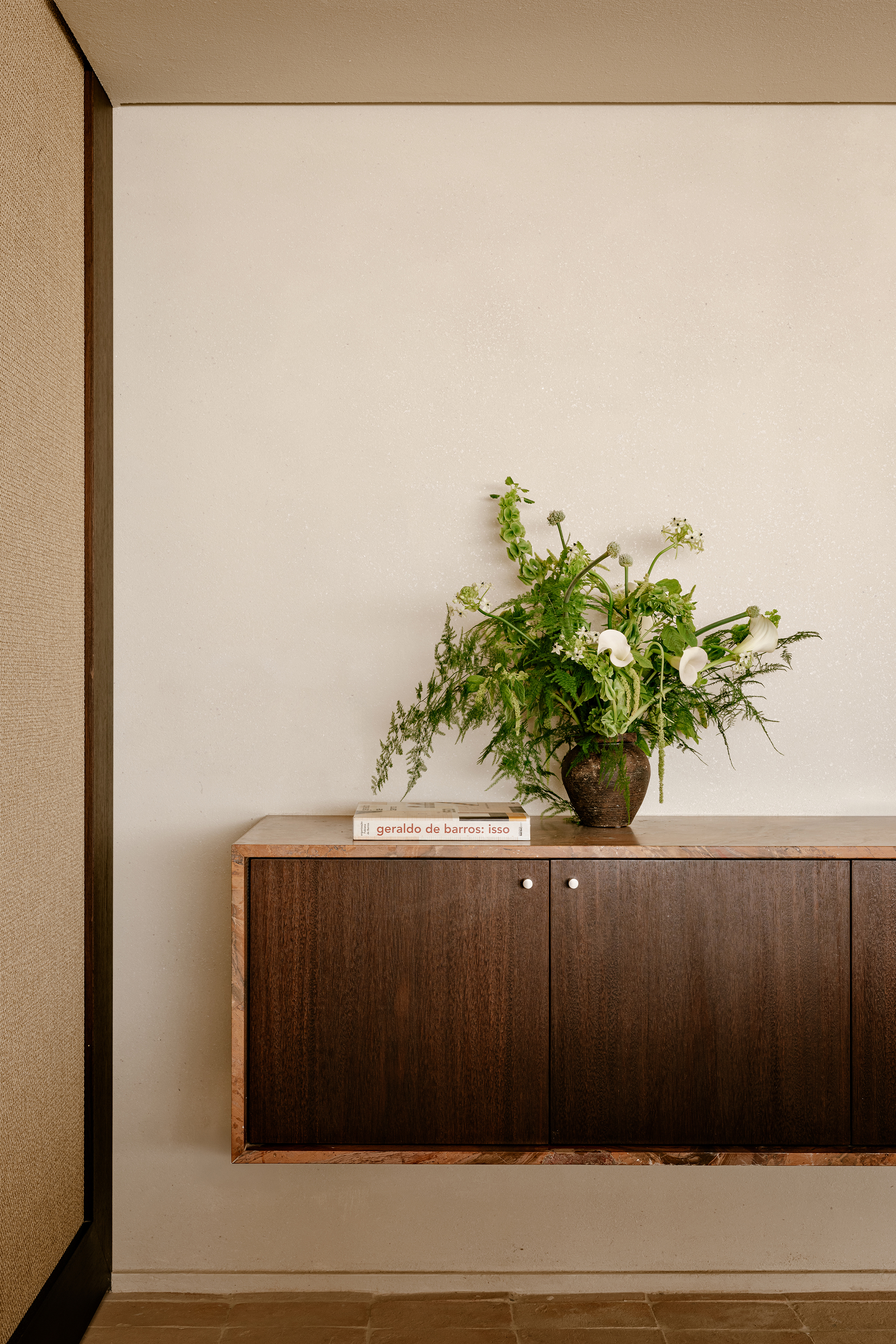 Upon entering, the architecture establishes a shift in atmosphere, softening the city’s intensity. The entrance hall, clad in a mineral texture in earthy tones, acts as a contemplative antechamber, preparing the eye and the senses for the spatial experience that follows. In the social area, the integration of spaces is defined by handcrafted clay flooring, chosen precisely to bring the atmosphere of a house into the apartment, evoking the earth and creating an immediate sense of warmth and comfort. This element became the conceptual foundation of the project, guiding the selection of materials and colors throughout.