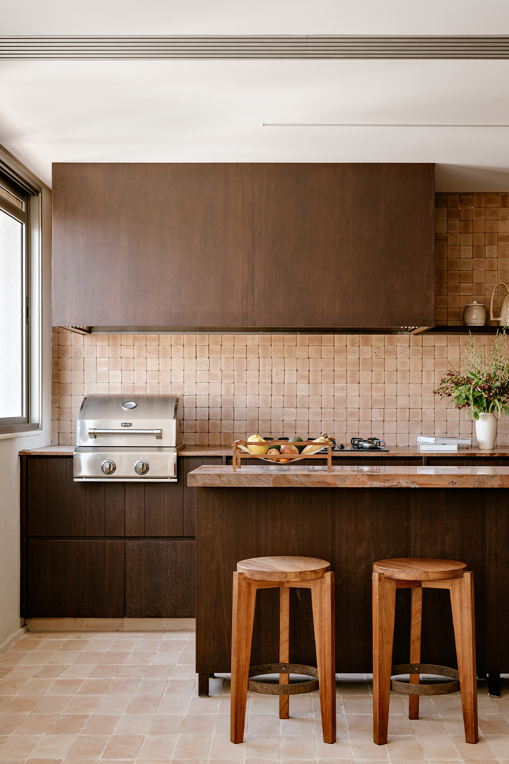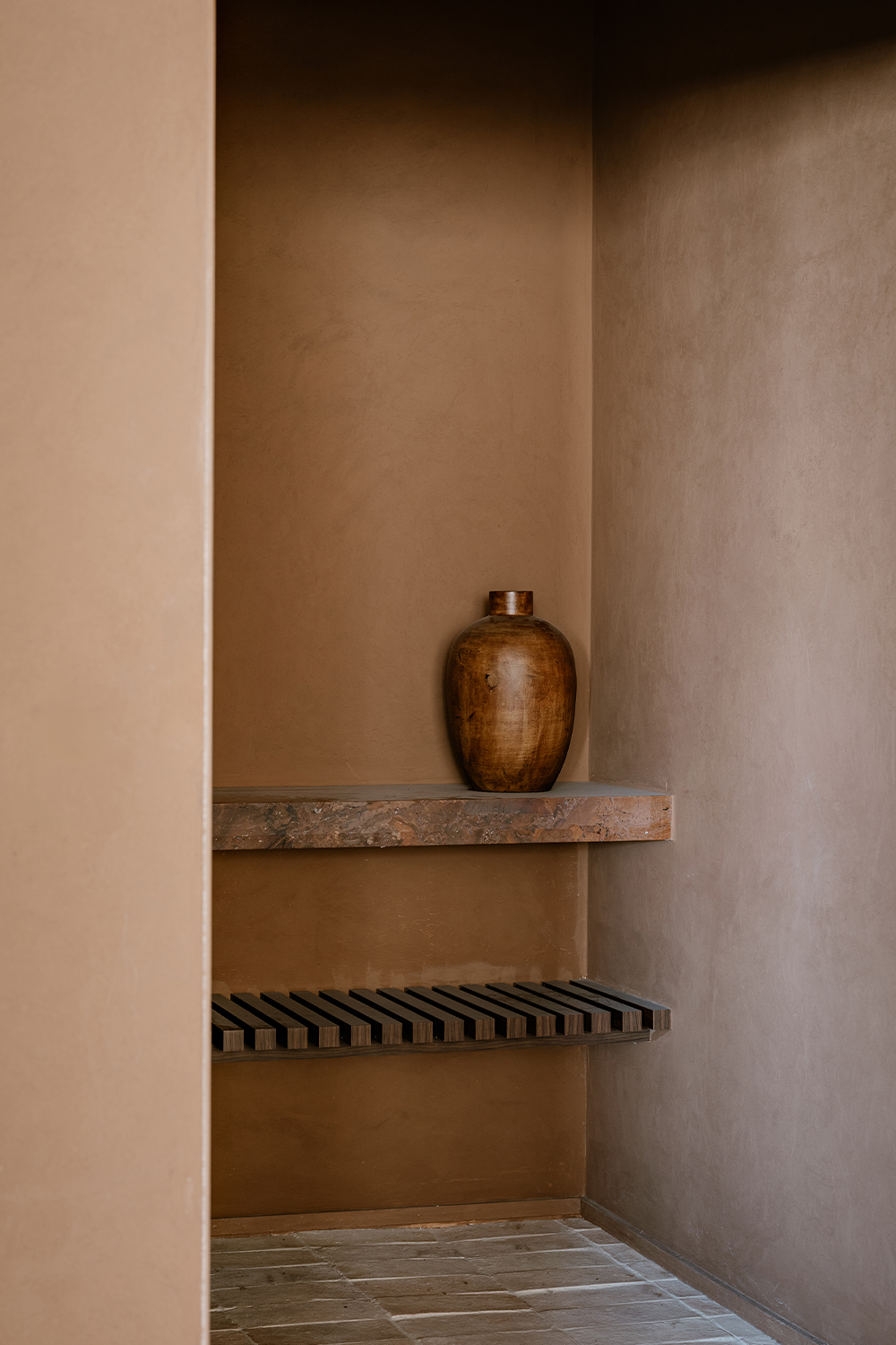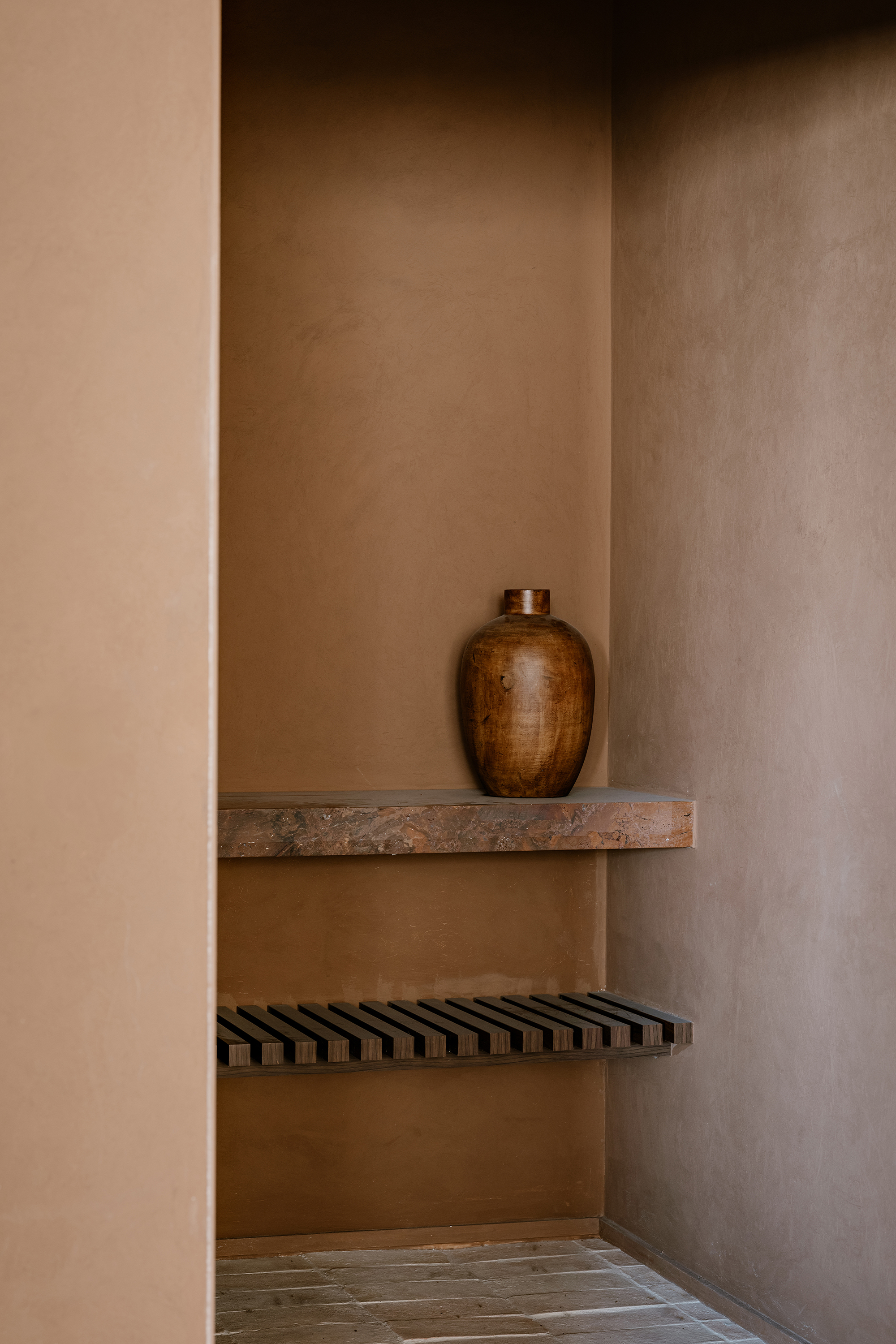 Upon entering, the architecture establishes a shift in atmosphere, softening the city’s intensity. The entrance hall, clad in a mineral texture in earthy tones, acts as a contemplative antechamber, preparing the eye and the senses for the spatial experience that follows. In the social area, the integration of spaces is defined by handcrafted clay flooring, chosen precisely to bring the atmosphere of a house into the apartment, evoking the earth and creating an immediate sense of warmth and comfort. This element became the conceptual foundation of the project, guiding the selection of materials and colors throughout.