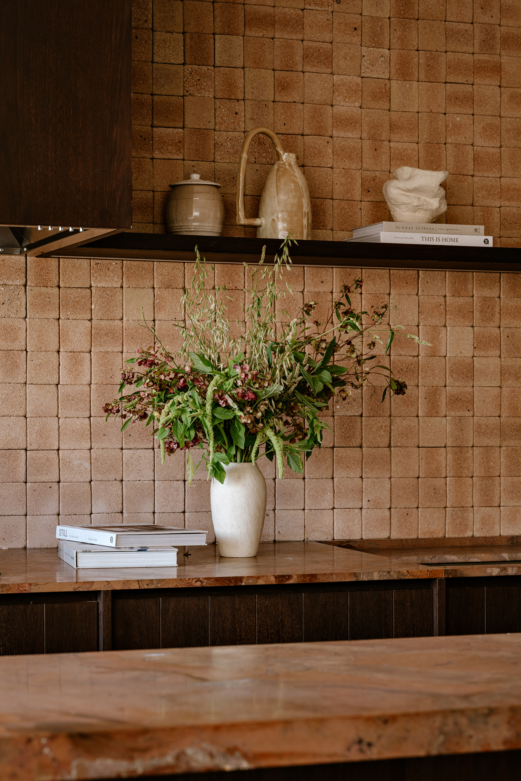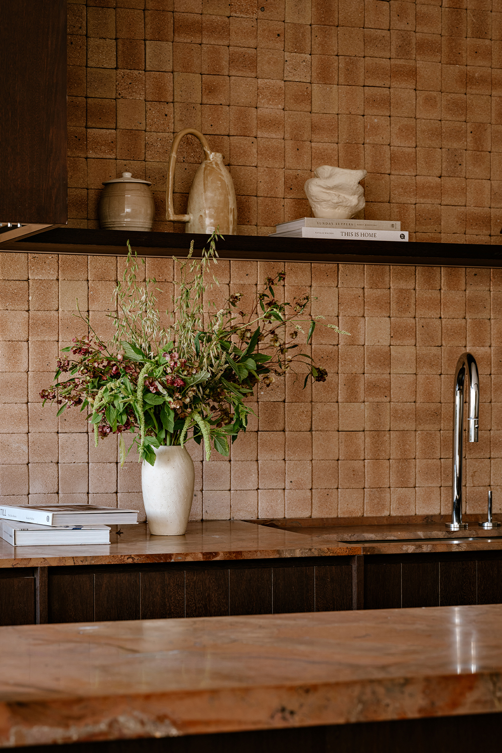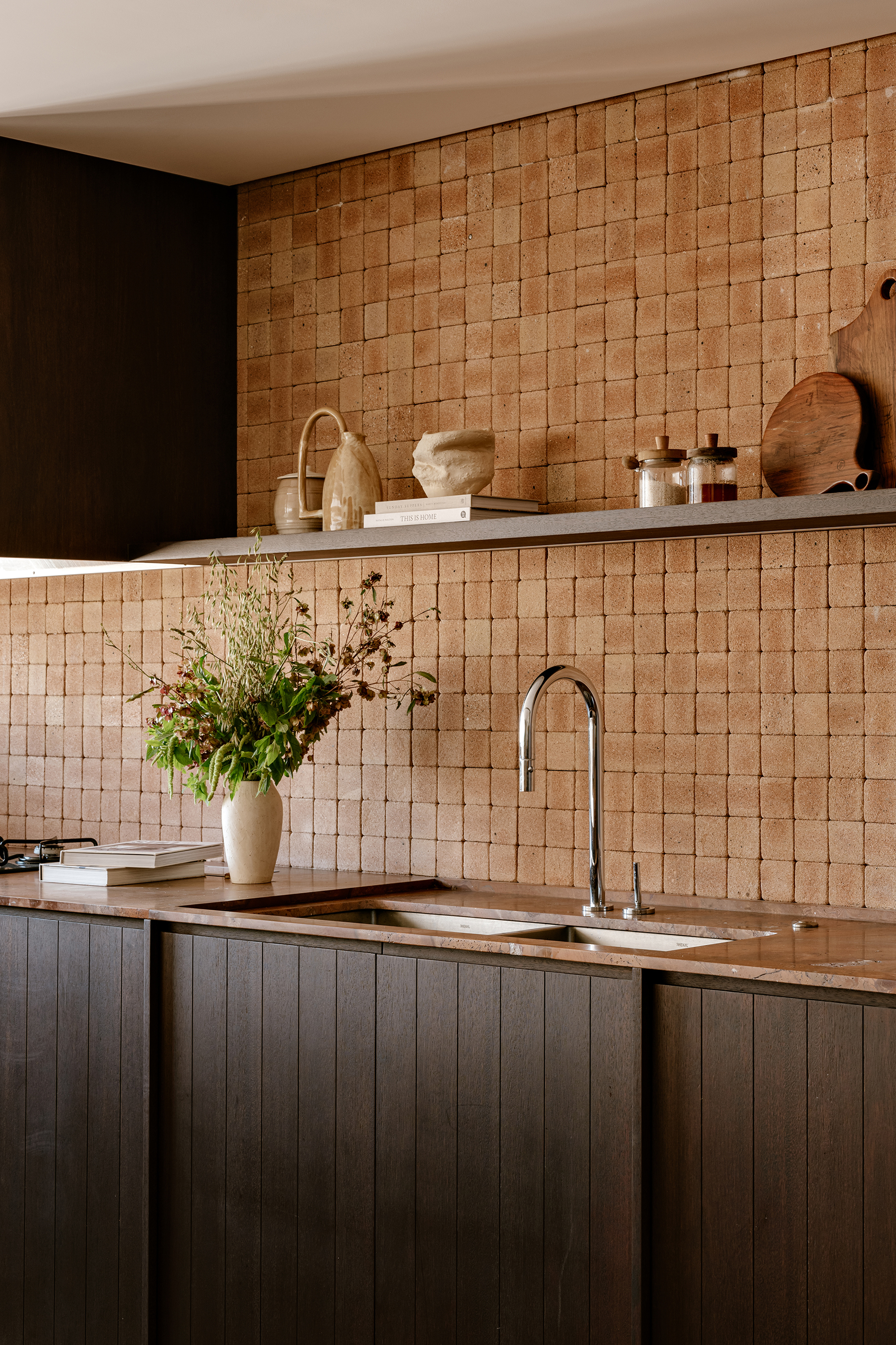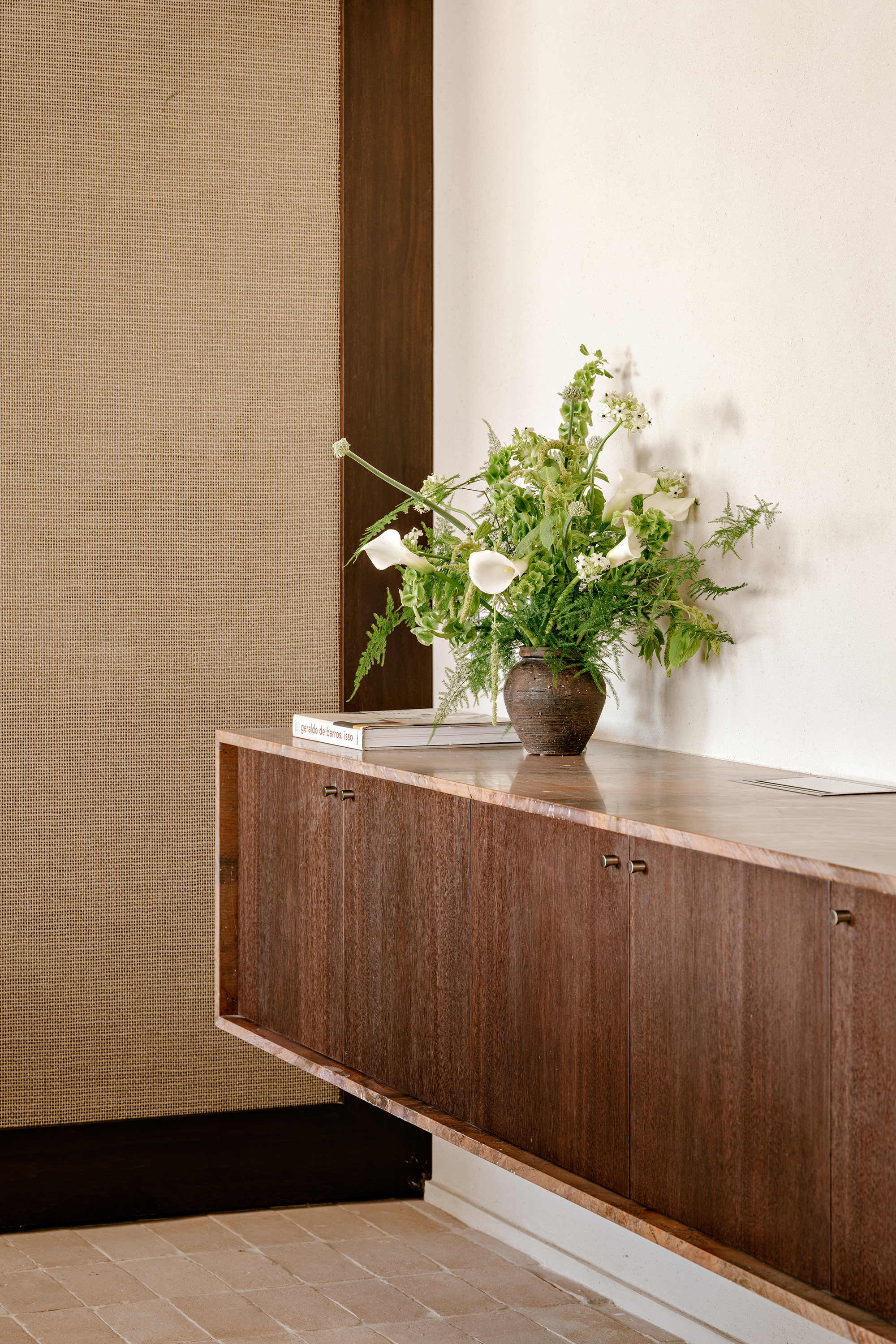 Upon entering, the architecture establishes a shift in atmosphere, softening the city’s intensity. The entrance hall, clad in a mineral texture in earthy tones, acts as a contemplative antechamber, preparing the eye and the senses for the spatial experience that follows. In the social area, the integration of spaces is defined by handcrafted clay flooring, chosen precisely to bring the atmosphere of a house into the apartment, evoking the earth and creating an immediate sense of warmth and comfort. This element became the conceptual foundation of the project, guiding the selection of materials and colors throughout.