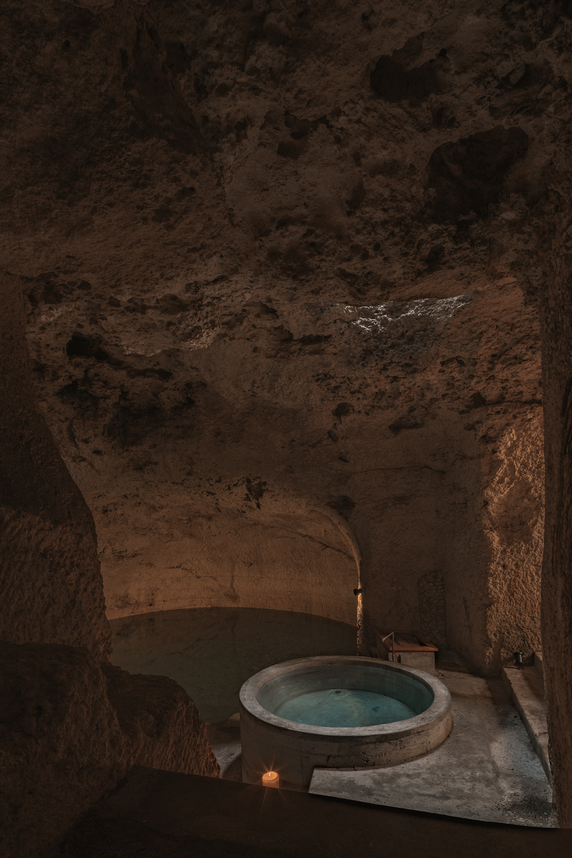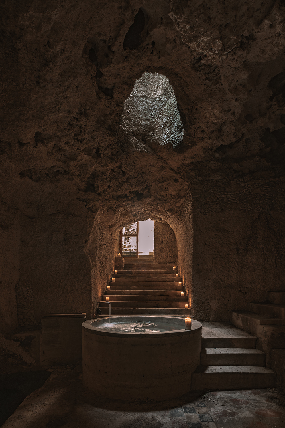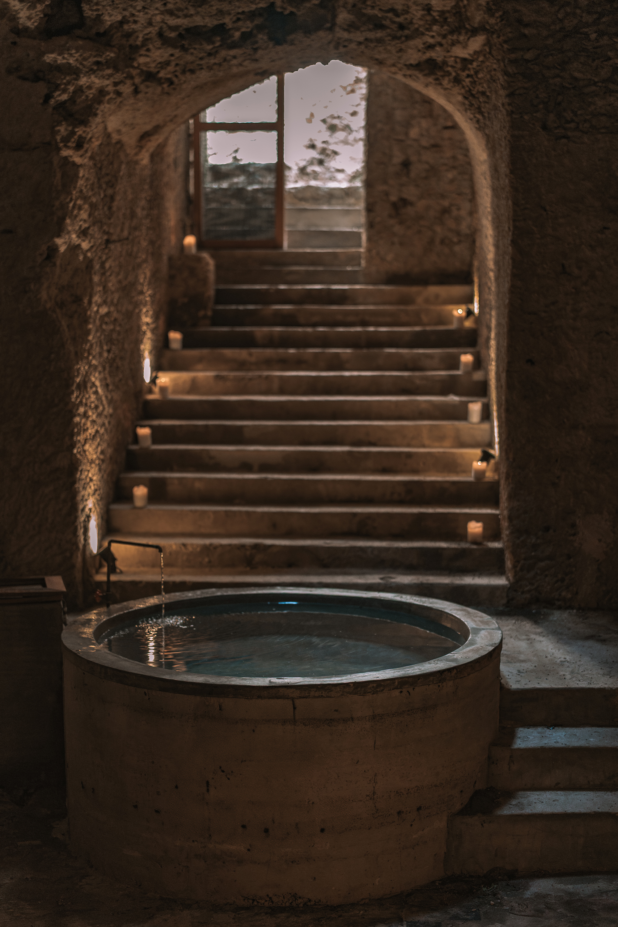 Next to the pool, a stairway descends to the lower level, where an artificial tub was placed directly beneath the original well. Natural light falls through the shaft and touches the water. The result is a humid, intimate, and quiet space. A pause before the astonishment.