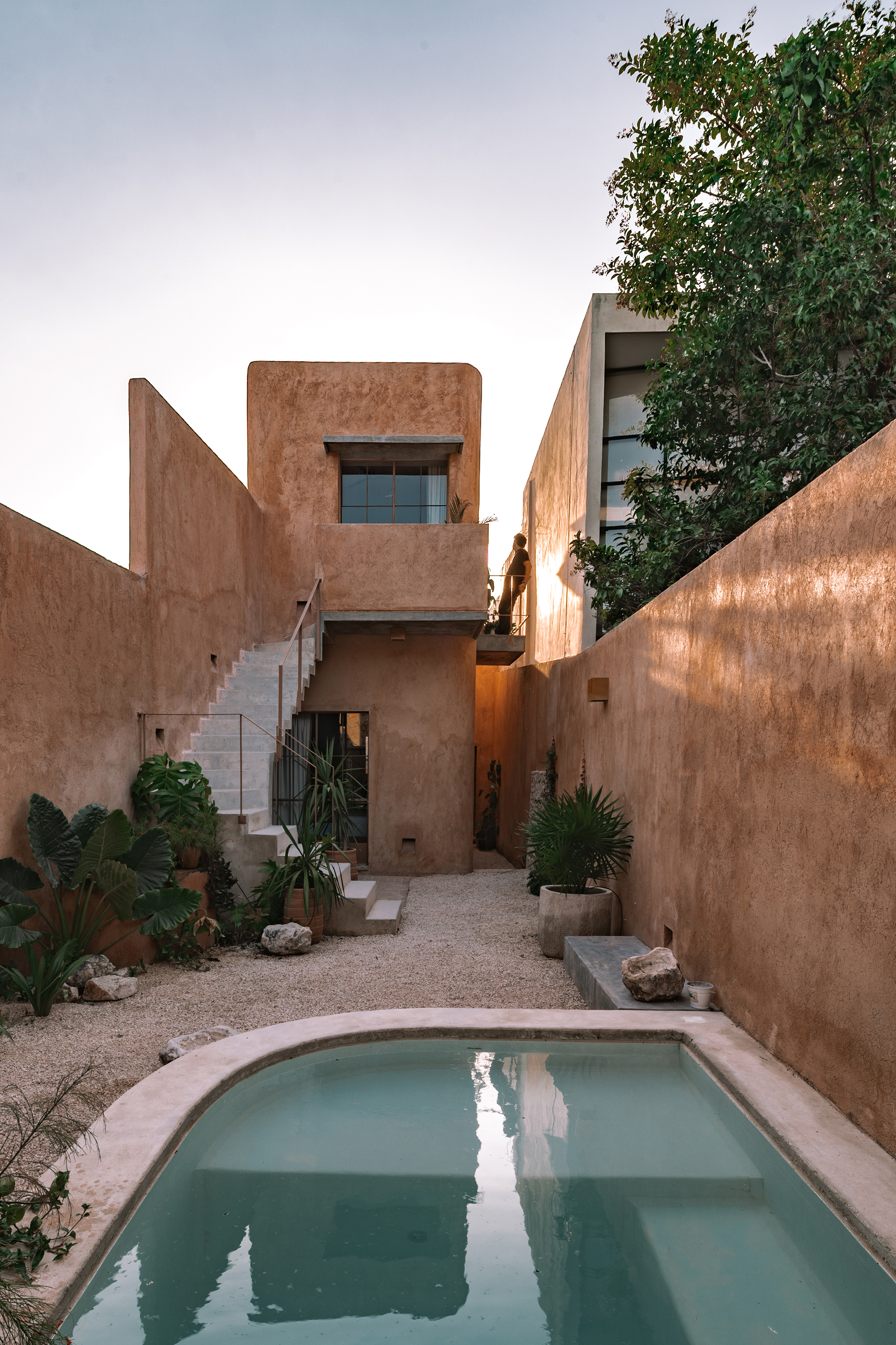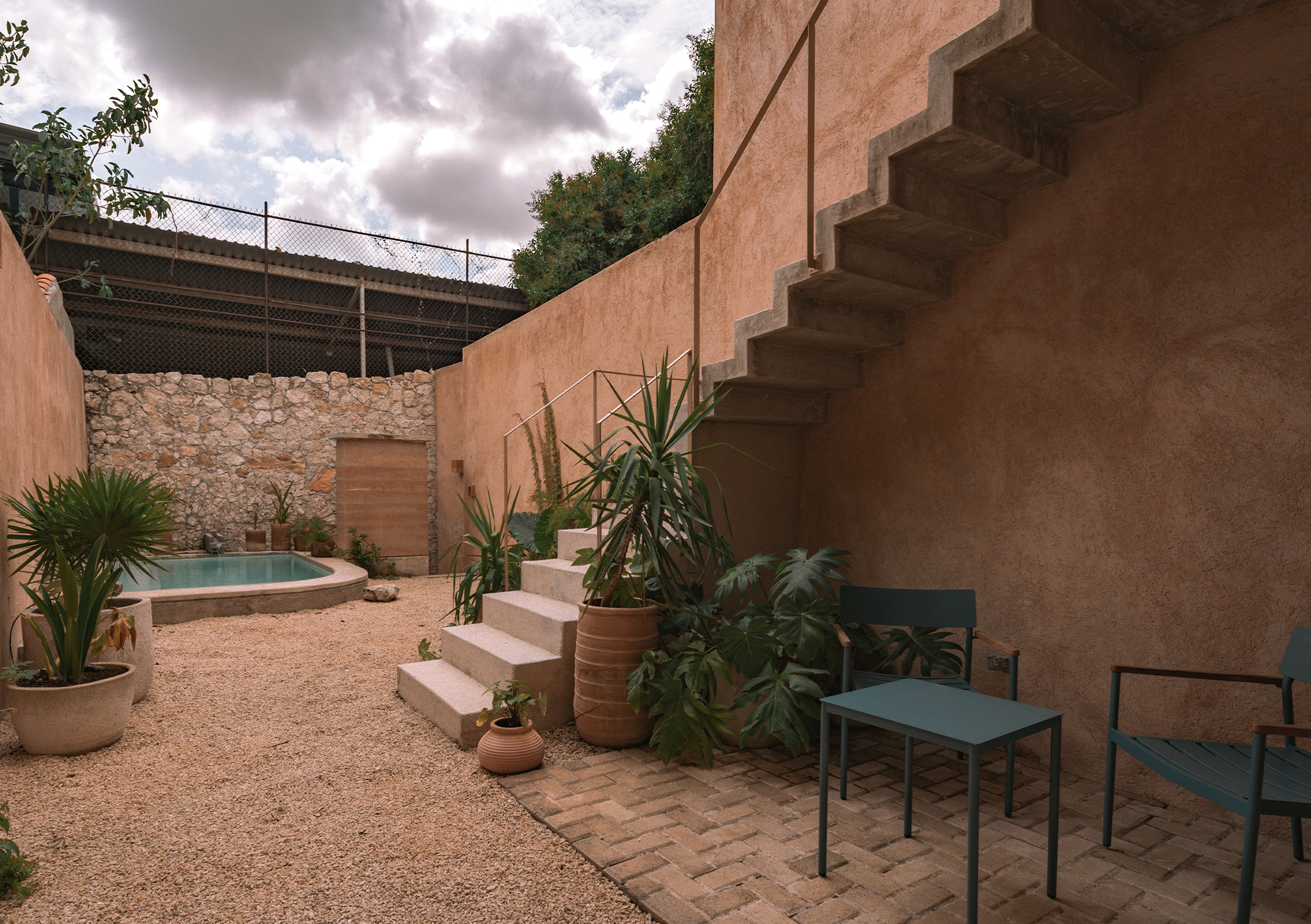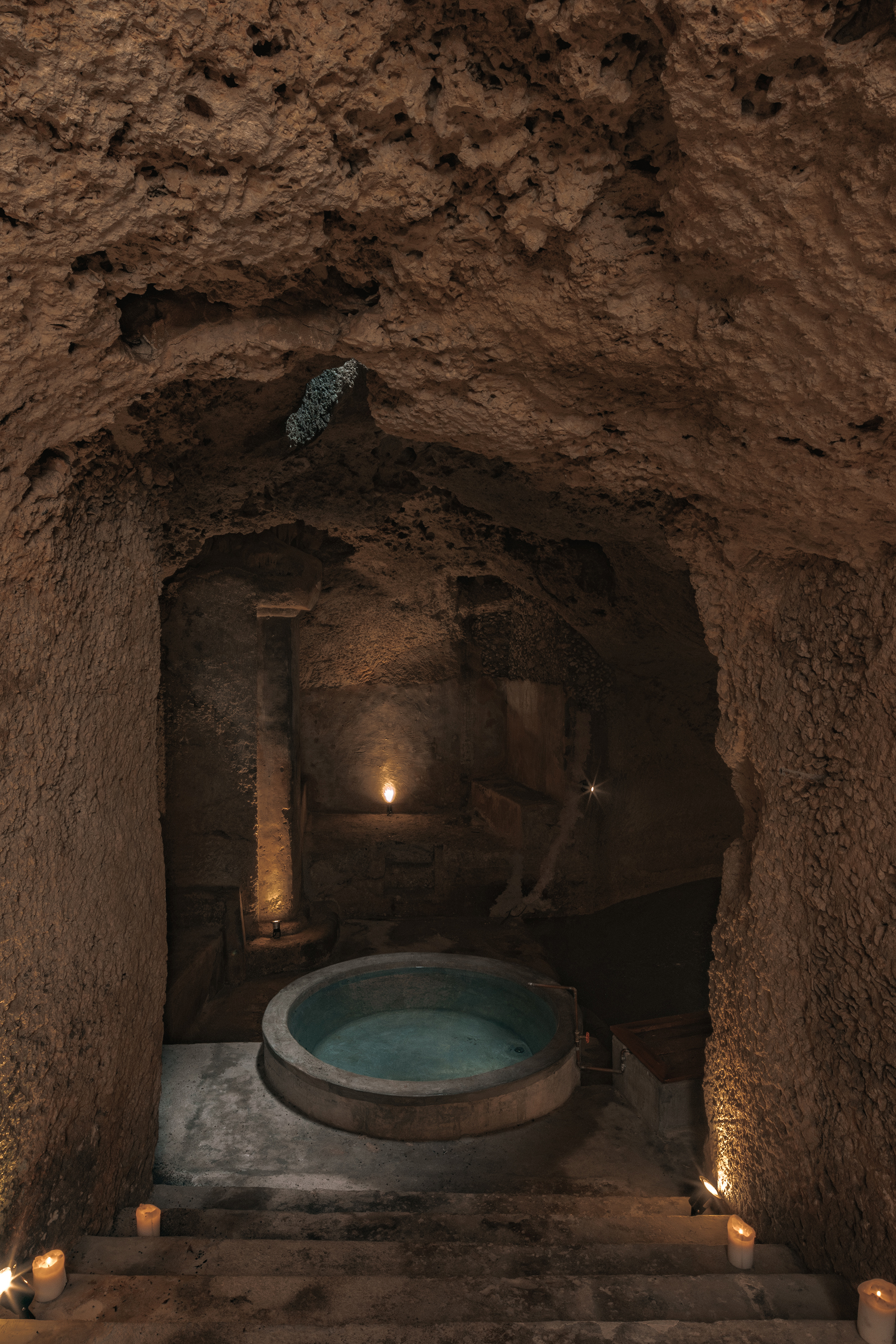 Next to the pool, a stairway descends to the lower level, where an artificial tub was placed directly beneath the original well. Natural light falls through the shaft and touches the water. The result is a humid, intimate, and quiet space. A pause before the astonishment.