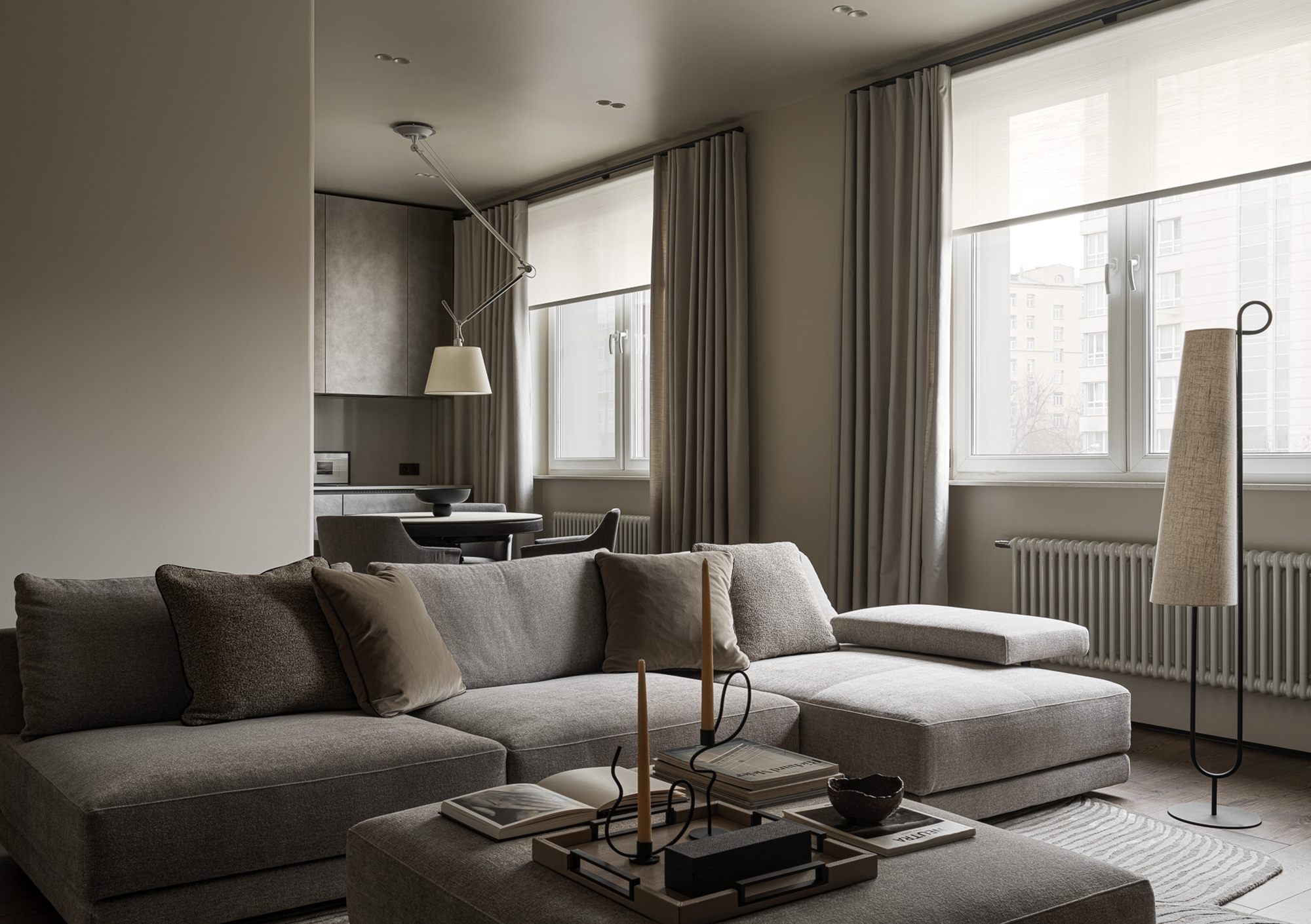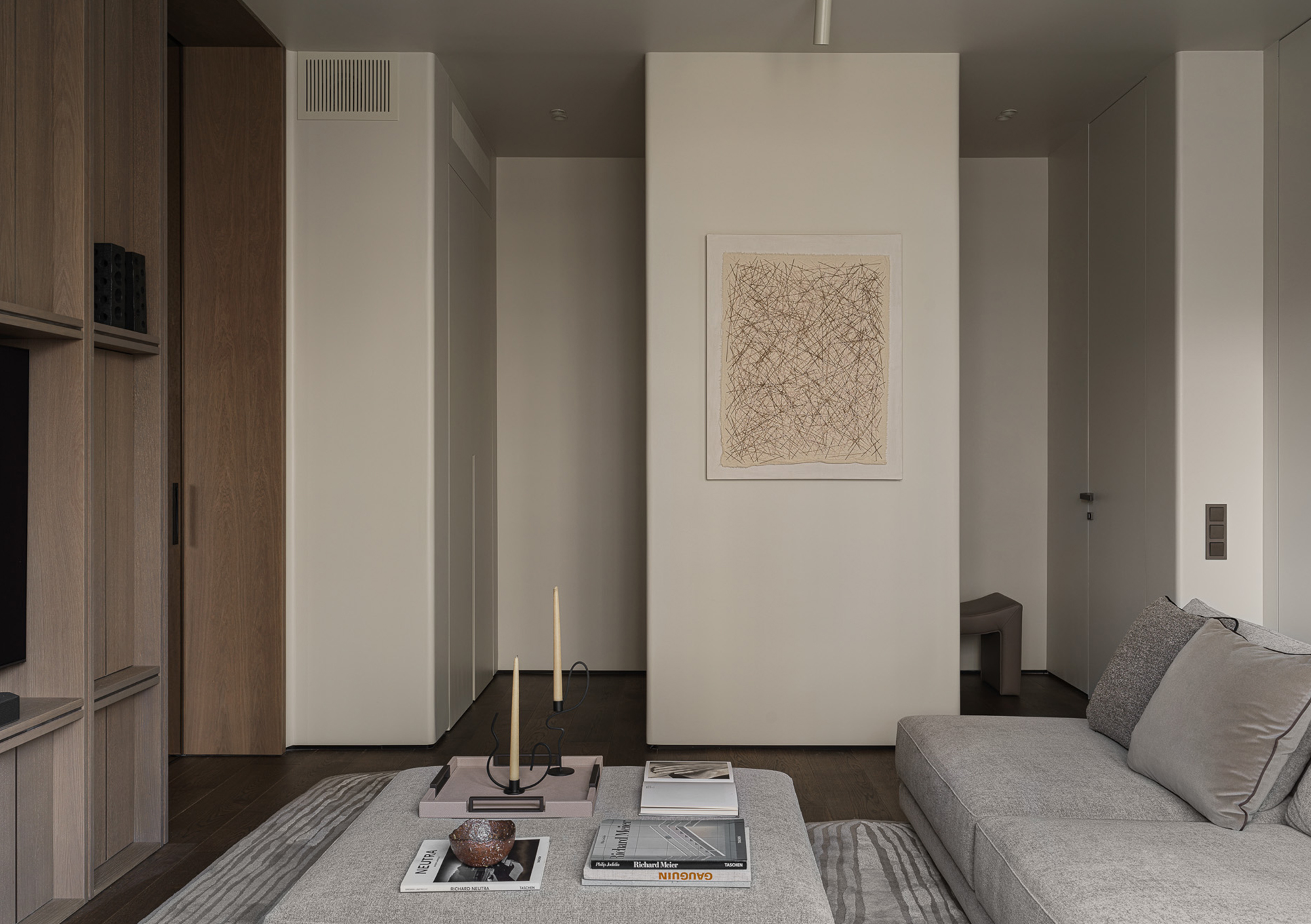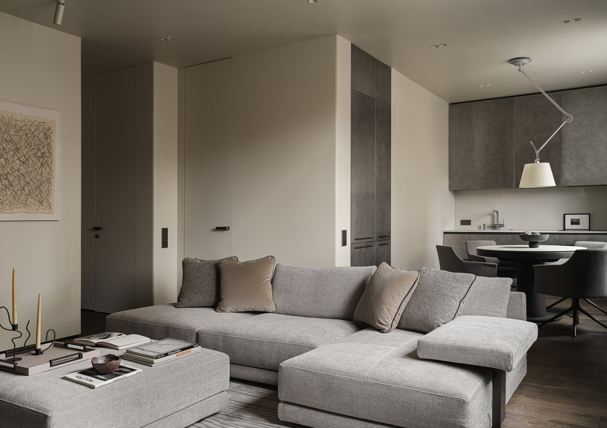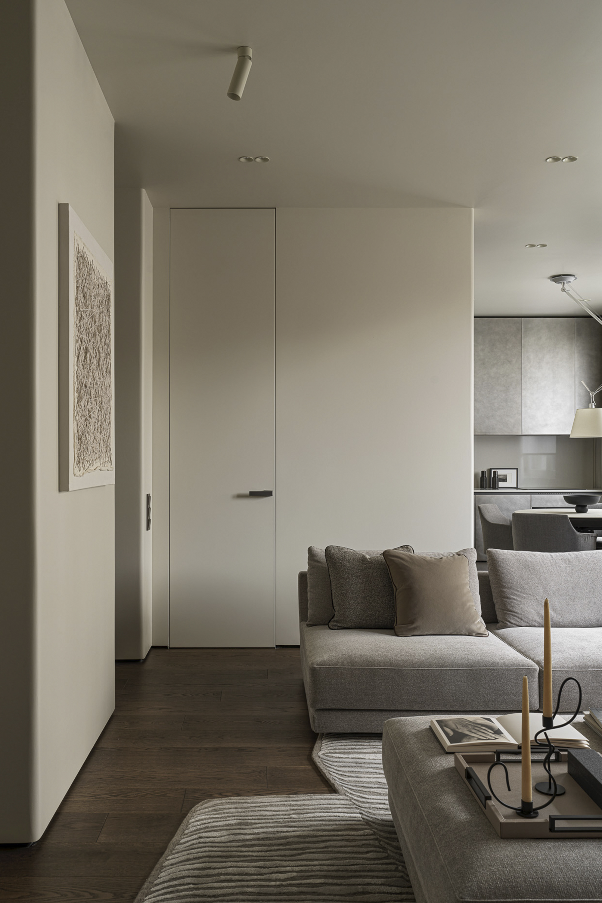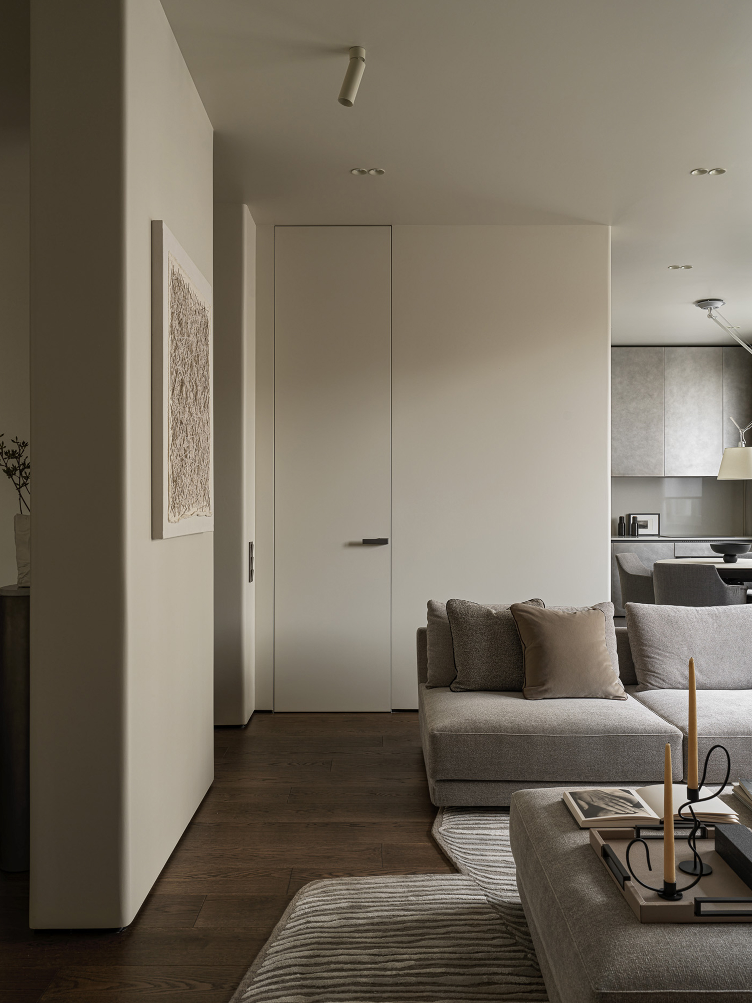 This apartment was designed for a male client who wanted a modern, minimalist interior with ample storage space—a strict yet comfortable home that would always feel welcoming.