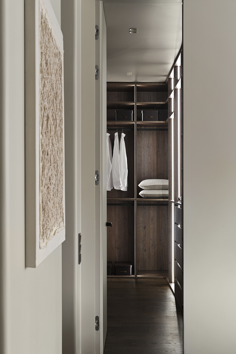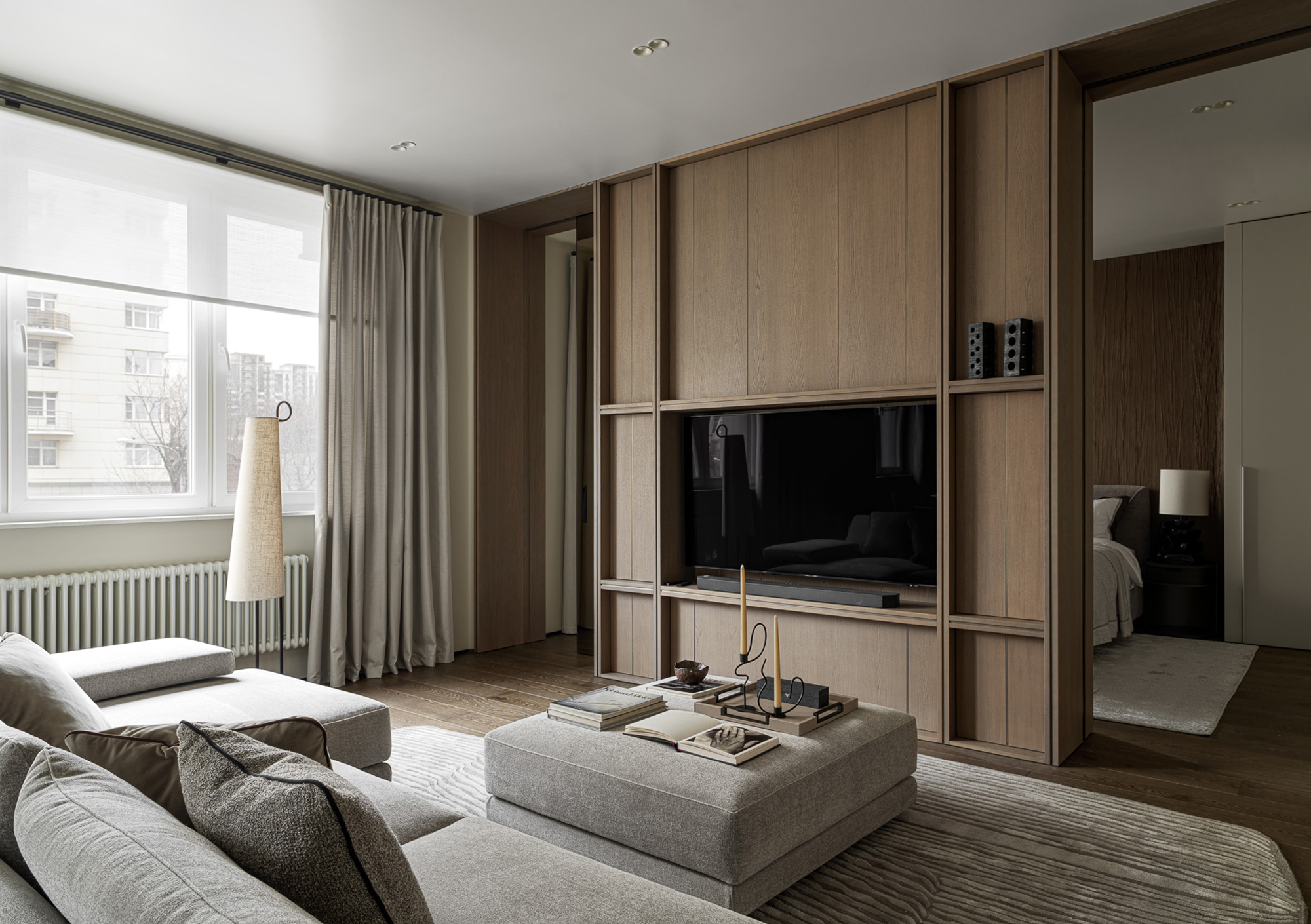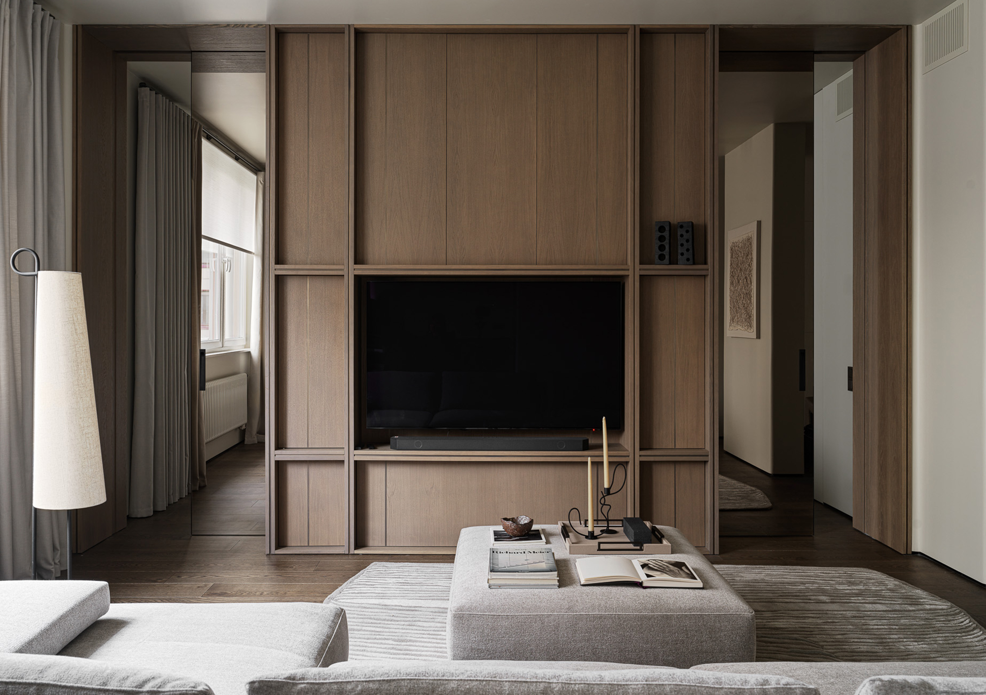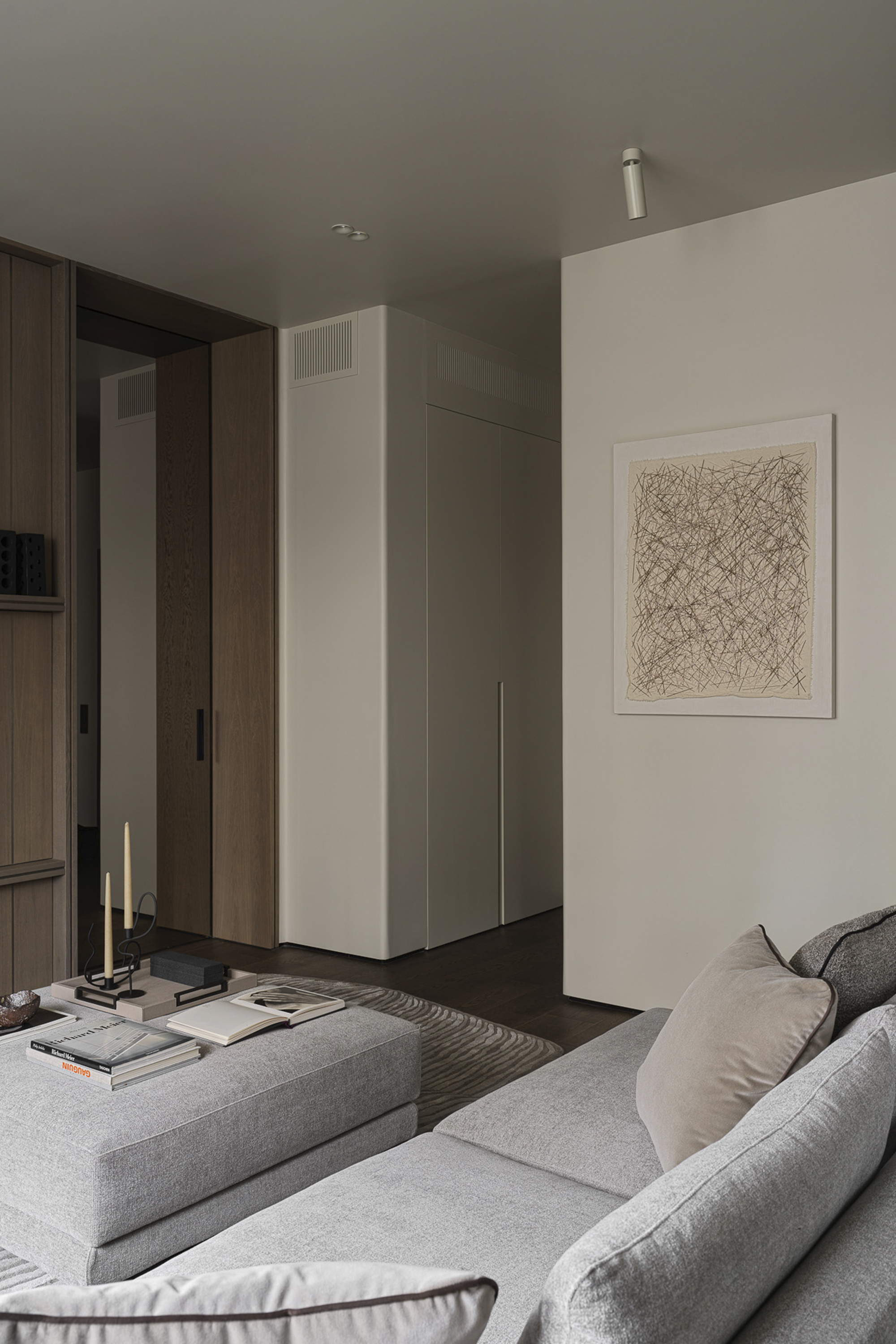 This apartment was designed for a male client who wanted a modern, minimalist interior with ample storage space—a strict yet comfortable home that would always feel welcoming.
