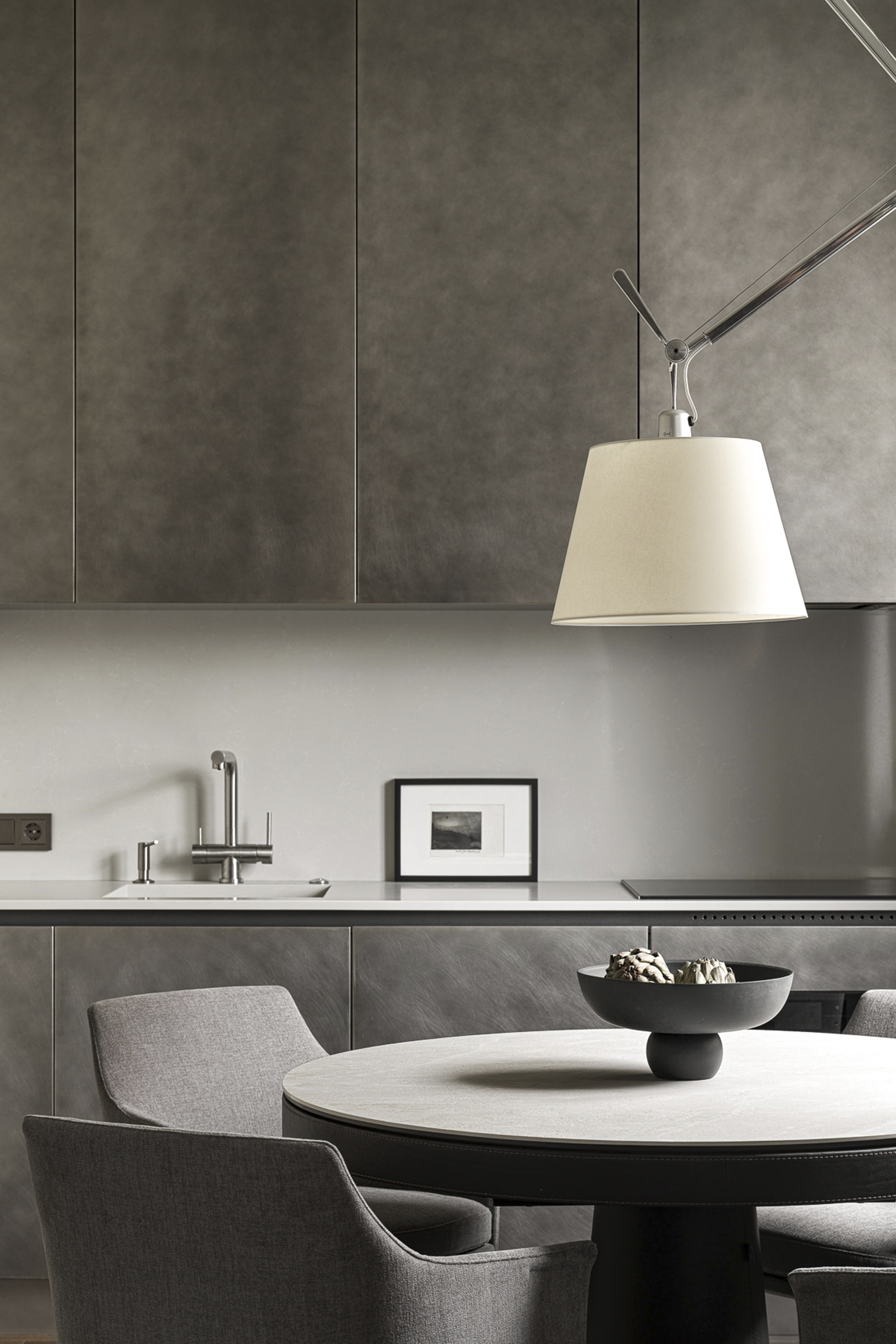 During the kitchen planning phase, it became clear that the client enjoys entertaining guests, necessitating a extendable dining table. This led to the selection of a mobile pendant light, capable of adjusting its position relative to the table’s center.