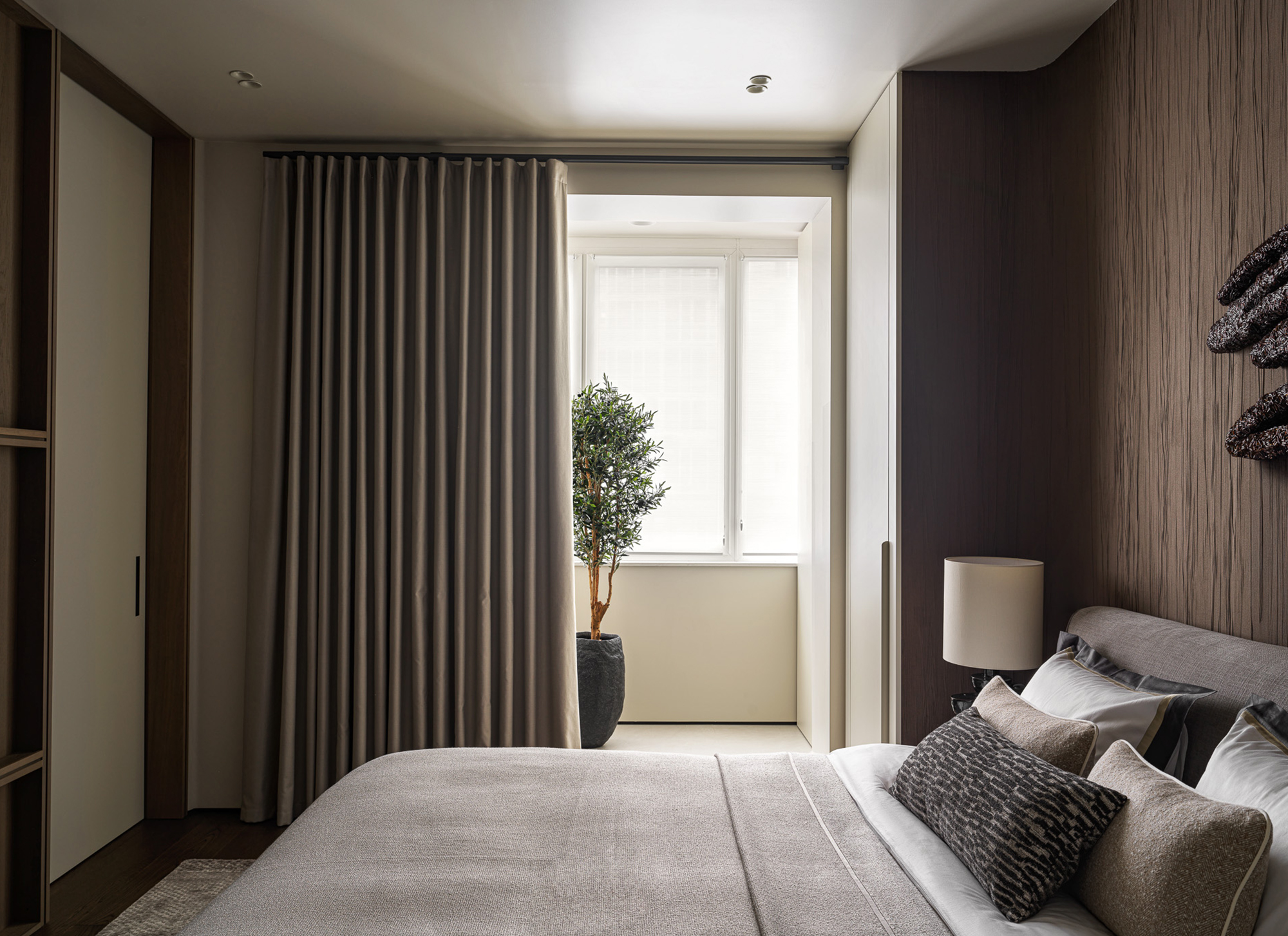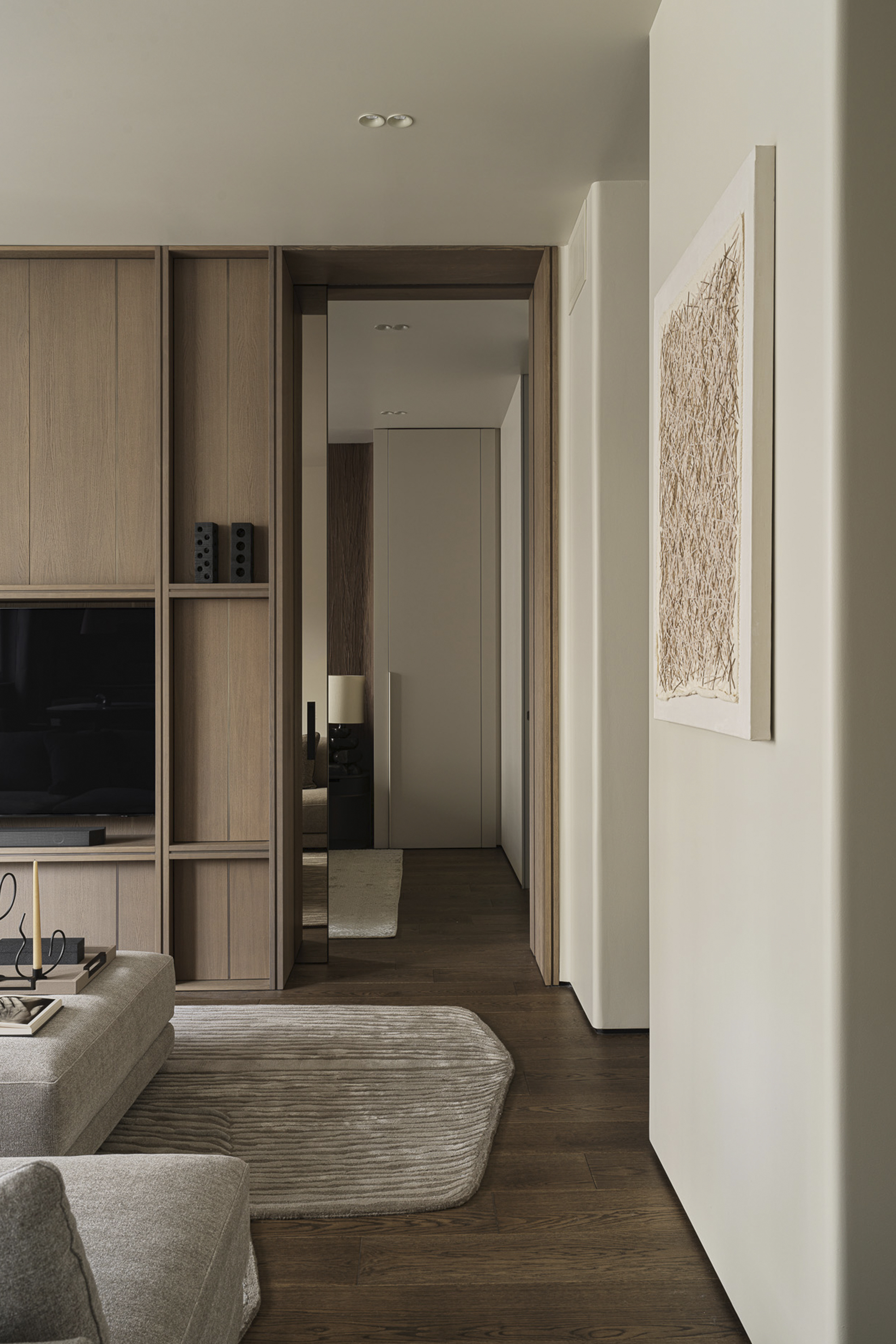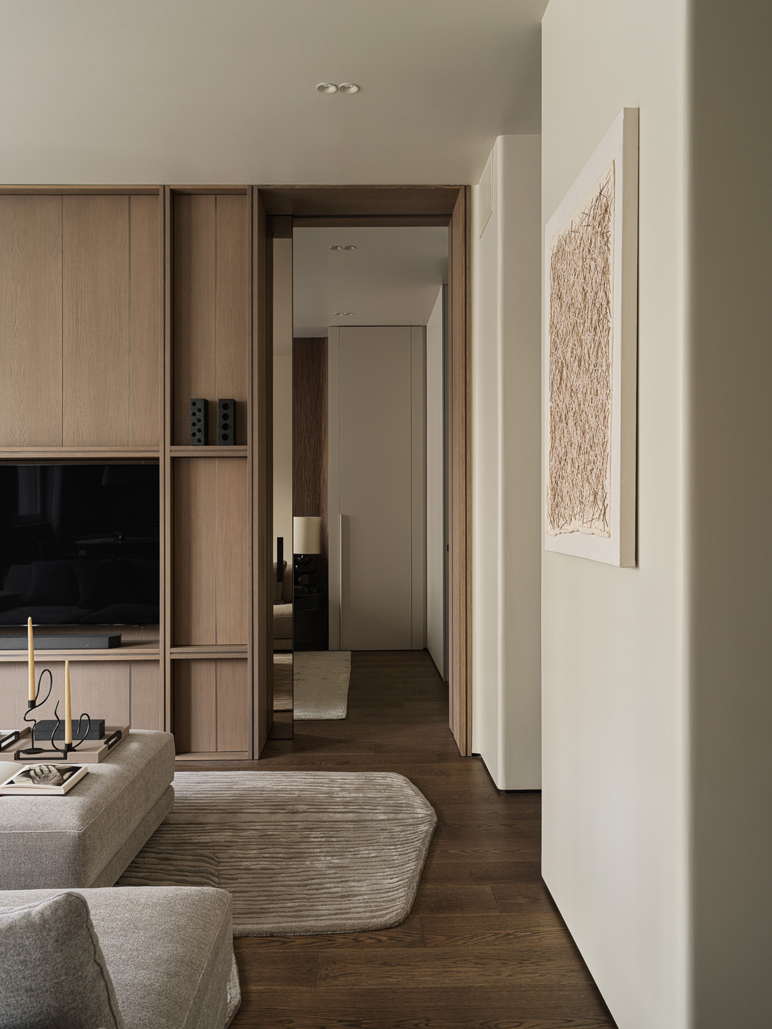 The TV unit separates the living room from the bedroom, while a mirror-clad pillar at the entrance divides the hallway. These elements create a circular flow, which always expands the perception of space—one of my favorite planning techniques.