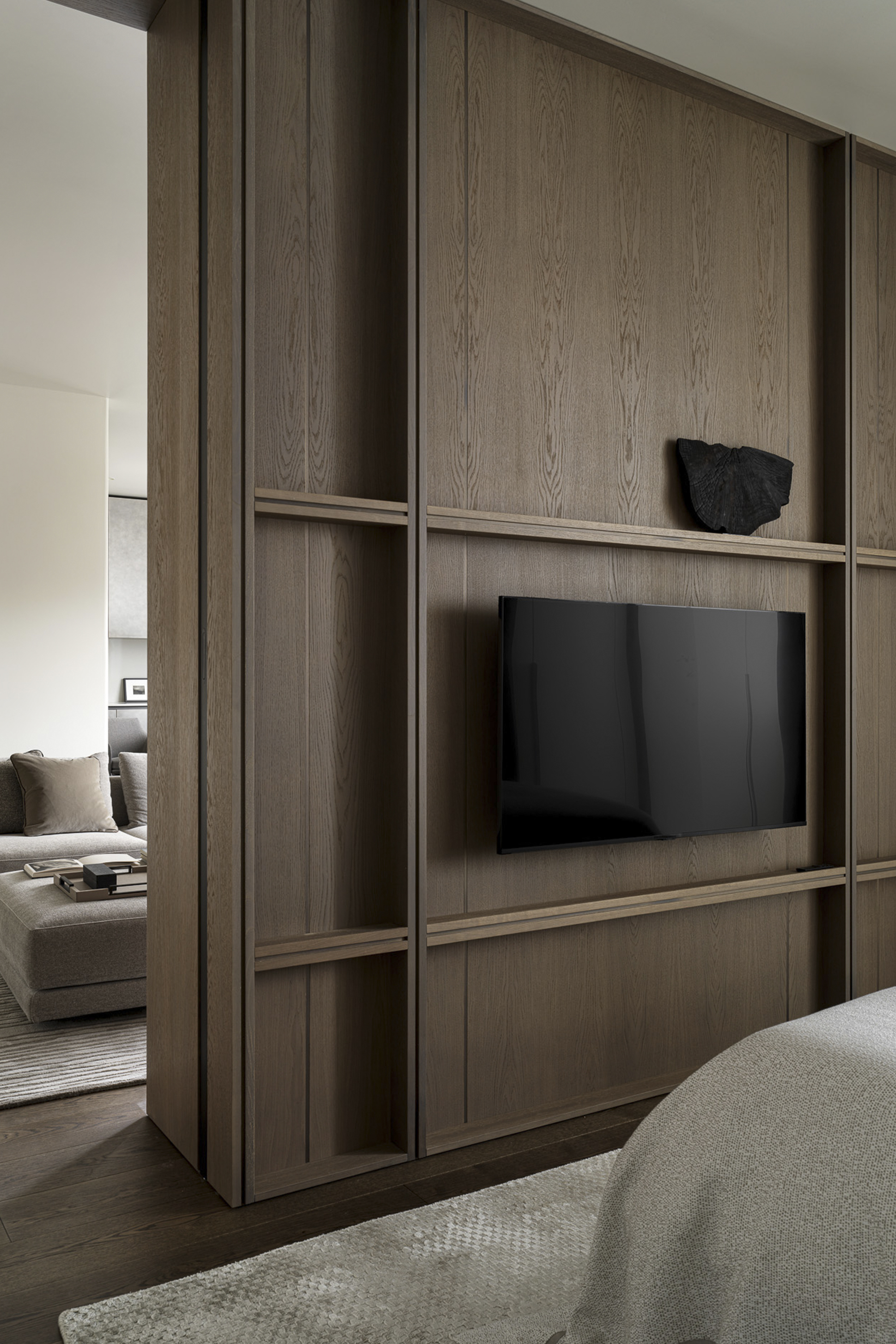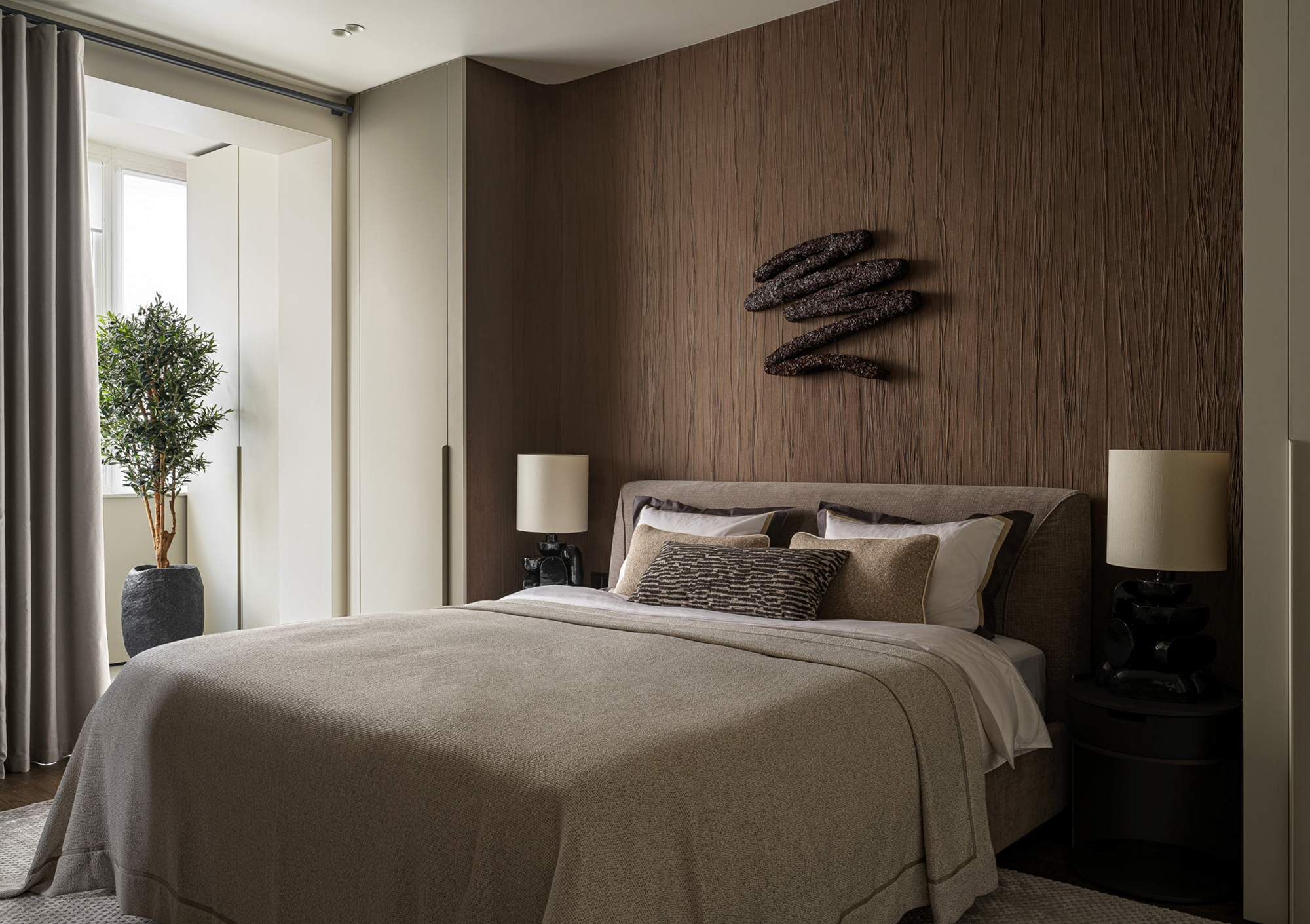 In the living room, the TV unit features hidden storage behind its facades, maintaining a visually light and uncluttered look.In the bedroom, the headboard niche is adorned with Belgian textile wallpaper, imitating suede and adding charisma to the space.