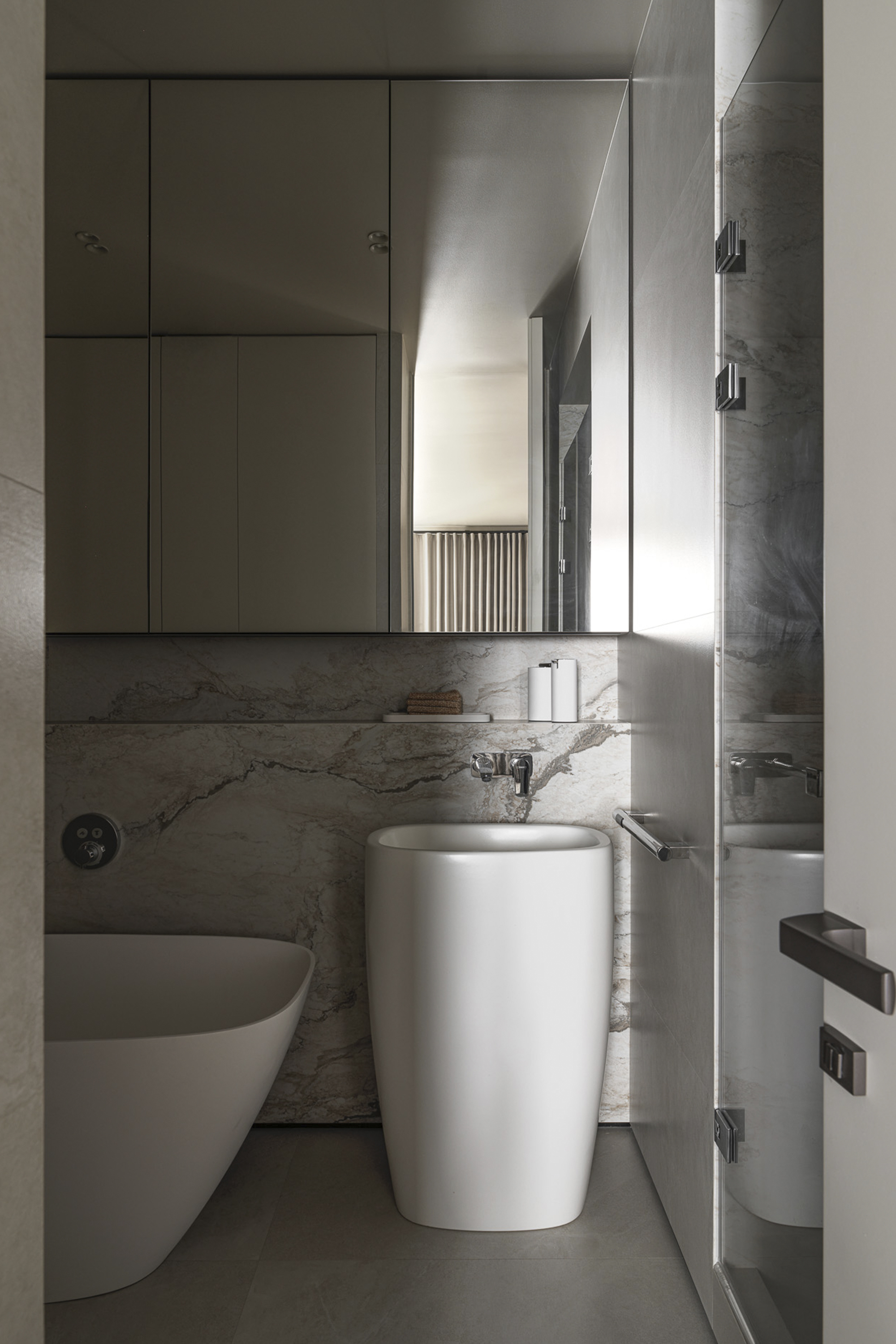 The apartment also includes a master bathroom with a freestanding bathtub and walk-in shower, a spacious walk-in closet, and a guest powder room.