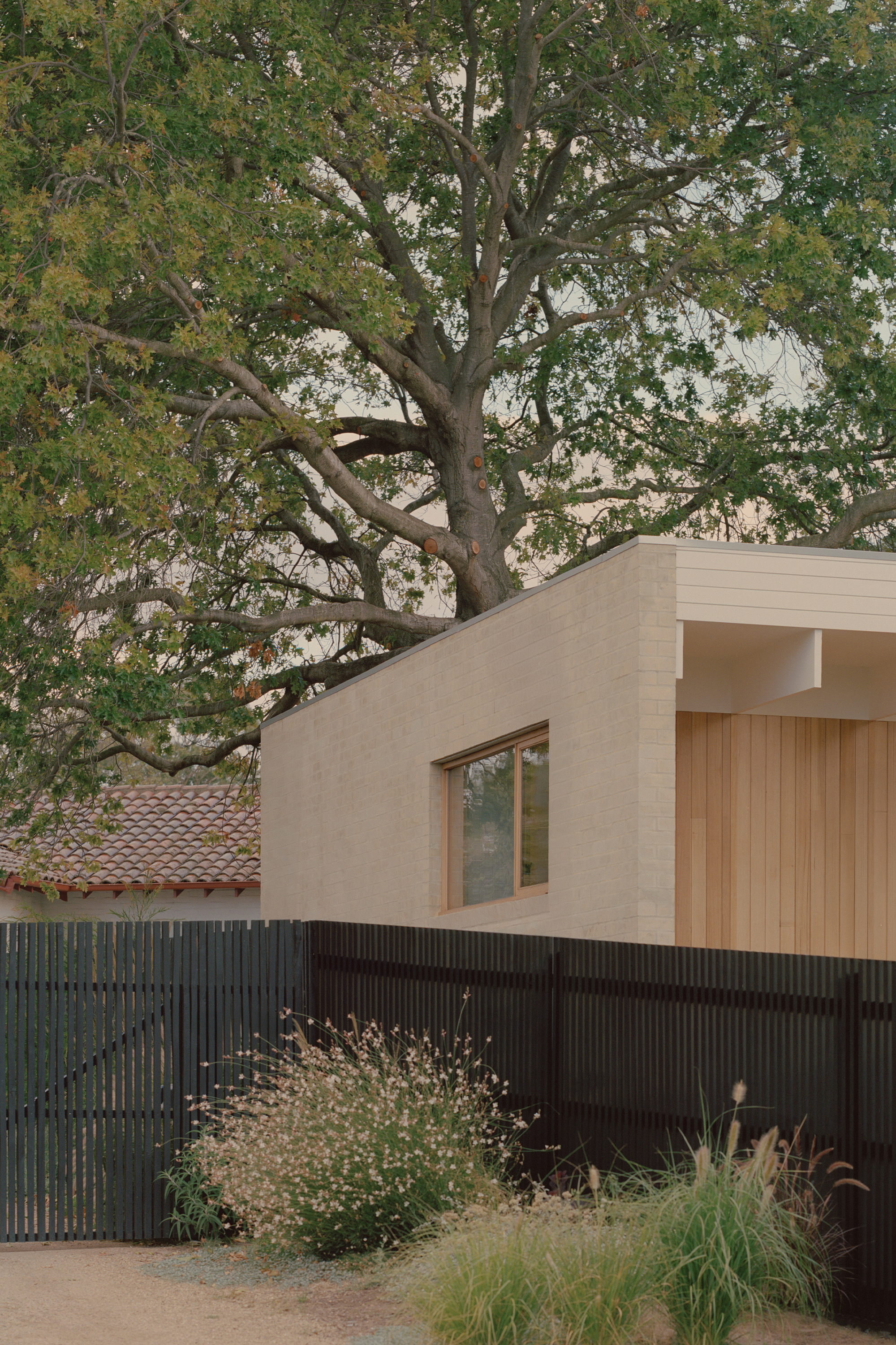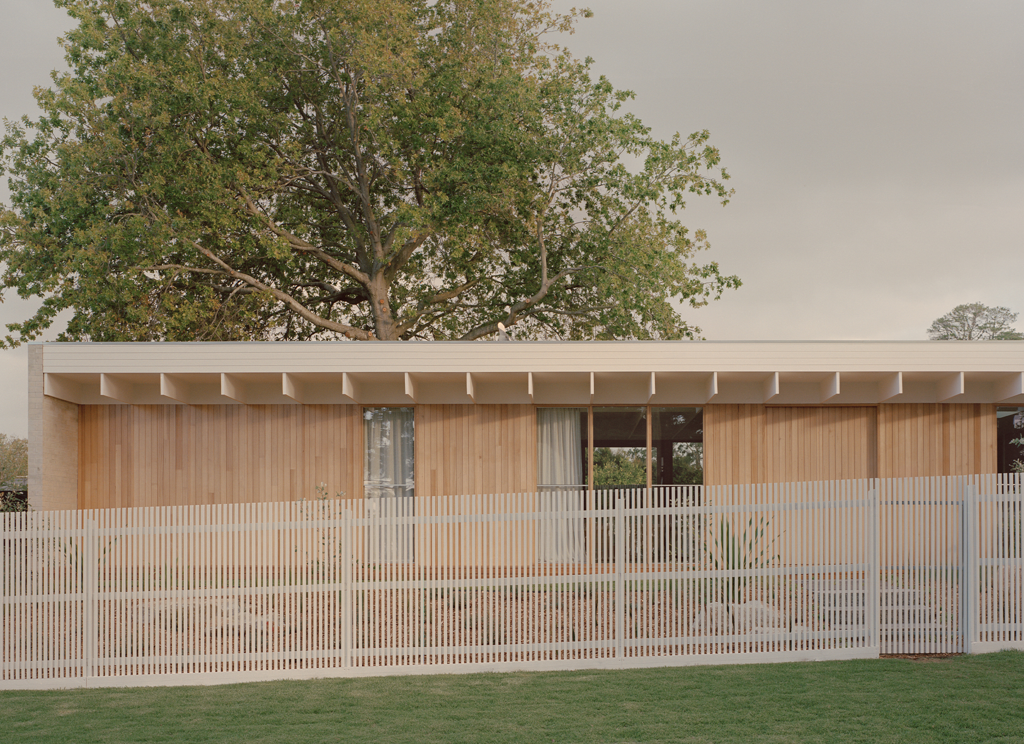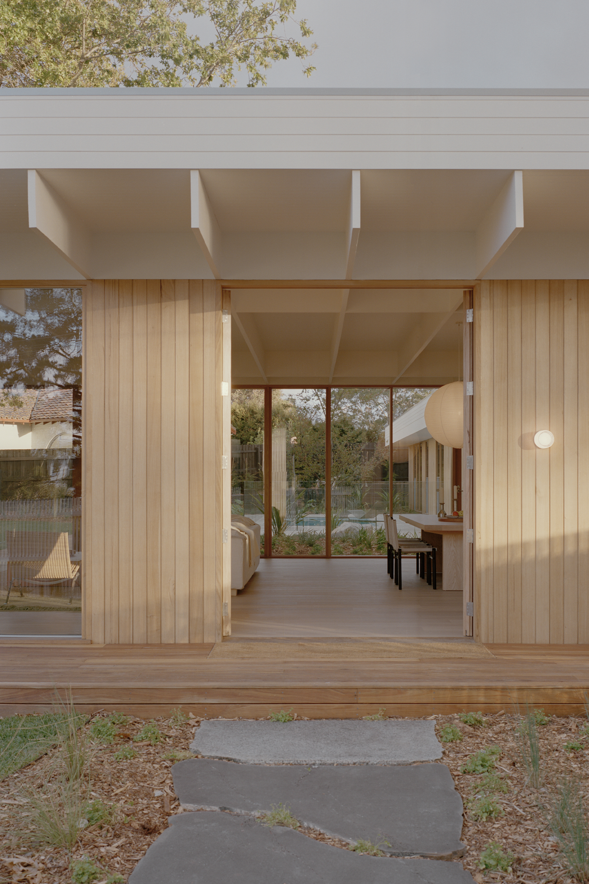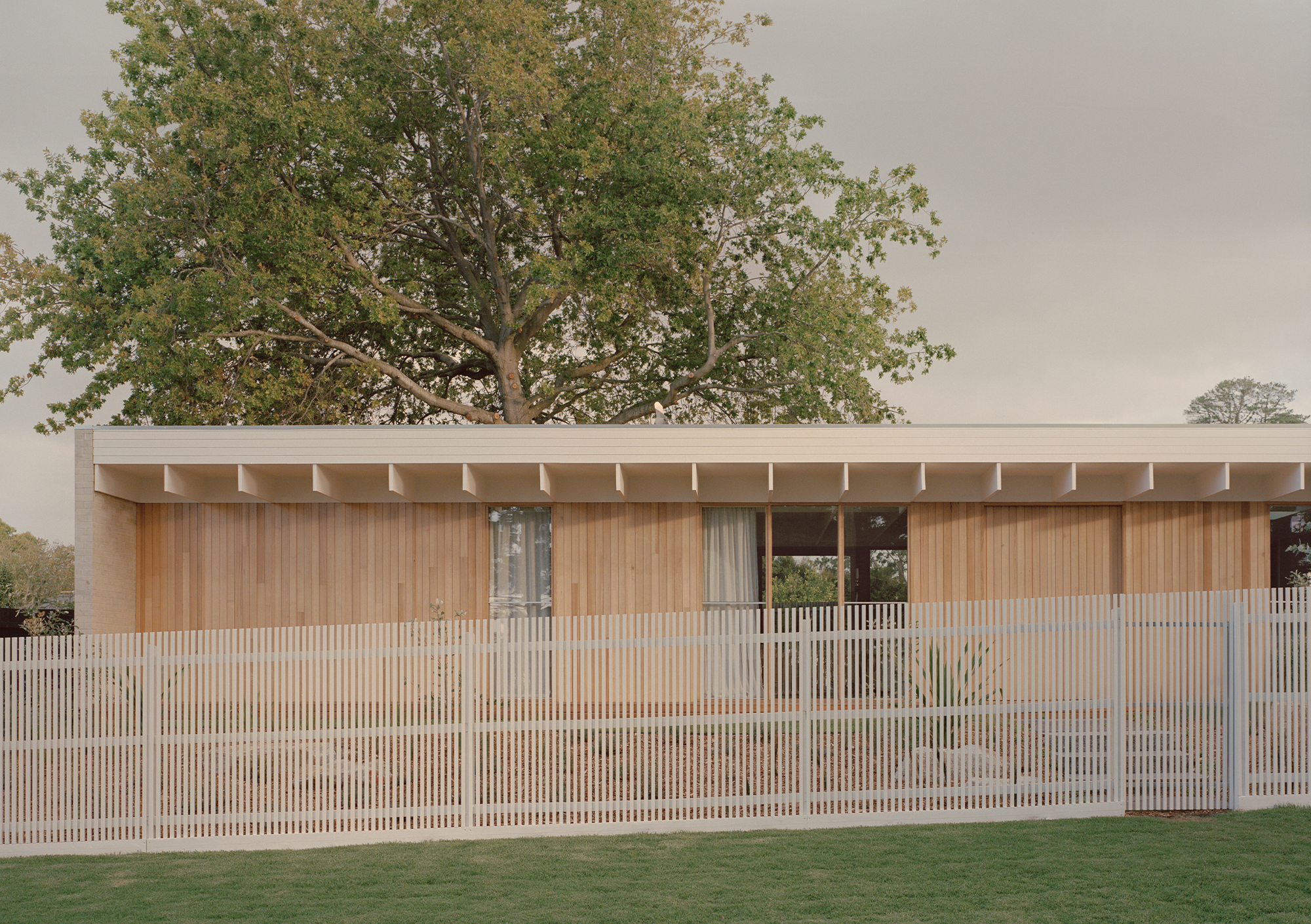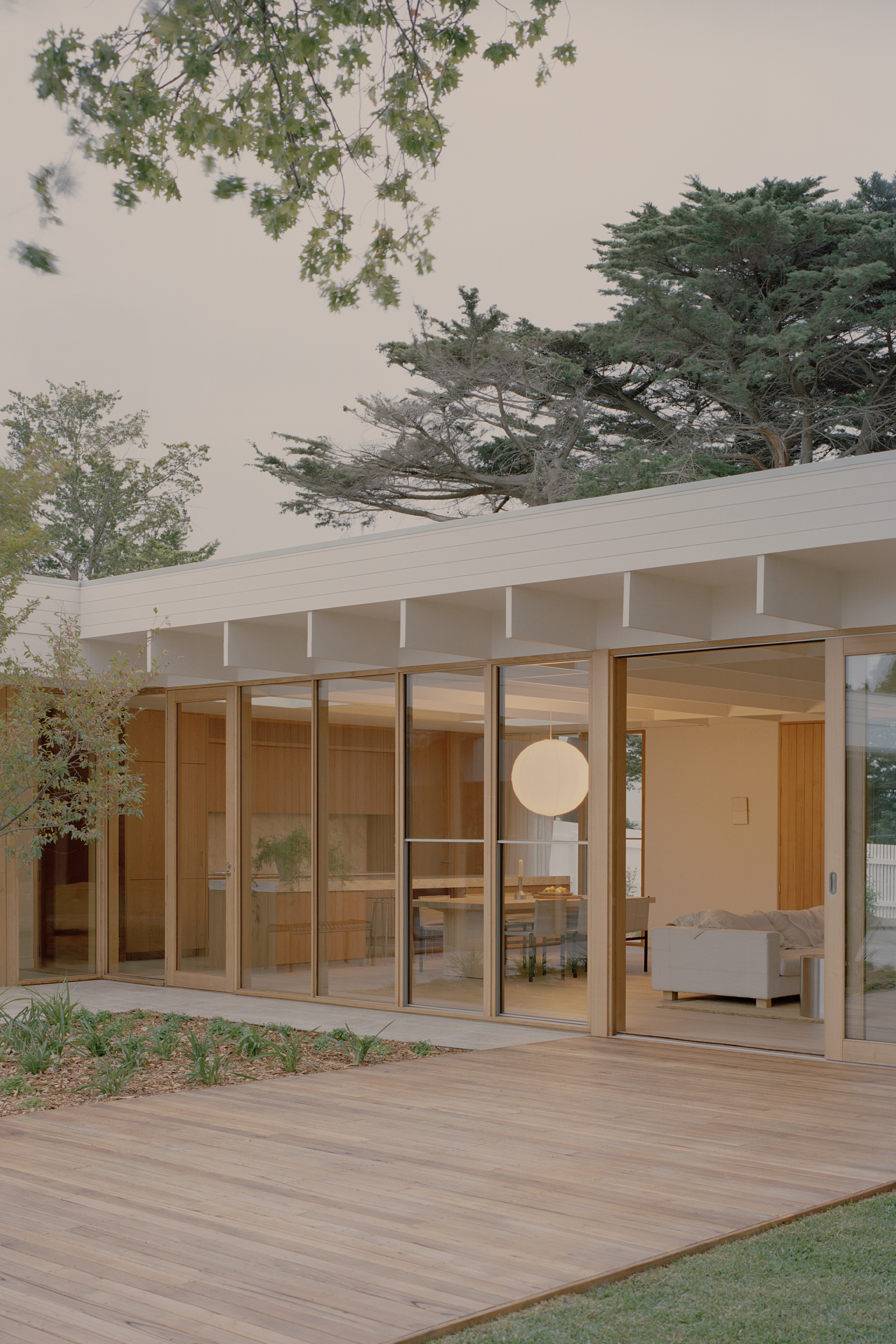 Mount Martha House is a cost-effective timber family home inspired by the vernacular of the Mornington Peninsula; a contemporary interpretation of Australian coastal architecture. Its L-shaped layout embraces an established pin oak tree, creating a private outdoor space with a pool and deck that integrates with the natural surroundings.