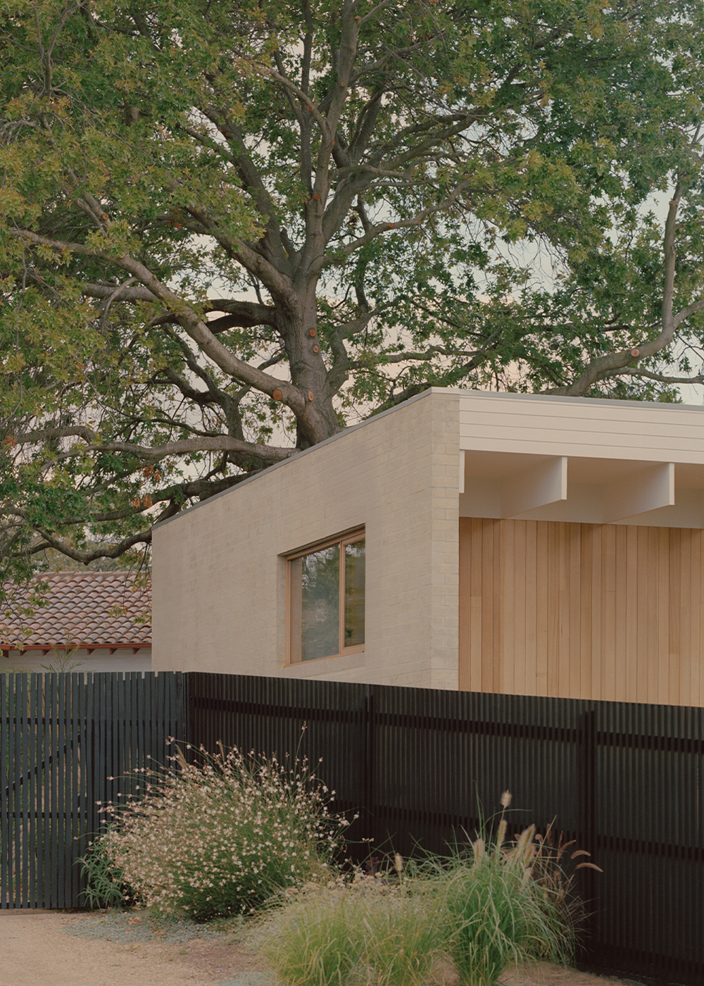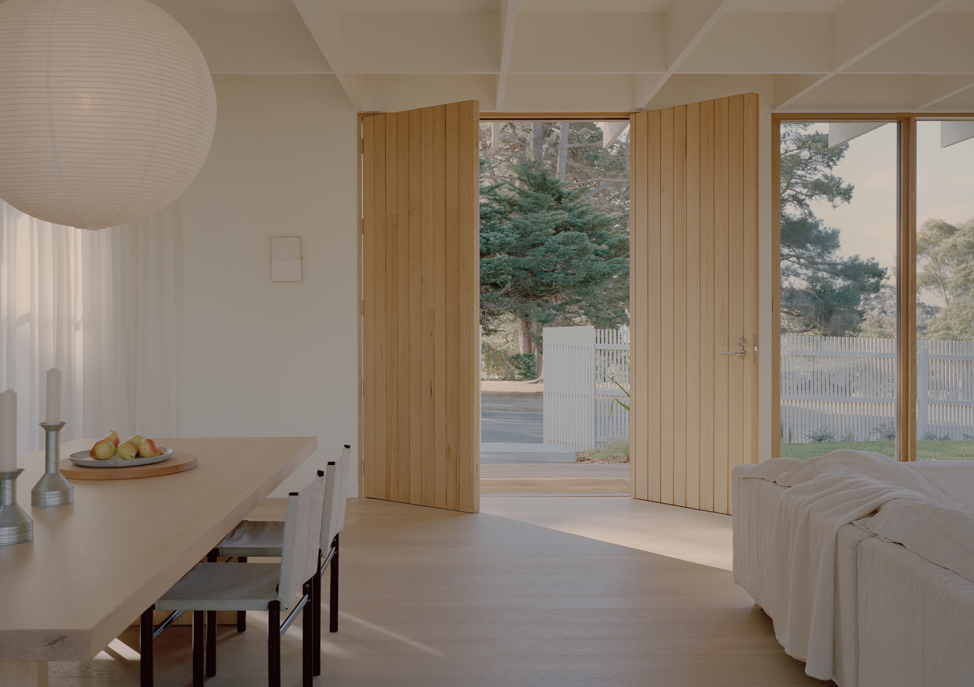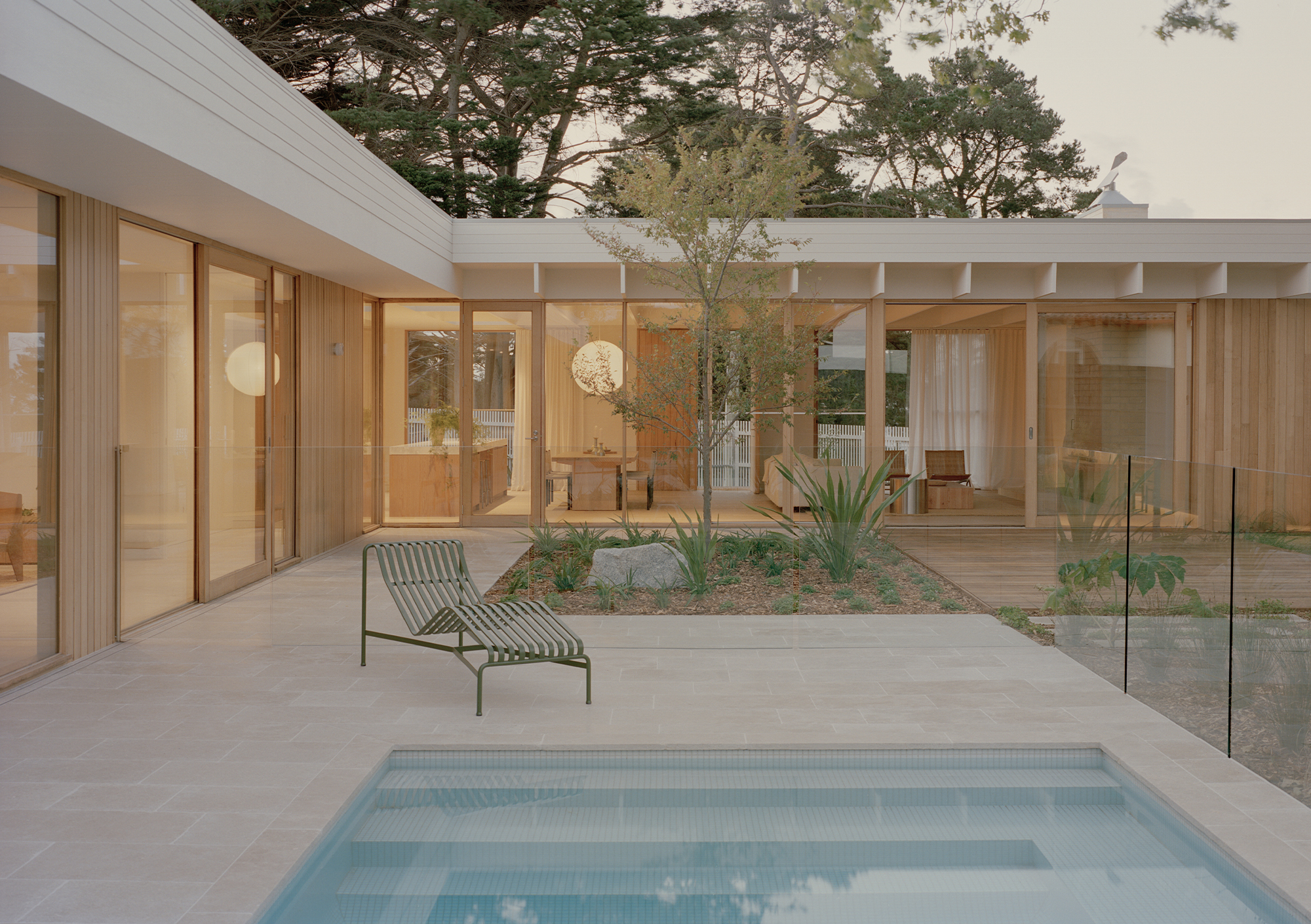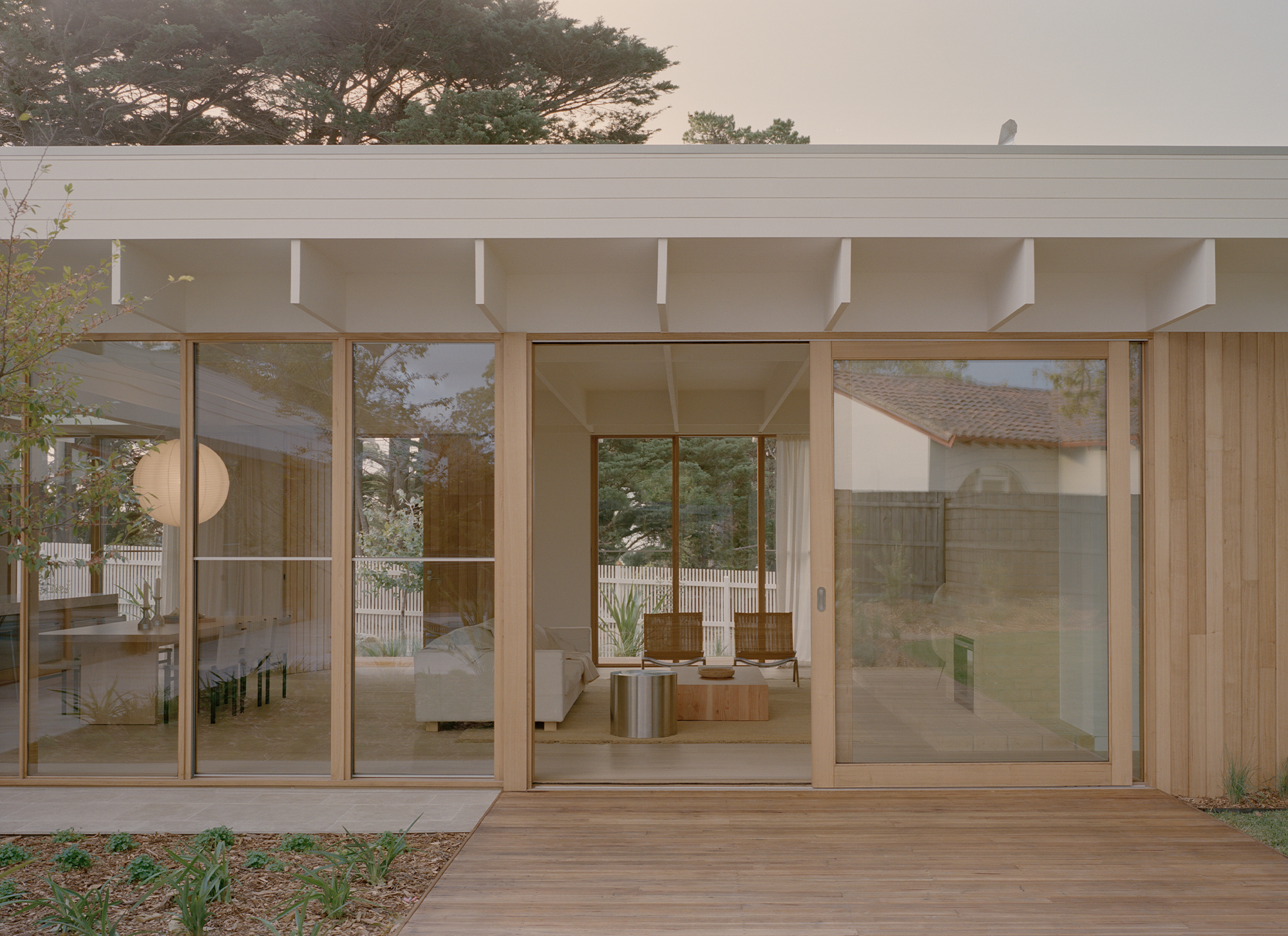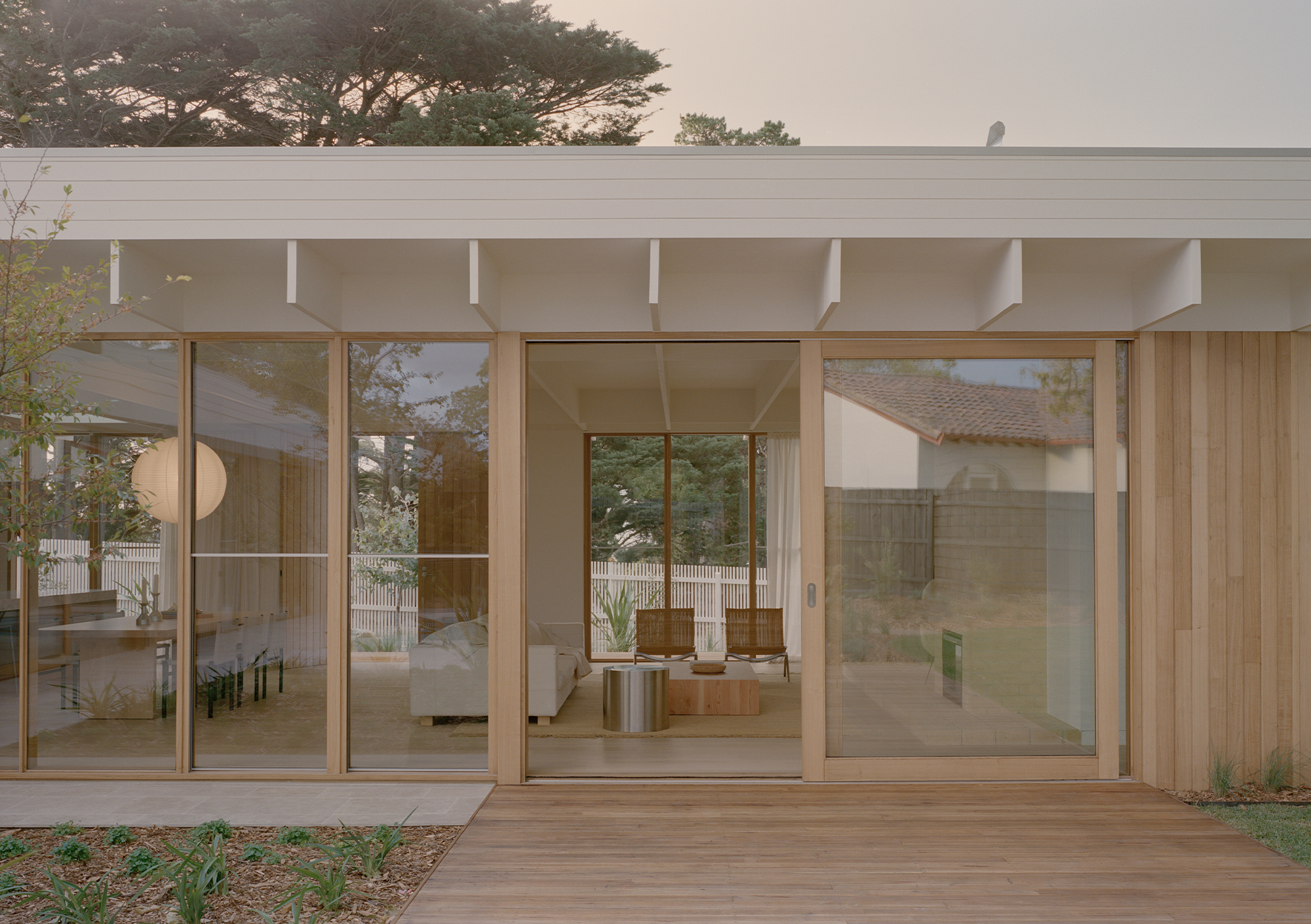 Mount Martha House is a cost-effective timber family home inspired by the vernacular of the Mornington Peninsula; a contemporary interpretation of Australian coastal architecture. Its L-shaped layout embraces an established pin oak tree, creating a private outdoor space with a pool and deck that integrates with the natural surroundings.