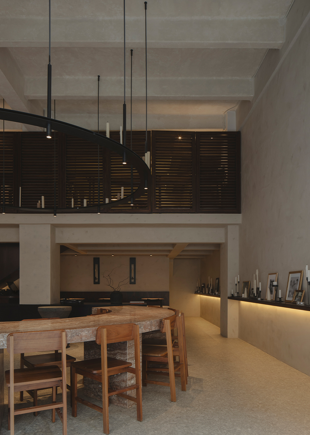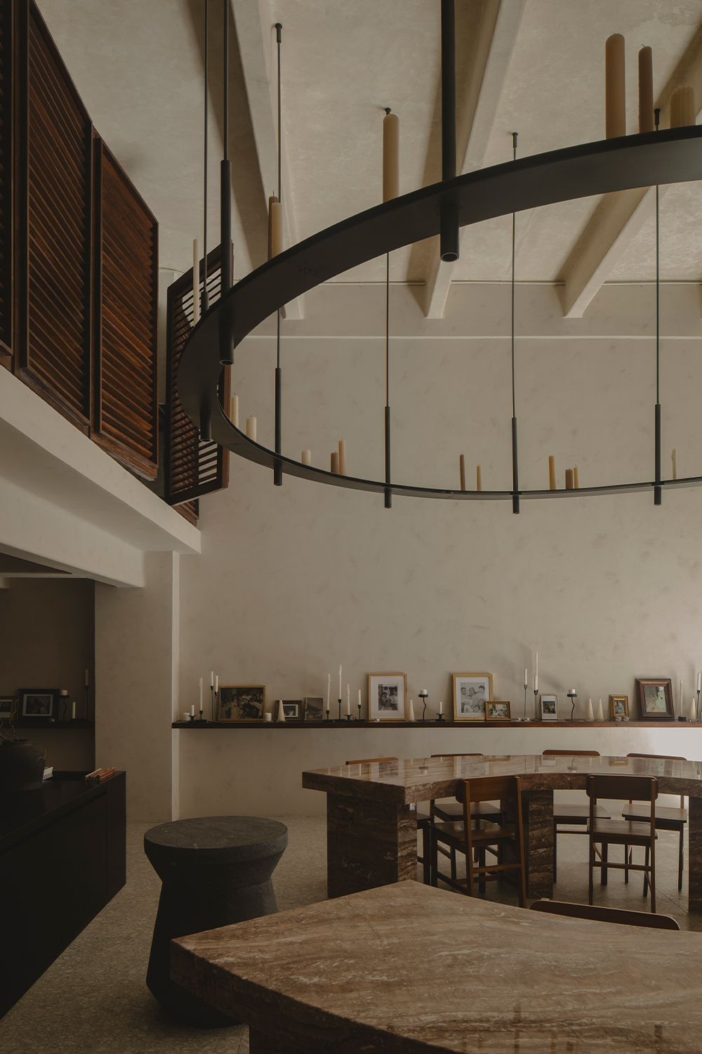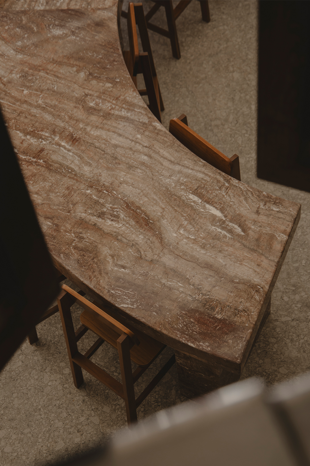 The central table is both sculptural and symbolic, it organizes the space. Around it a stone totem and a metal light structure reinforce the verticality, the ritual character of the project. Brass detailed walls and stone accent lighting follow the path and the whole. Furniture and tableware extend this idea. Designed and selected with the same criteria they expand the concept of containment and hospitality to every detail. Wood supports, stone grounds, light softens.