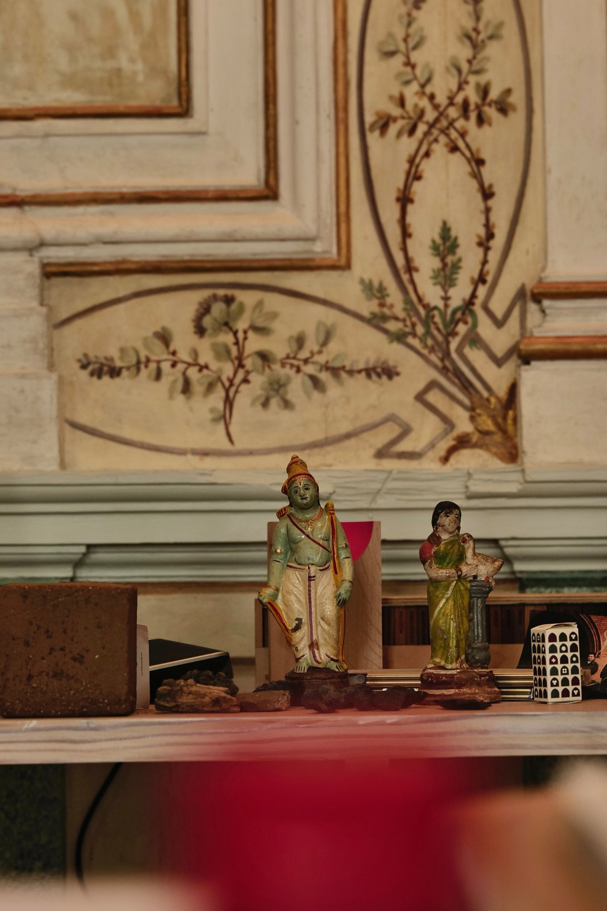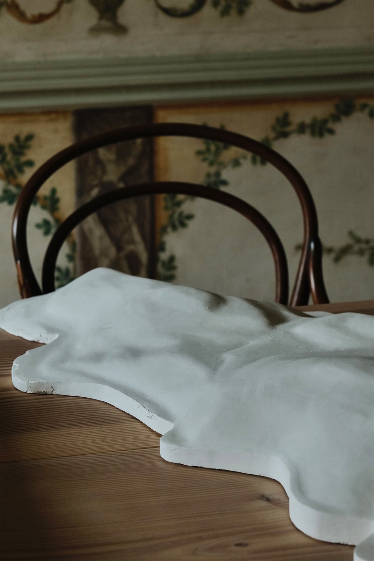 The “Noble Room” on the second floor feels like the building’s temporal heart. We instinctively held our breath, immersed in the meeting of minimalism and historical ornament. Beneath the ornate plaster ceiling, oval frescoes still shimmer with the idealized light of nobles and angels. Restored tile skirting and wall panels have regained their quiet radiance. Modern, pared-back furniture sits comfortably among 18th-century details, without dissonance. Minimalism sharpens the historical textures; history in turn deepens the clarity of the contemporary. The dialogue across time is serene yet powerful, and every line and surface seems infused with an enduring elegance.