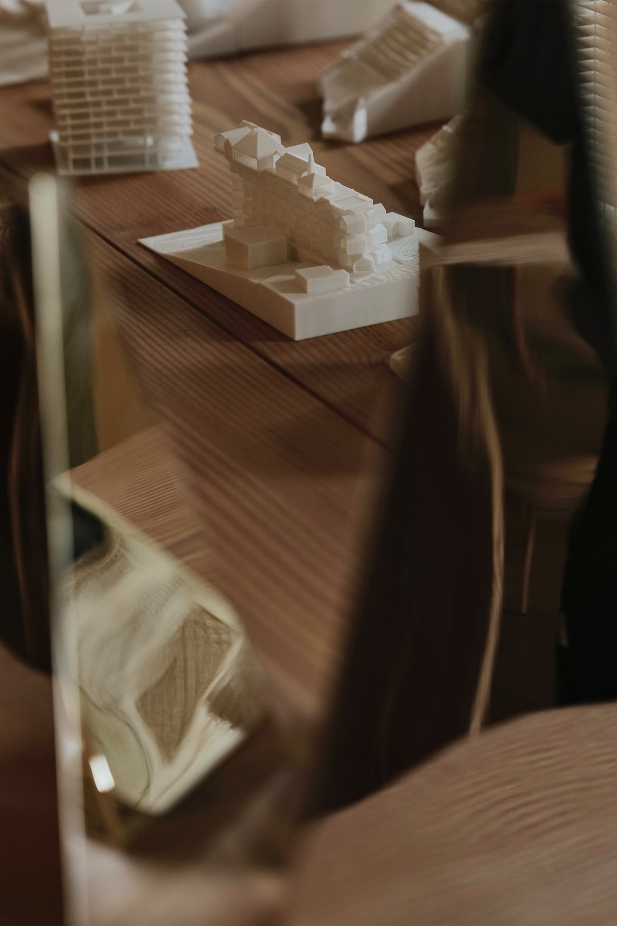 Descending into the dedicated model room, we entered a space where ideas transform from abstraction to form. Every model is crafted in-house—never outsourced—because Manuel must be able to return to a project’s earliest physical expression, tracing the origin of an idea or testing new proportions. From rough massing studies to finely finished exhibition-grade sections, models are sometimes printed vertically to minimize layer lines, allowing the “traces of technique” to quietly disappear. Here, models are not final products but instruments—tools that invite continual return to the beginning and ongoing recalibration.