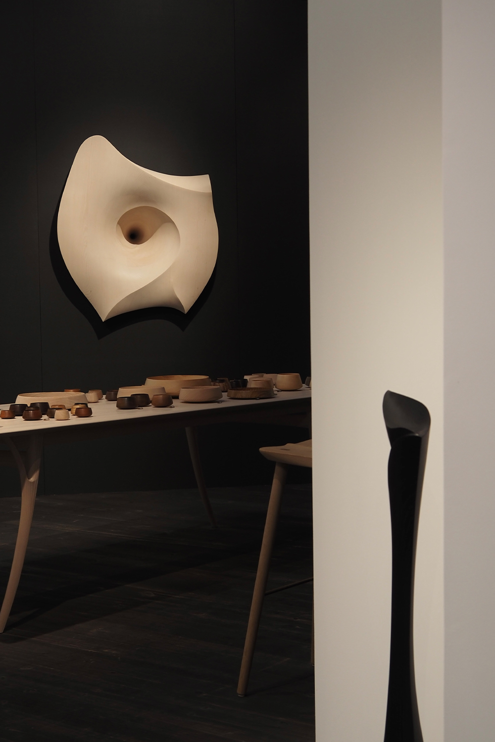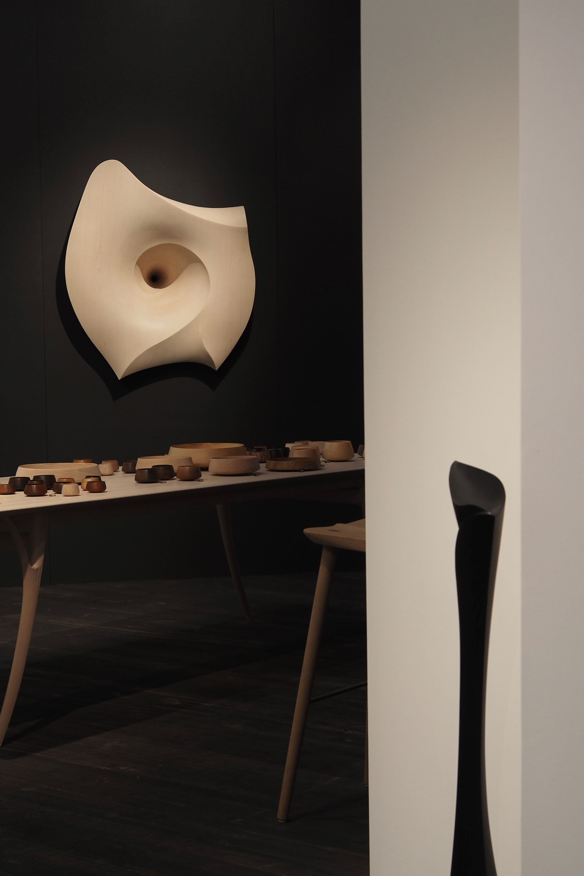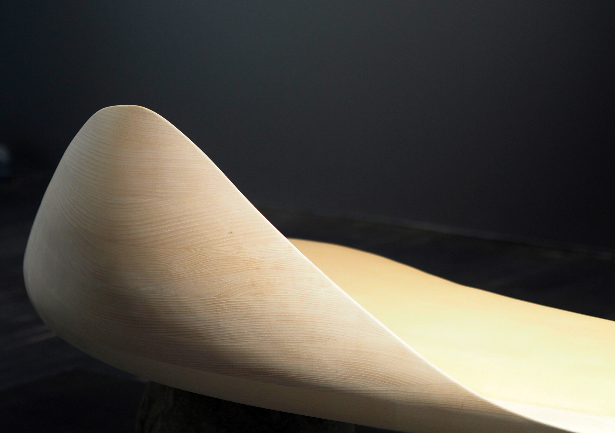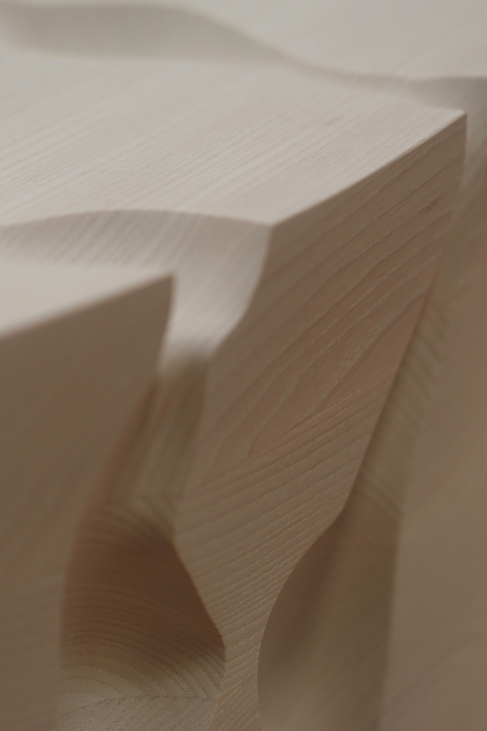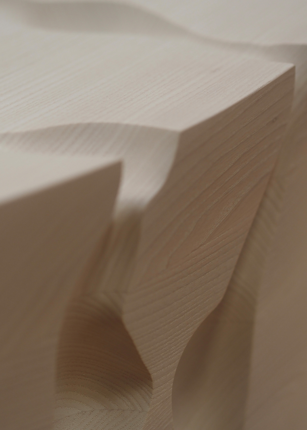 Turning around, Mette introduced us to "ICE"—their most innovative experimental sculpture-furniture series to date. Its inspiration comes from the harsh ice scenes of Danish, Swedish, and Norwegian winters, while the material used is Danish ash wood, also native to the Nordics. The form and flow of glaciers are translated into the tranquility and softness of wood; the texture of ice layers finds continuity in the tree rings and wood fibers.