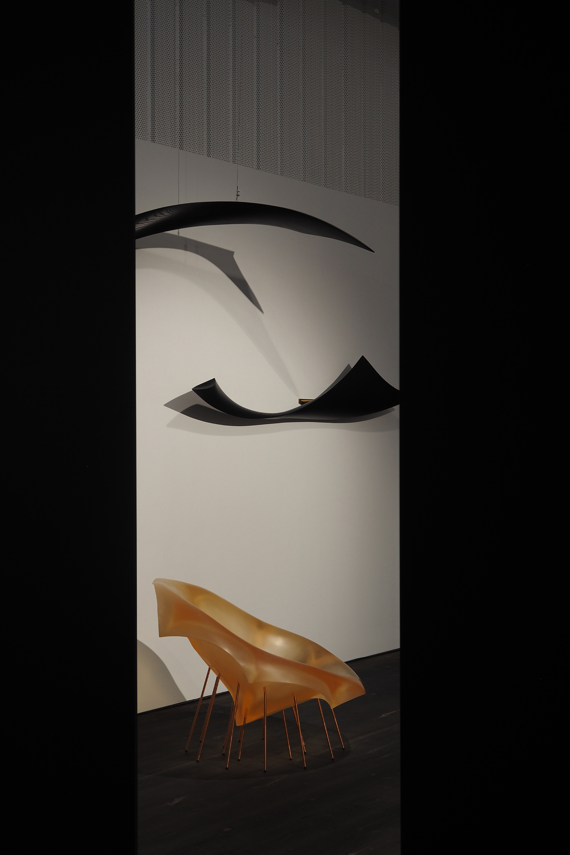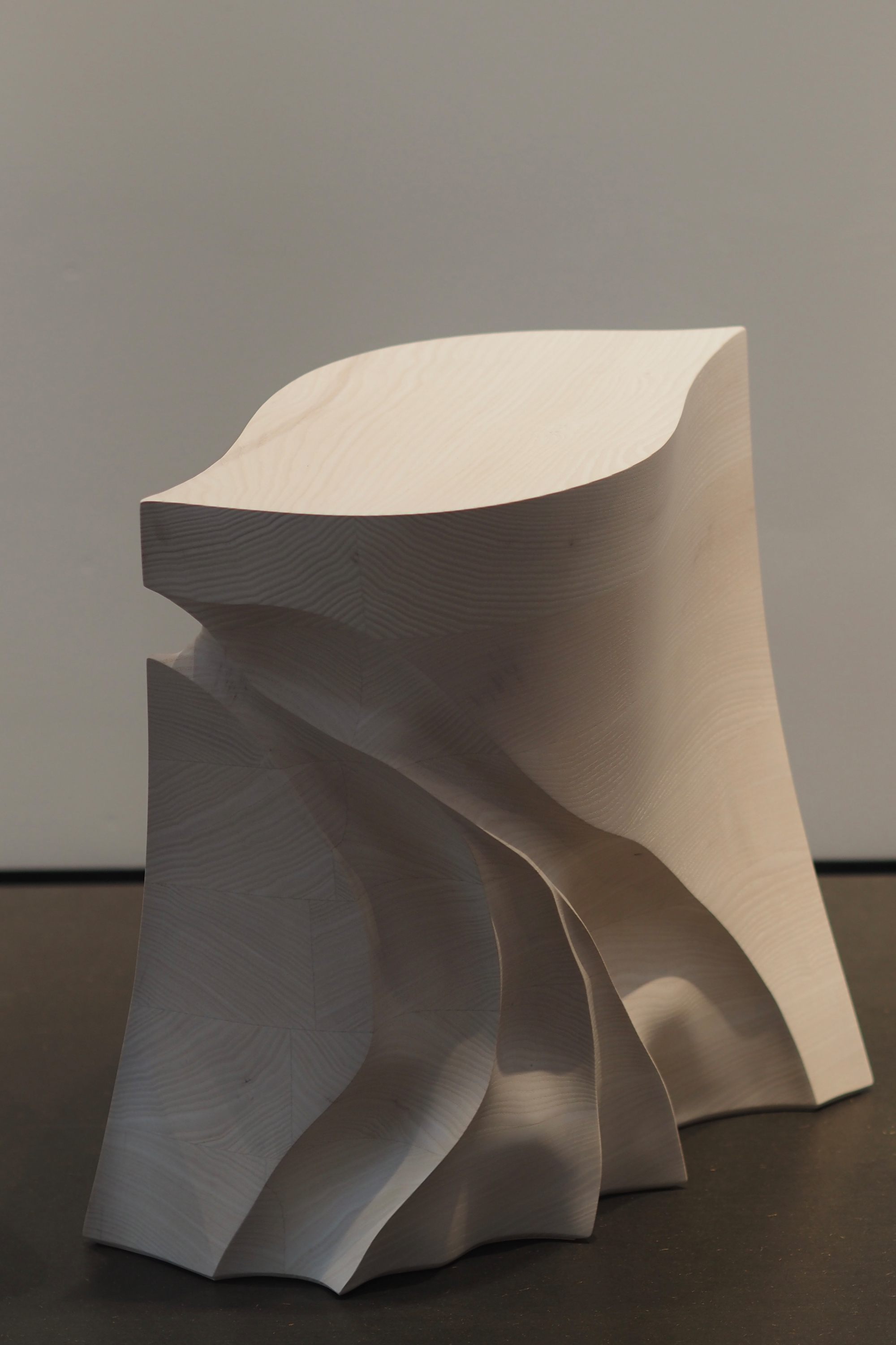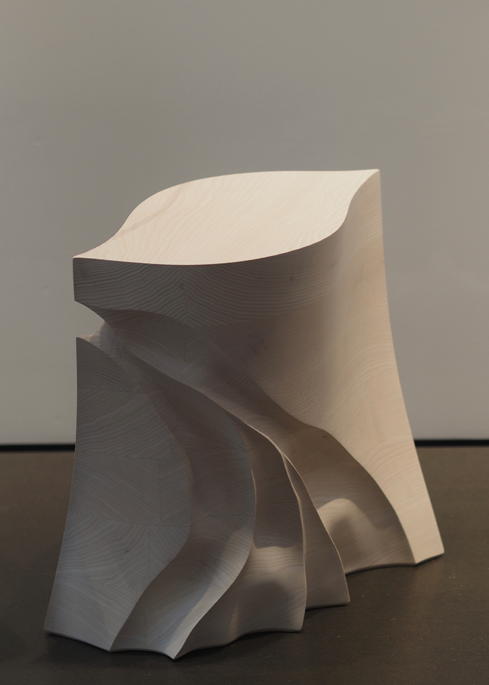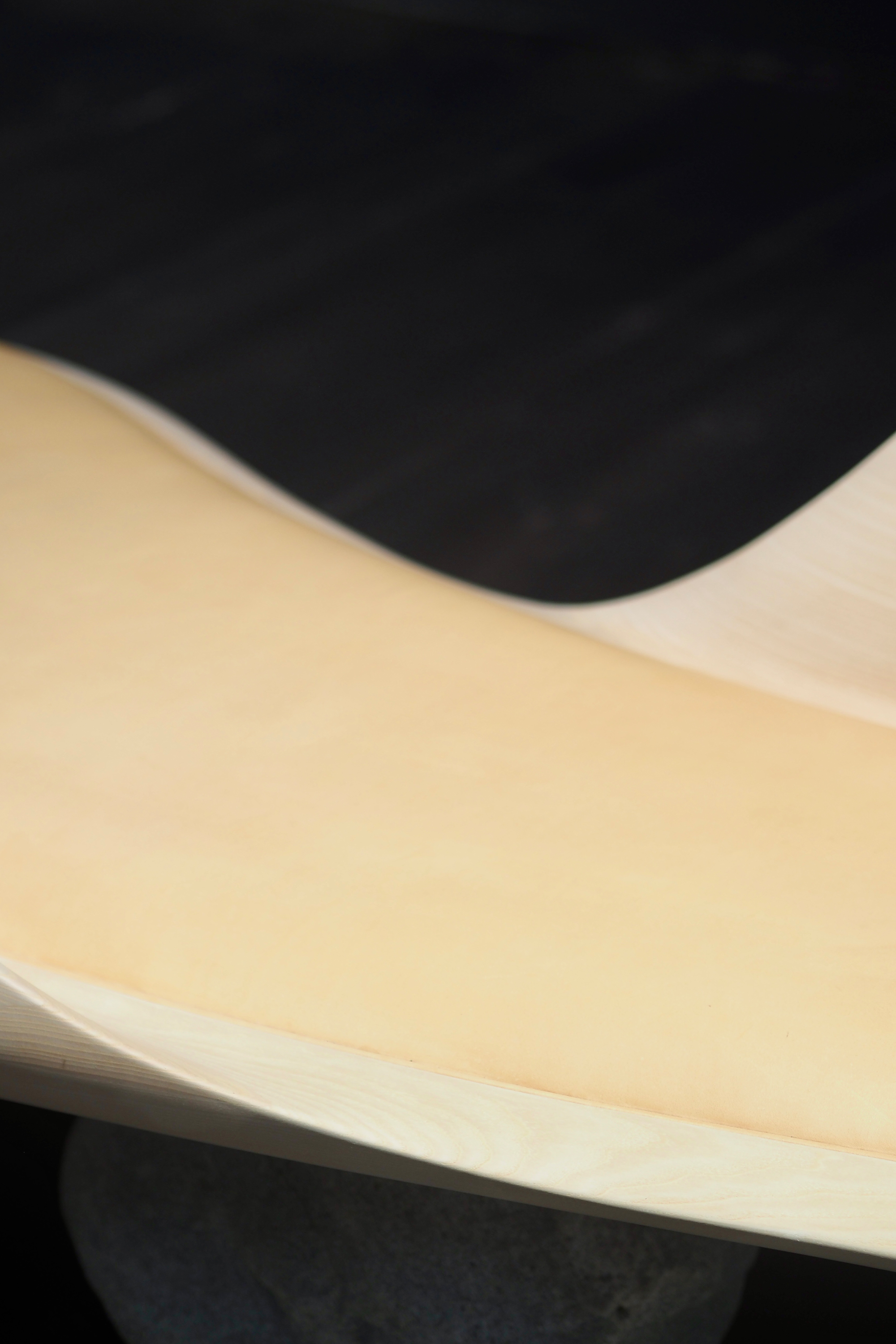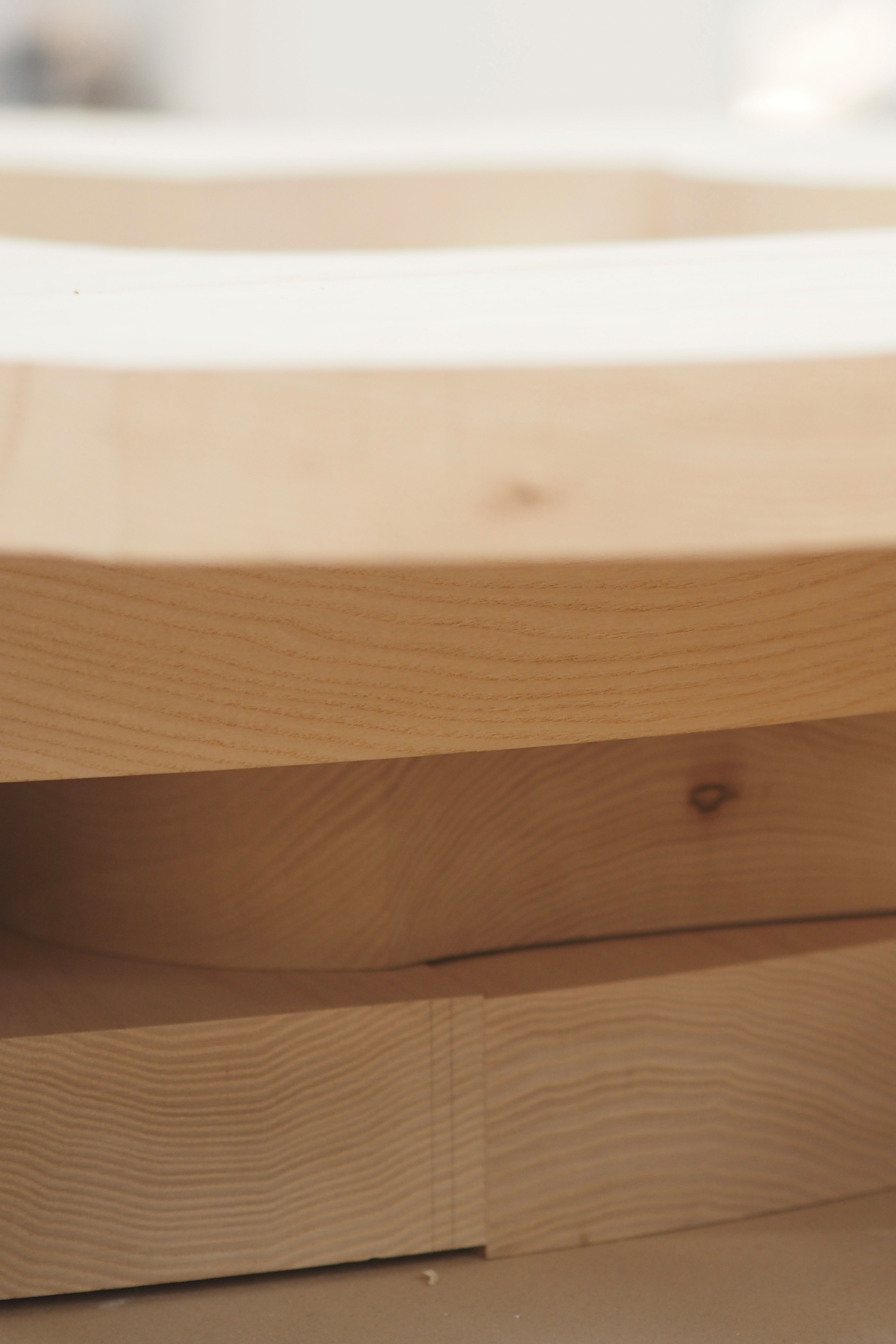 Turning around, Mette introduced us to "ICE"—their most innovative experimental sculpture-furniture series to date. Its inspiration comes from the harsh ice scenes of Danish, Swedish, and Norwegian winters, while the material used is Danish ash wood, also native to the Nordics. The form and flow of glaciers are translated into the tranquility and softness of wood; the texture of ice layers finds continuity in the tree rings and wood fibers.