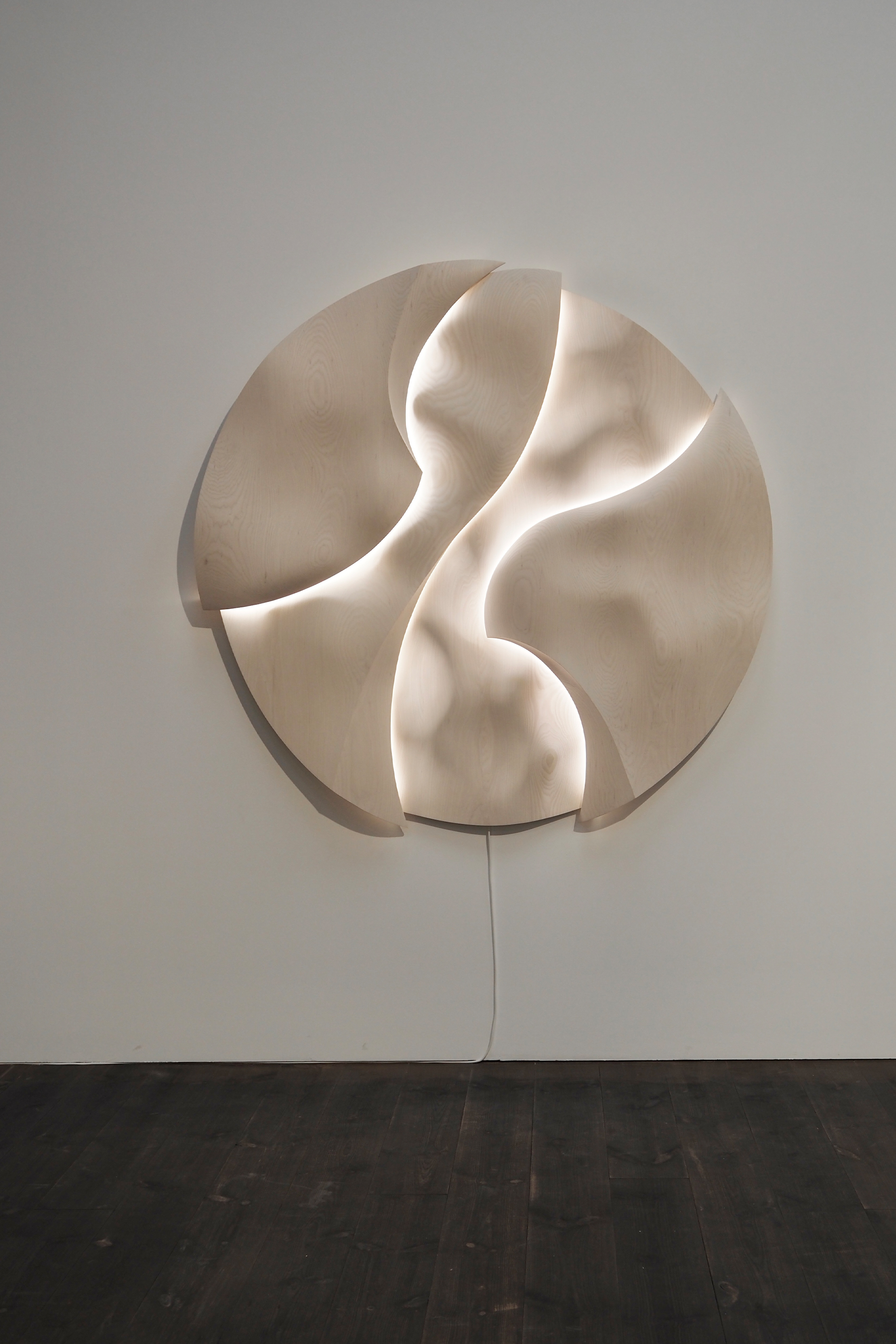 Following Mette's guidance, we first paused before "Måne" on the wall. This sculpture, resembling the moon, uses its warm wood grain and traces of handcraft to outline the unique contours and breath of each lunar phase. Soft light emanates subtly from within, flowing through the wooden texture like a lunar halo, a dialogue between the tangible and intangible, serene and profound.
