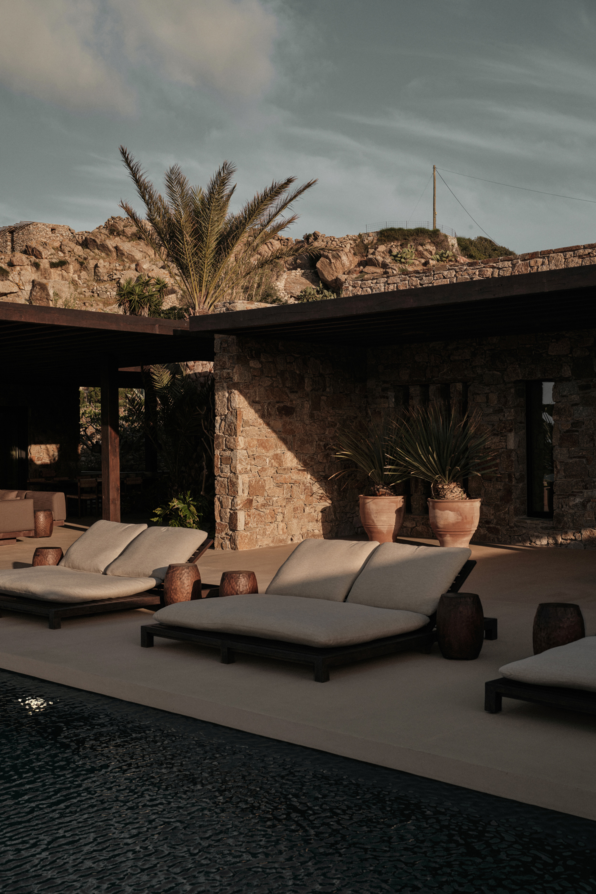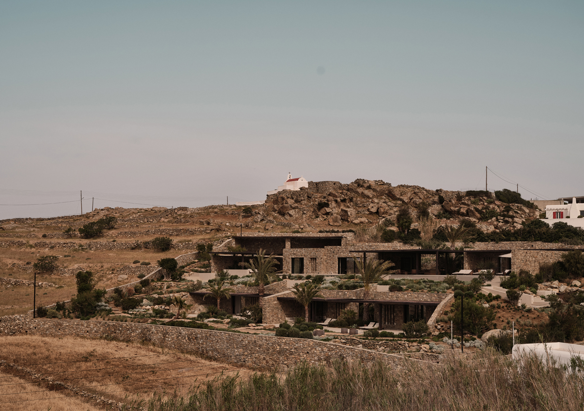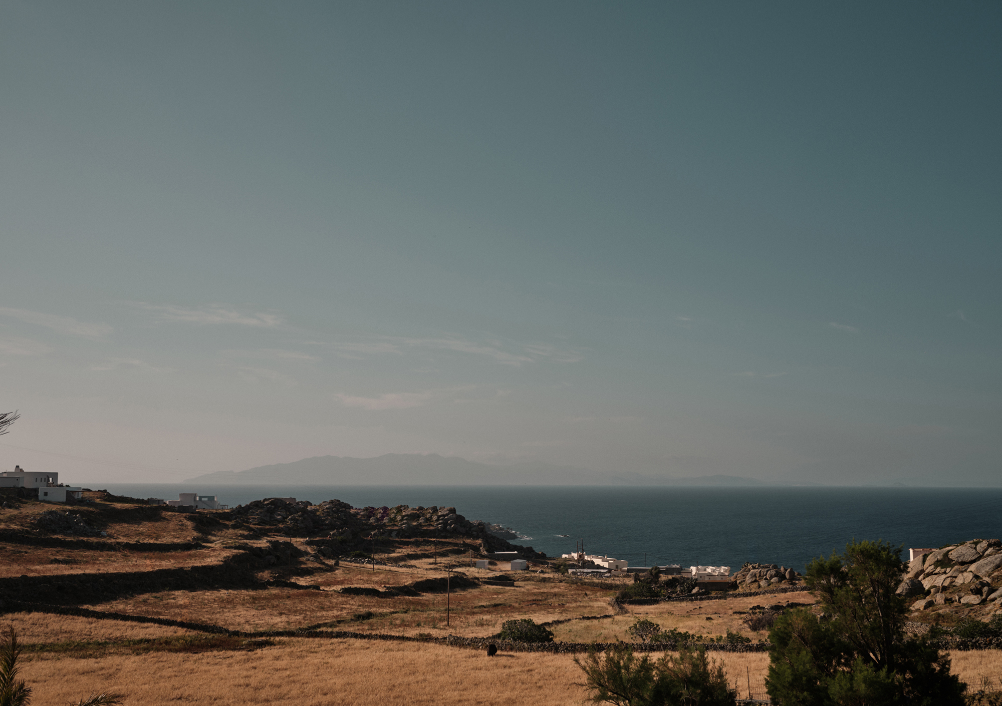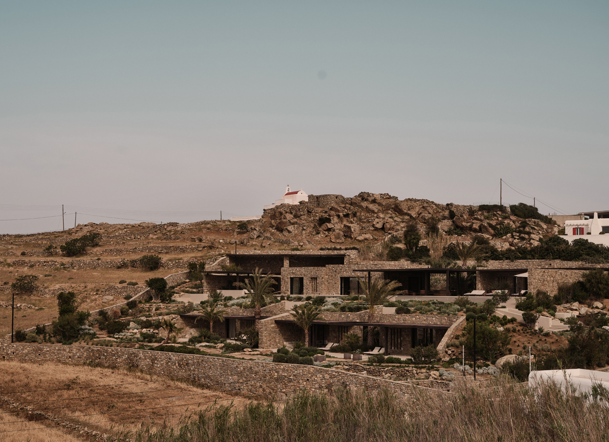 En Kyanó—its name comes from a singular shade of blue in the Greek language. It rests quietly along the sun-drenched slopes of Mykonos’ southwest coast, revealing itself unhurriedly—through rough stone, softened plaster, and the slow, liquid drift of light.