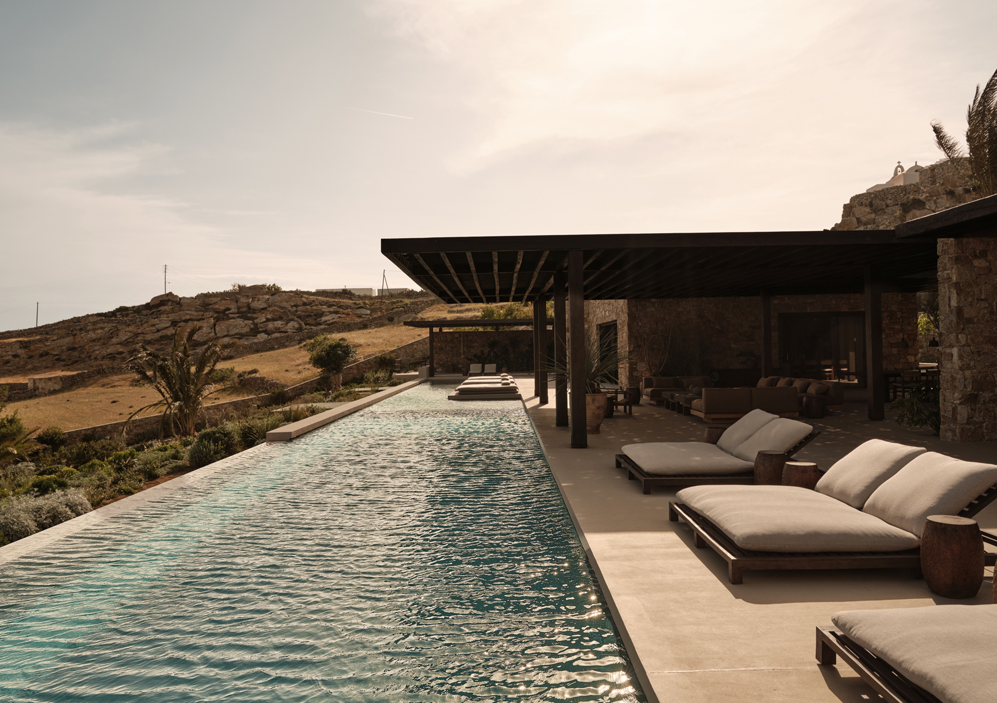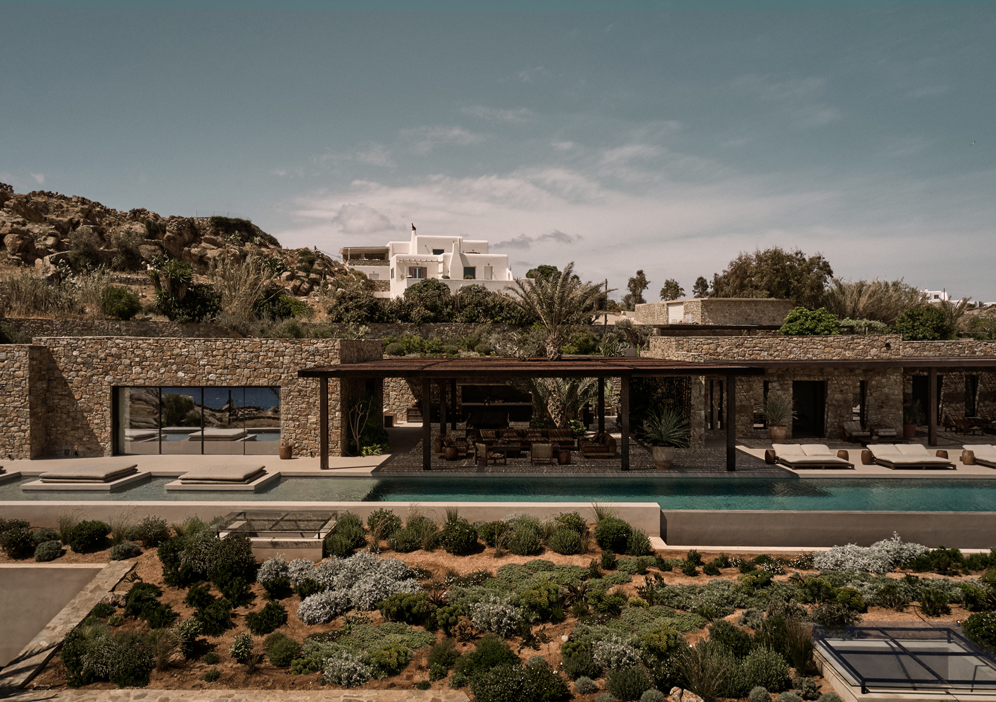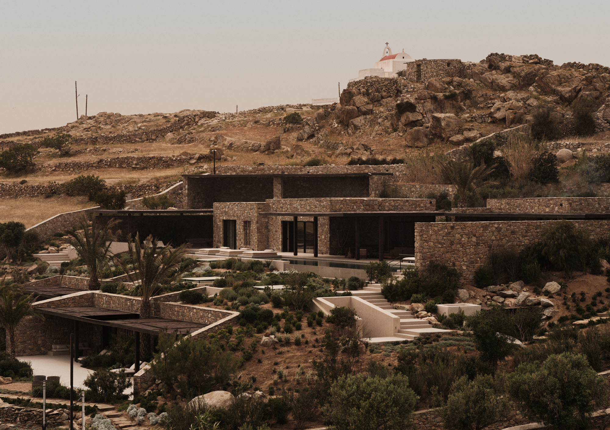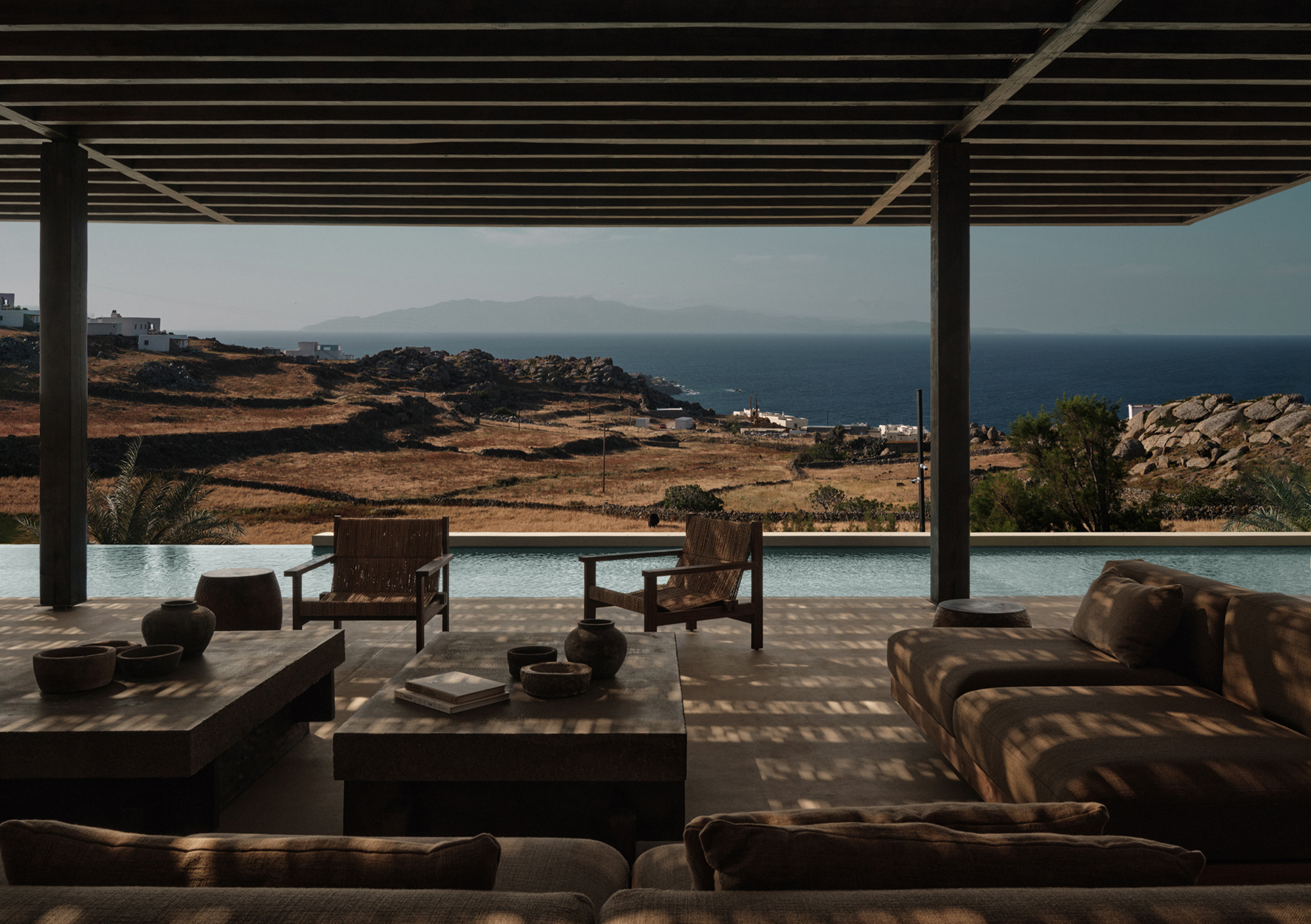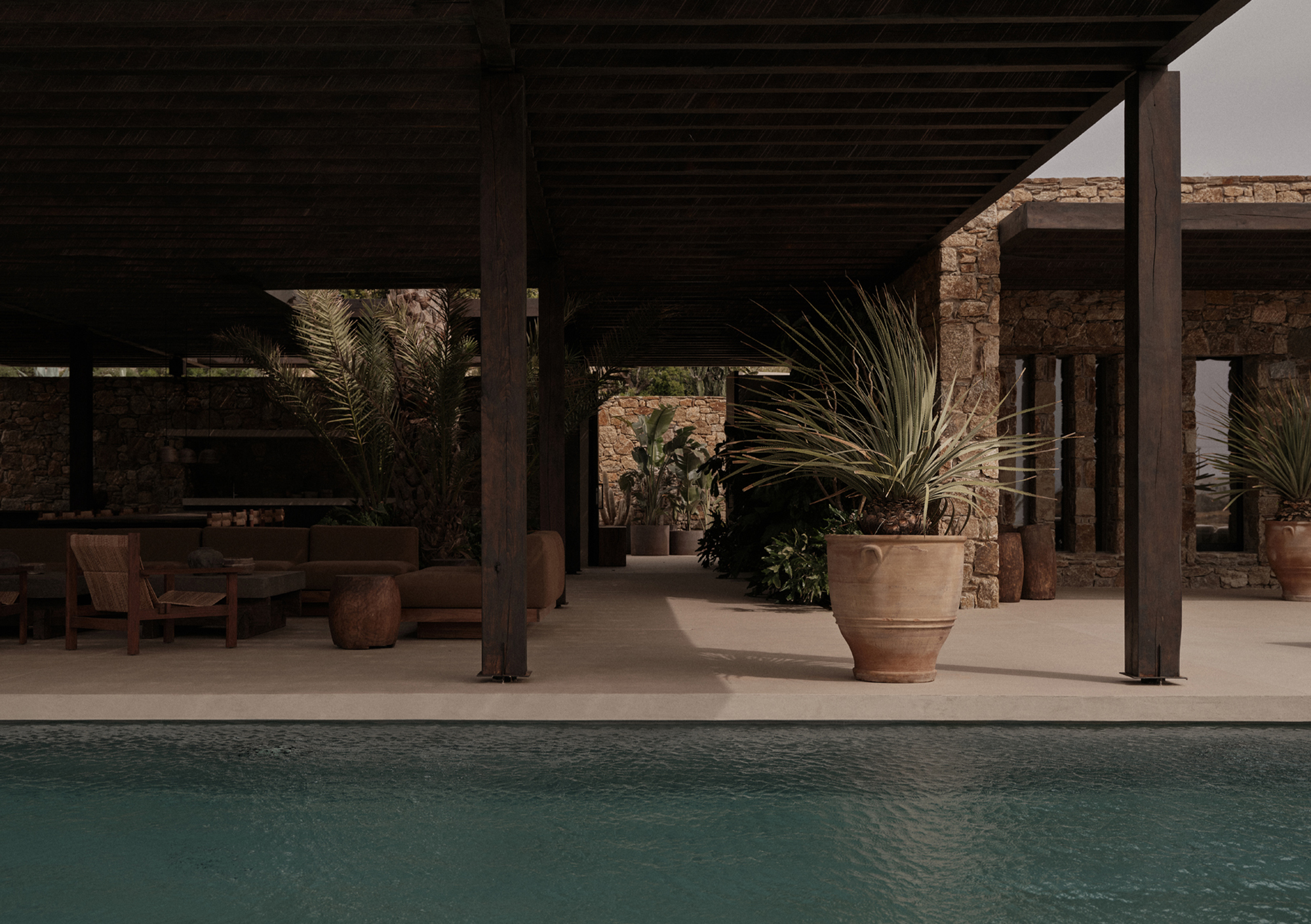 En Kyanó—its name comes from a singular shade of blue in the Greek language. It rests quietly along the sun-drenched slopes of Mykonos’ southwest coast, revealing itself unhurriedly—through rough stone, softened plaster, and the slow, liquid drift of light.