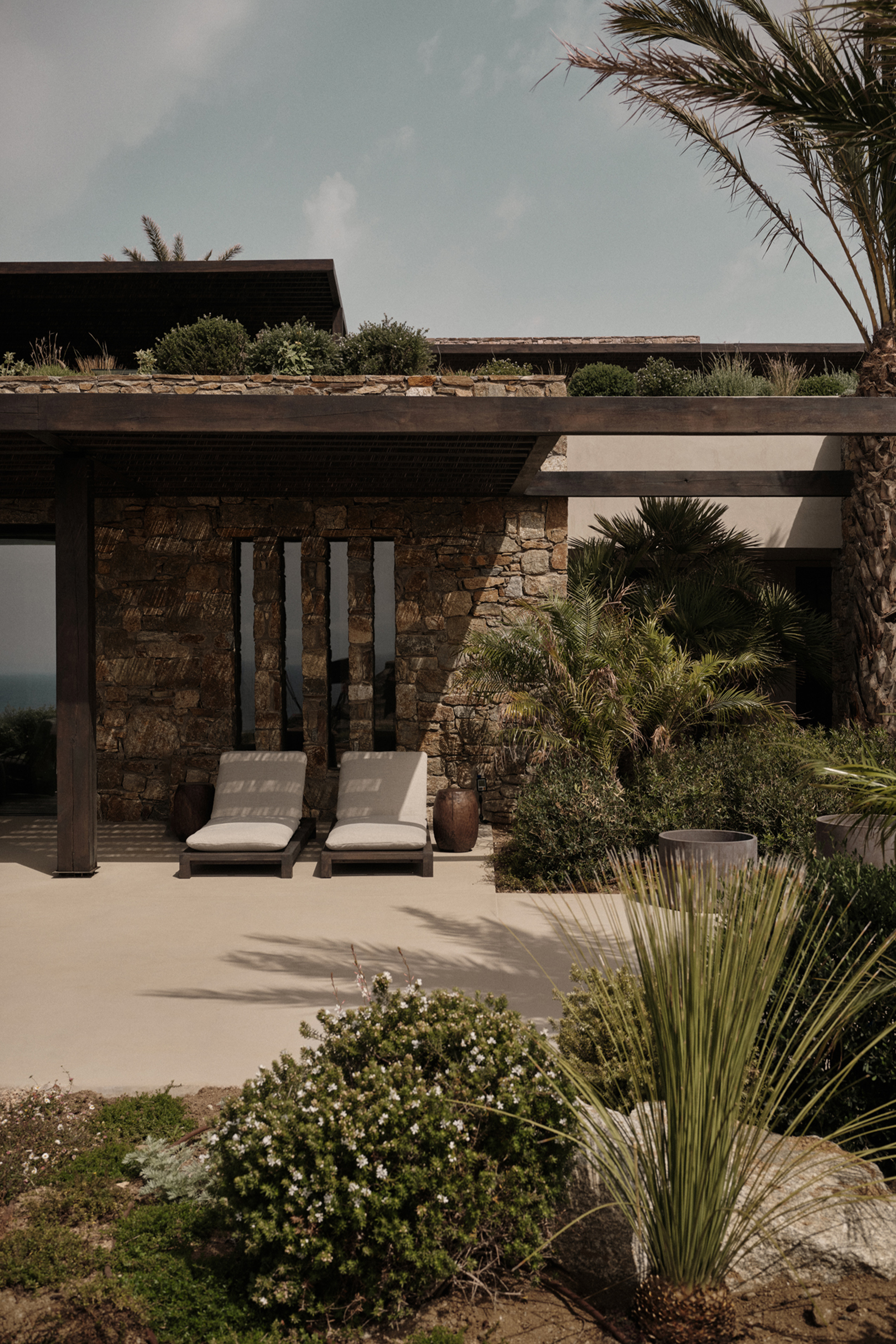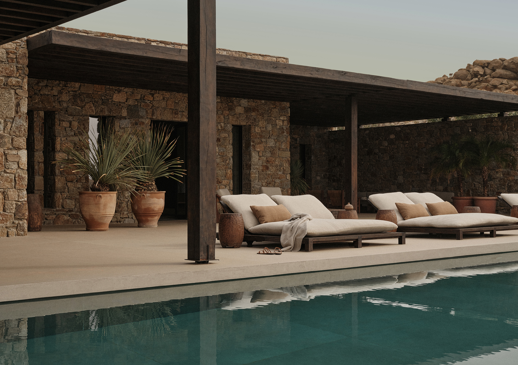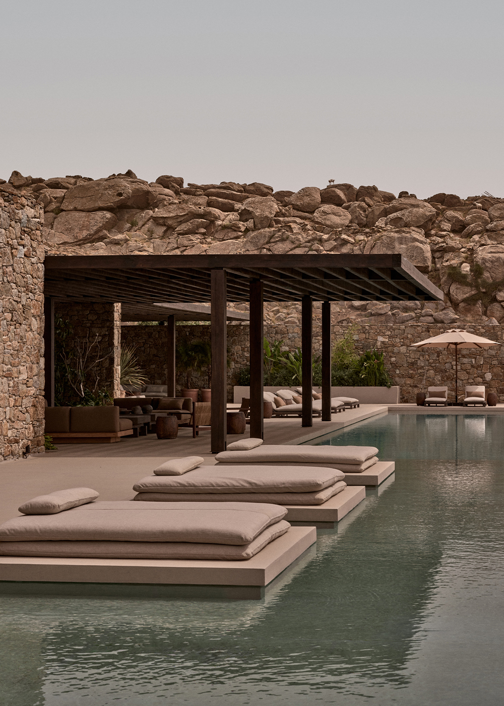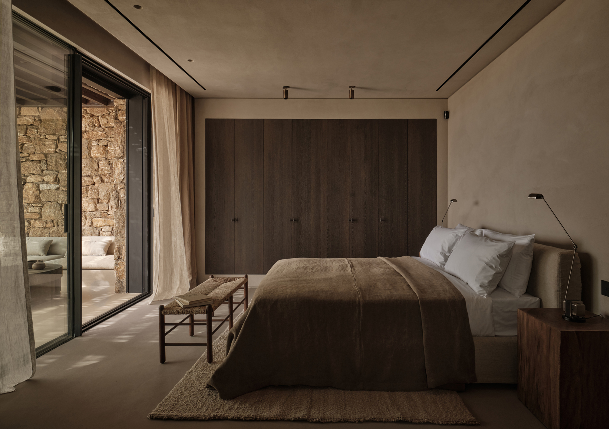 En Kyanó—its name comes from a singular shade of blue in the Greek language. It rests quietly along the sun-drenched slopes of Mykonos’ southwest coast, revealing itself unhurriedly—through rough stone, softened plaster, and the slow, liquid drift of light.
