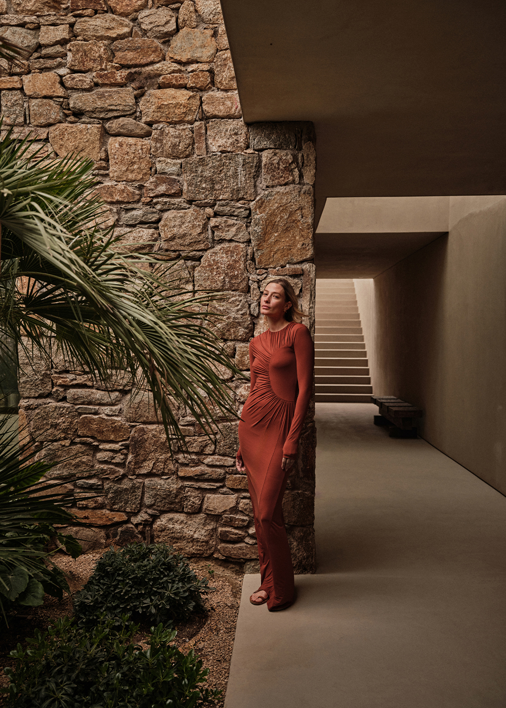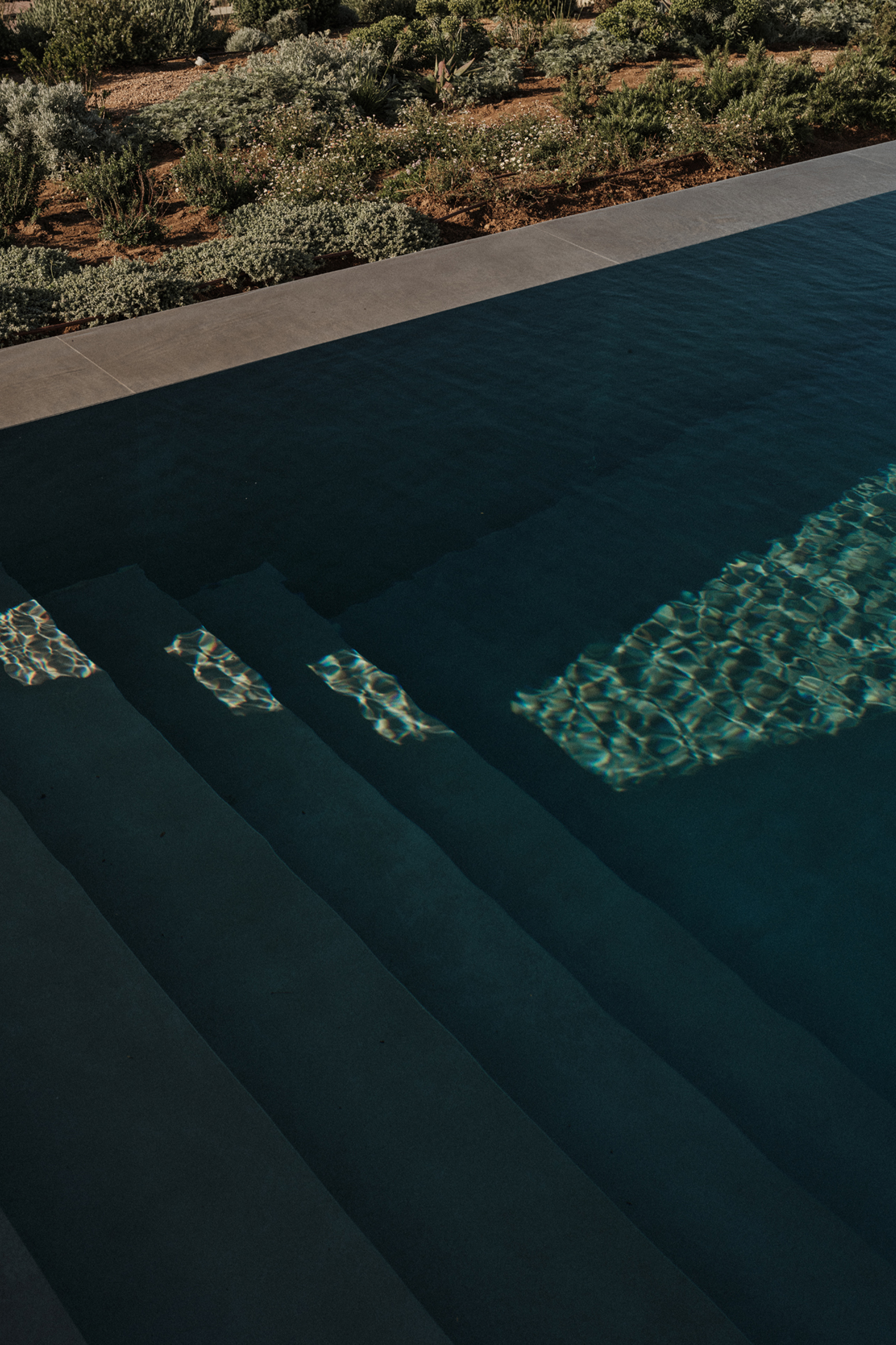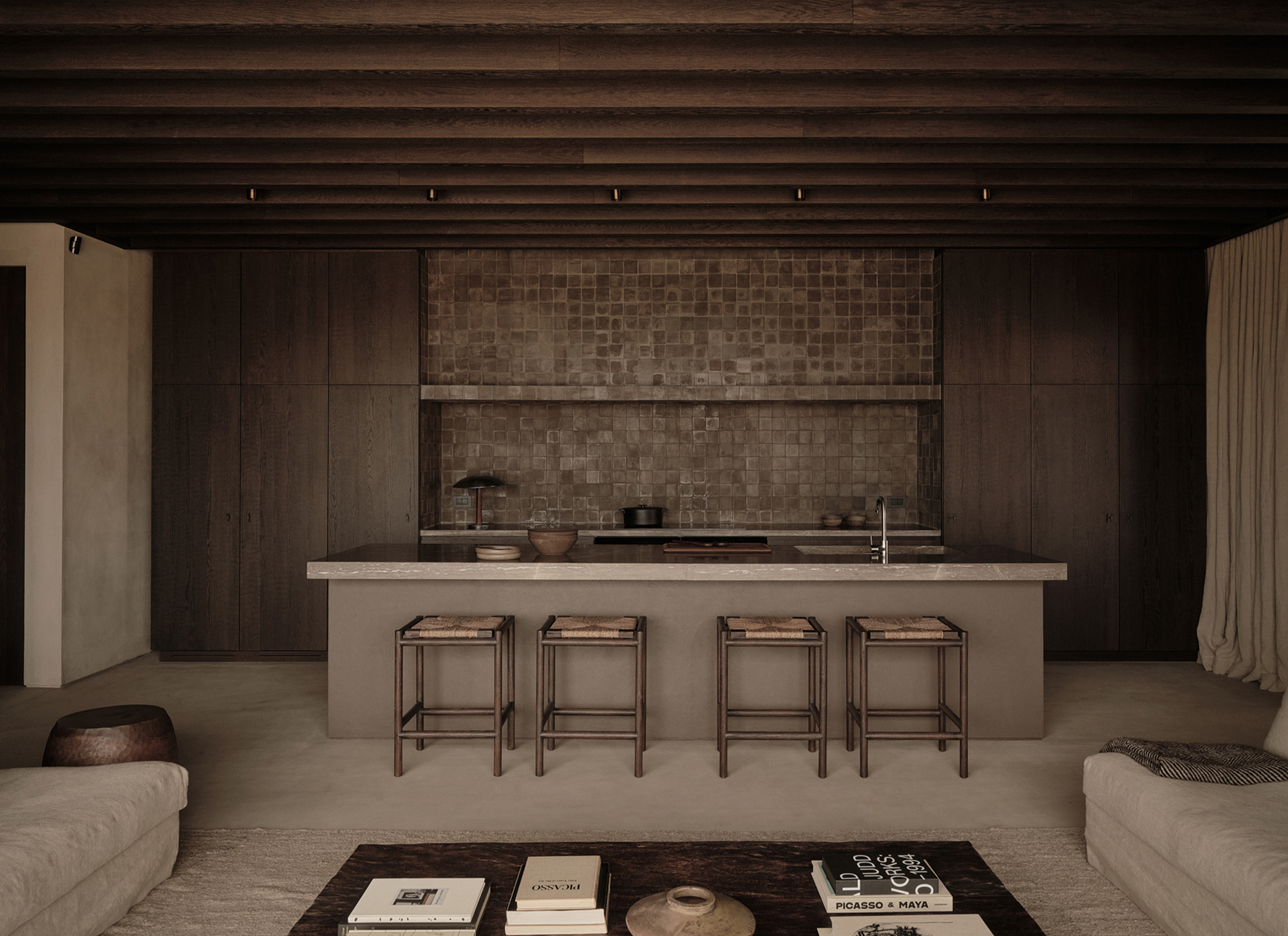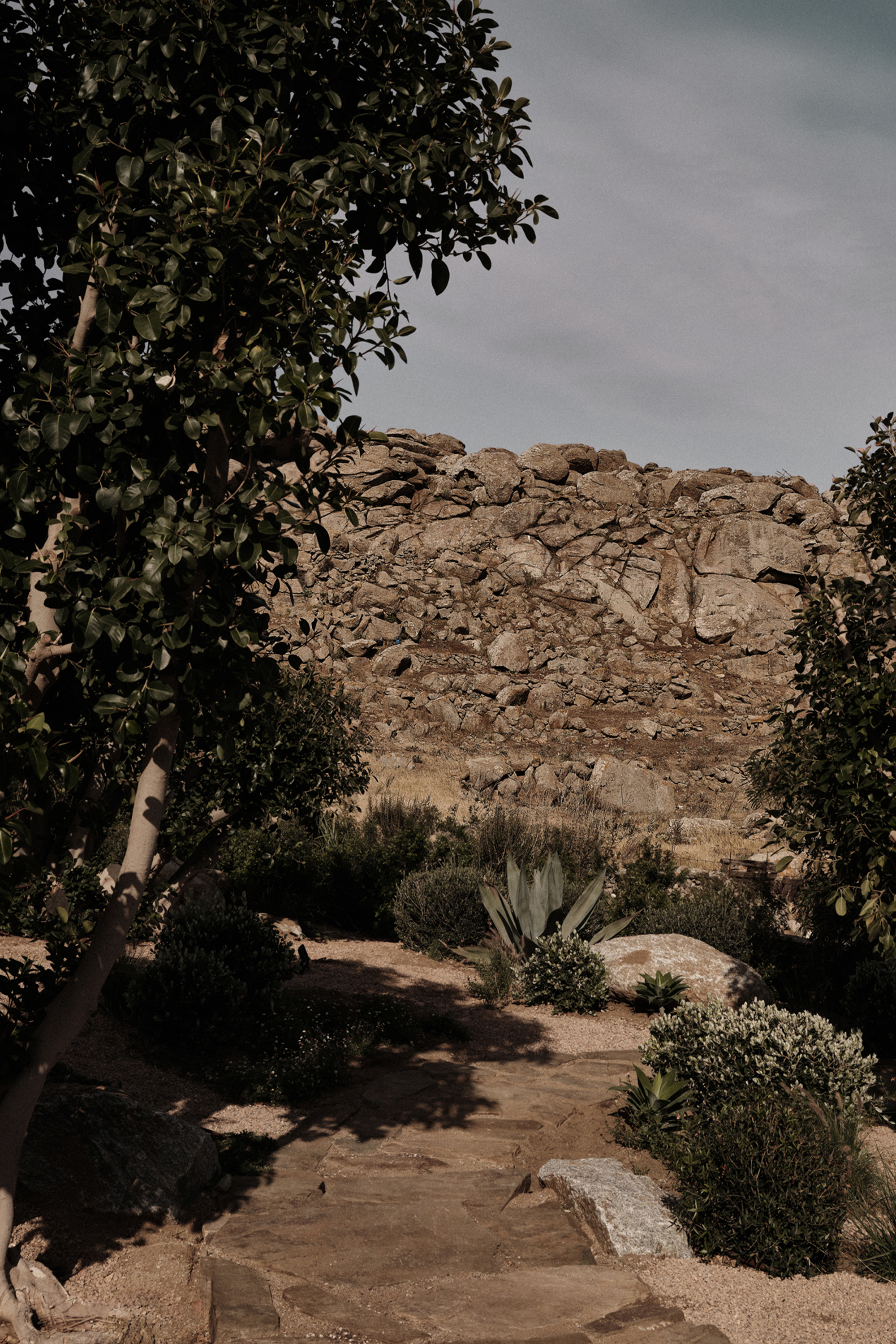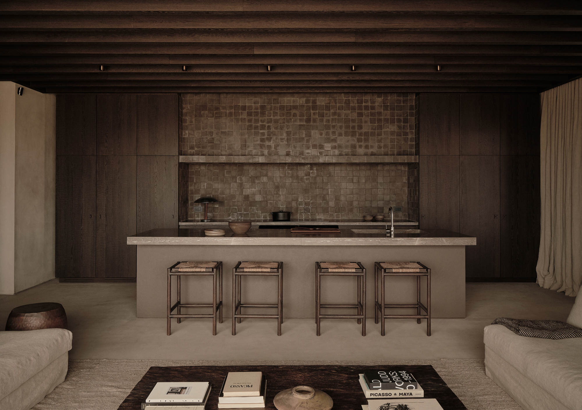 En Kyanó—its name comes from a singular shade of blue in the Greek language. It rests quietly along the sun-drenched slopes of Mykonos’ southwest coast, revealing itself unhurriedly—through rough stone, softened plaster, and the slow, liquid drift of light.
