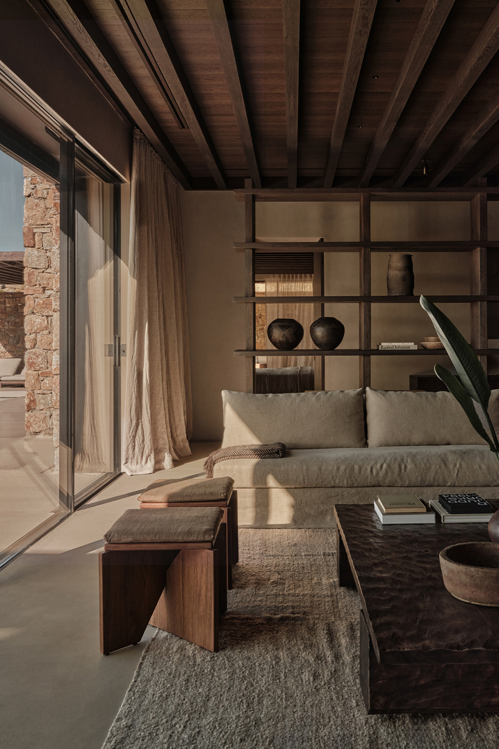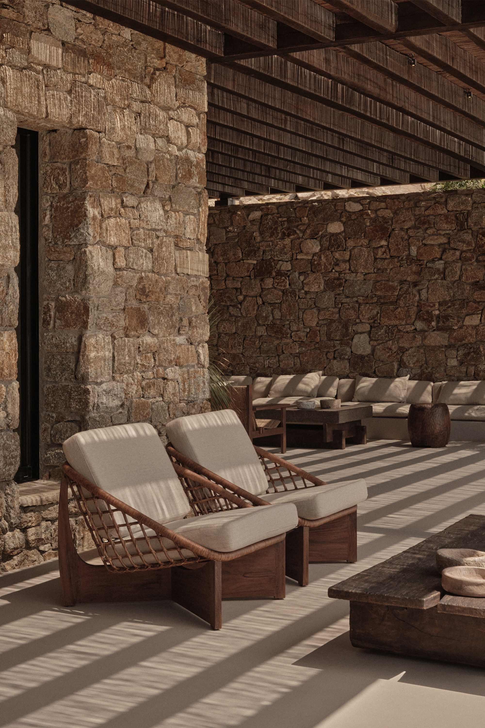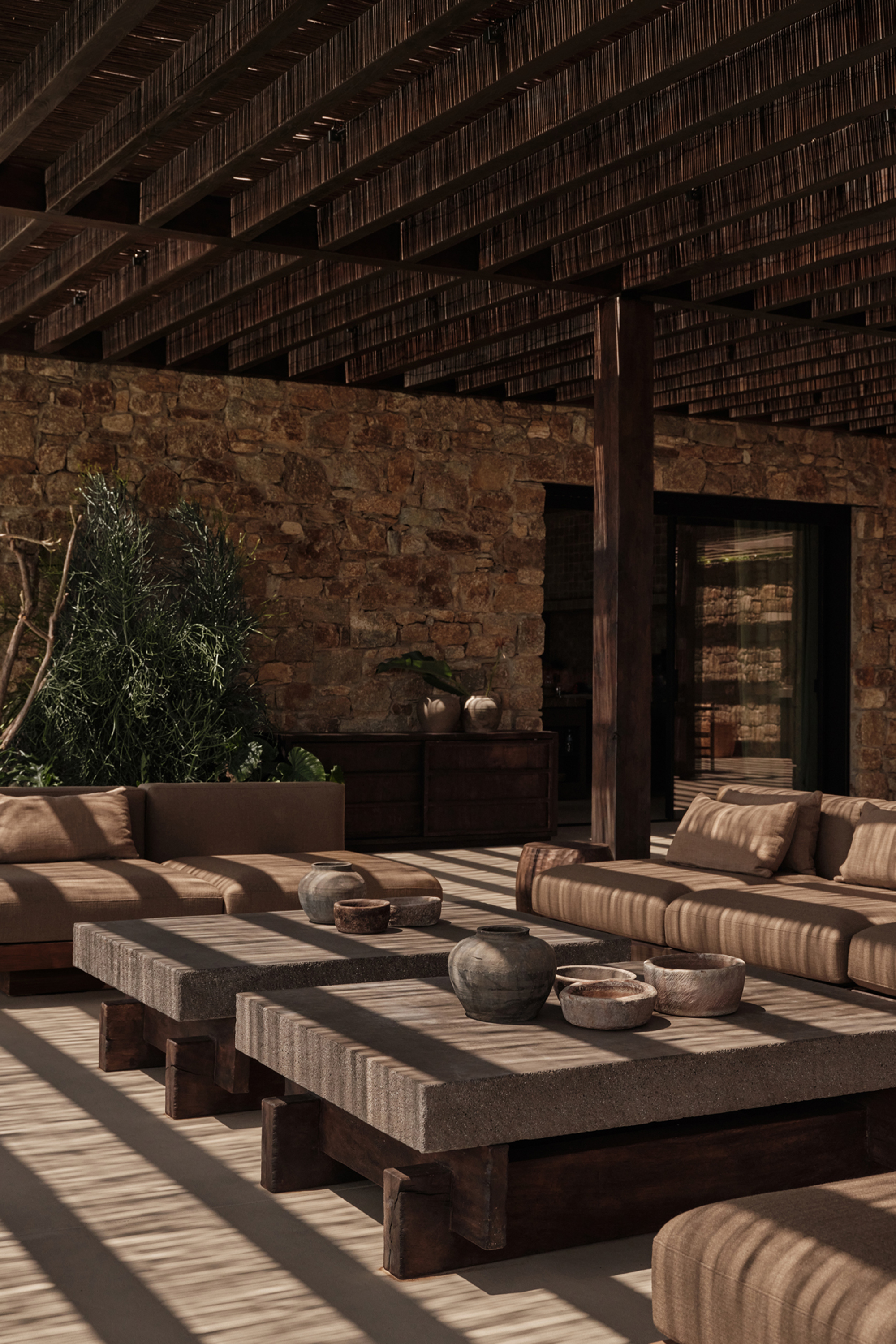 Michael guided us into the story of En Kyanó. The entrance reveals itself subtly—rough stone walls blending into the hillside, without clamor or declaration. As we moved into the courtyard, the vision opened generously—here lies the heart of the space, a corridor woven from lightweight modernist lattices and traditional Greek cane roofing, linking two wings. Horizontality stretches parallel to the coast, drawing the gaze toward the distant shoreline. Sunlight filters through the canopy, falling gently upon the ground and furnishings, dappled and shifting like shimmer on the sea.