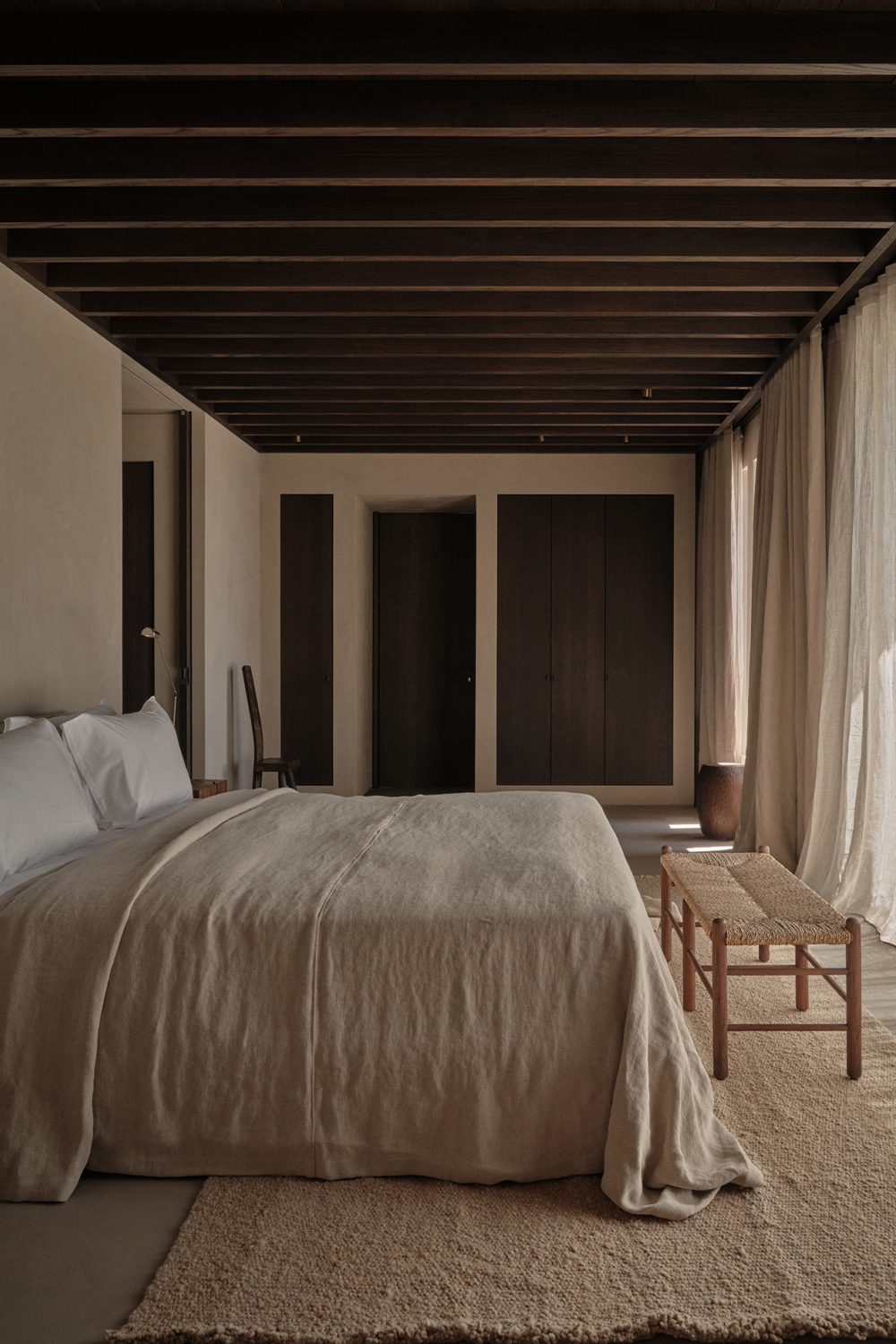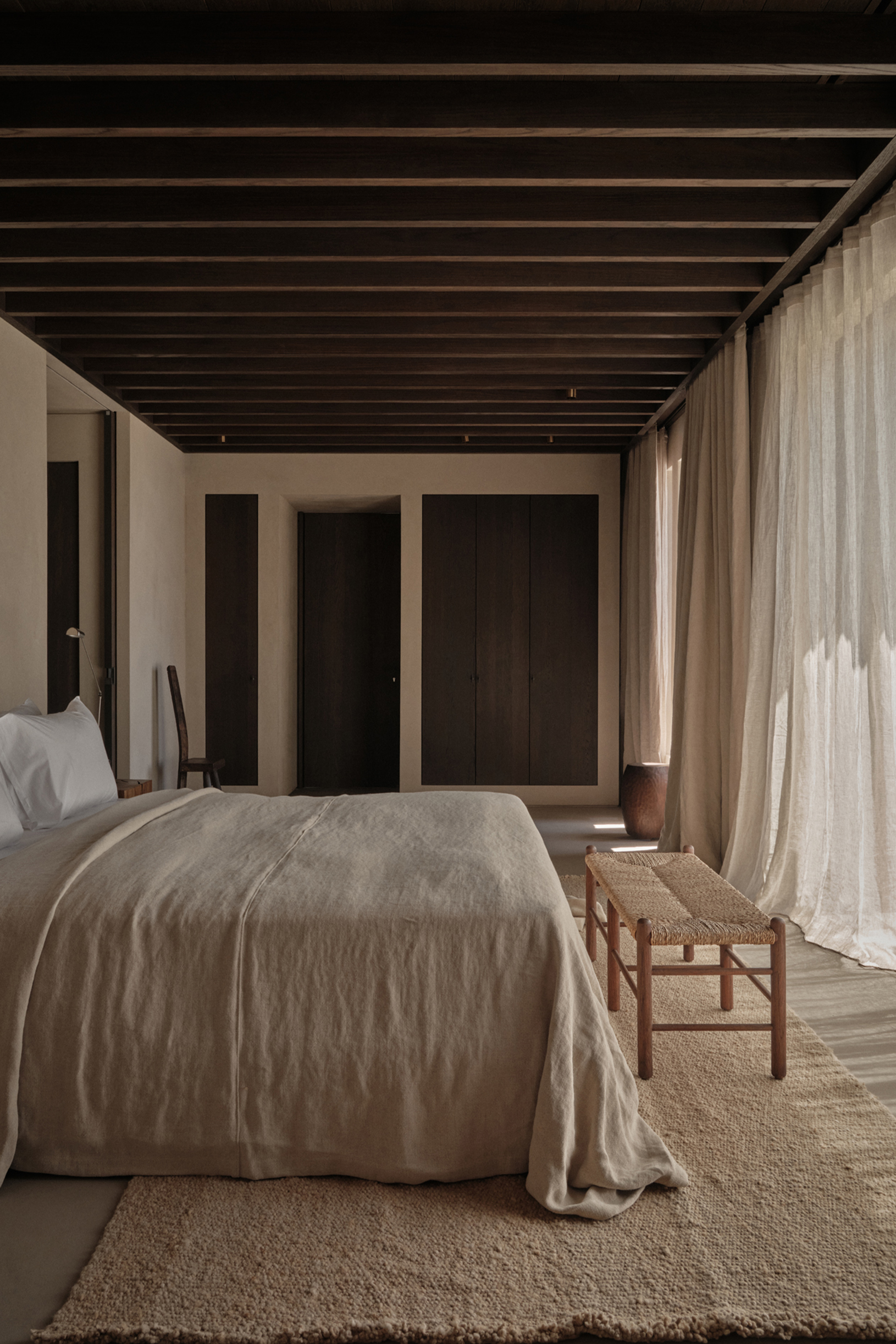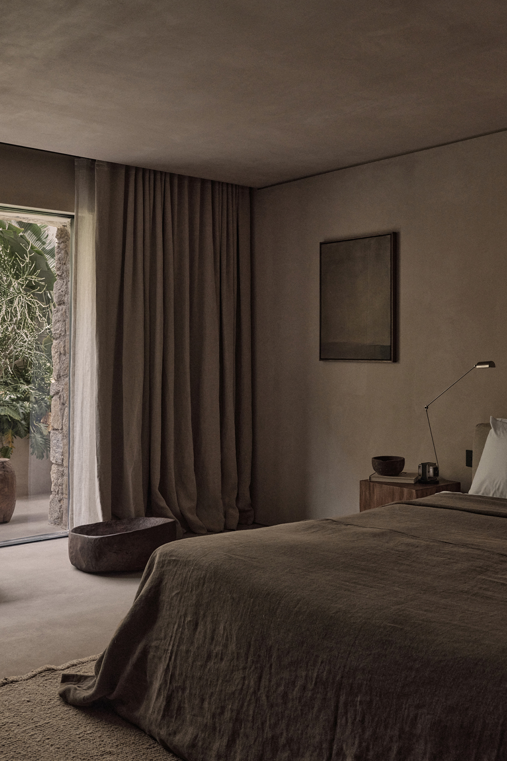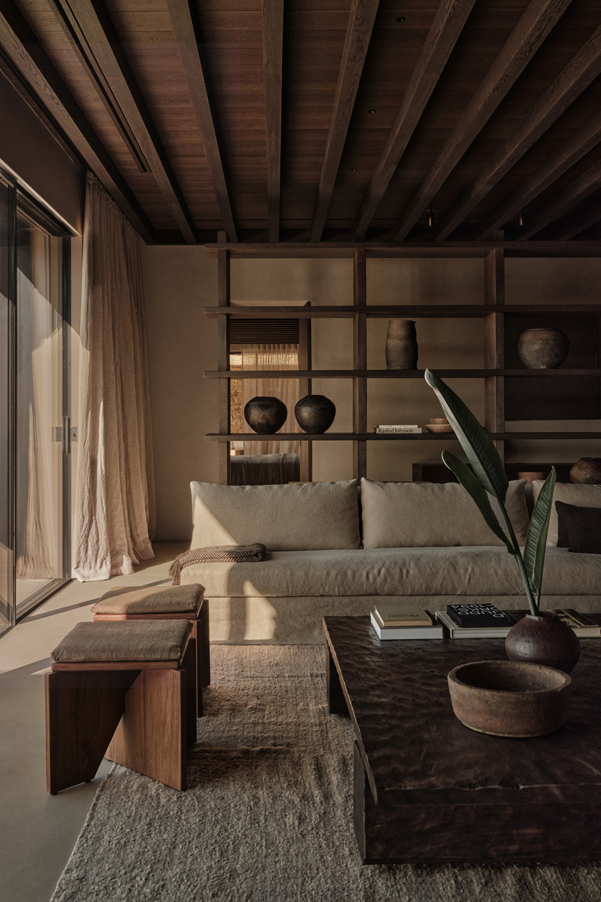 Michael guided us into the story of En Kyanó. The entrance reveals itself subtly—rough stone walls blending into the hillside, without clamor or declaration. As we moved into the courtyard, the vision opened generously—here lies the heart of the space, a corridor woven from lightweight modernist lattices and traditional Greek cane roofing, linking two wings. Horizontality stretches parallel to the coast, drawing the gaze toward the distant shoreline. Sunlight filters through the canopy, falling gently upon the ground and furnishings, dappled and shifting like shimmer on the sea.