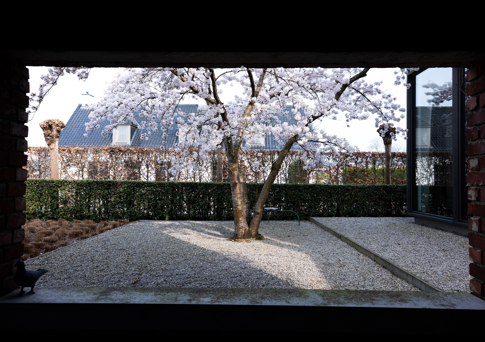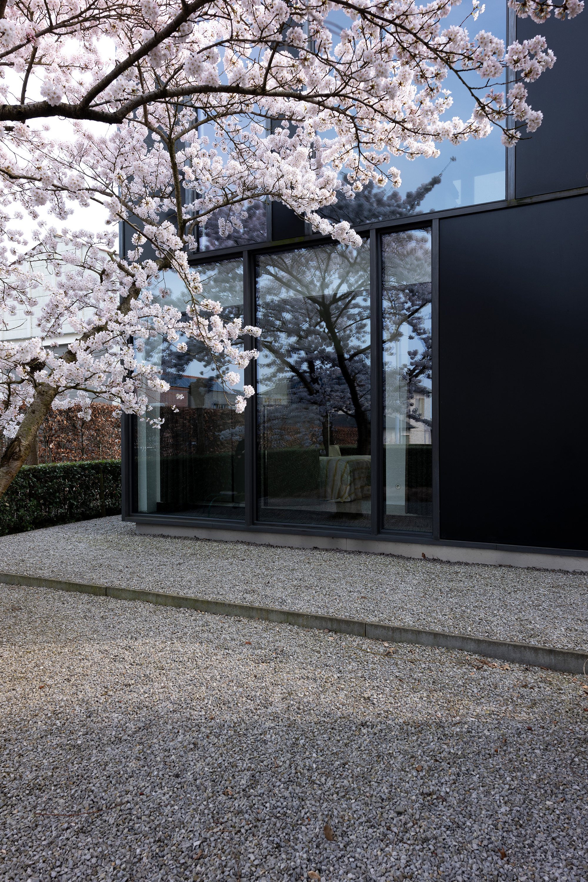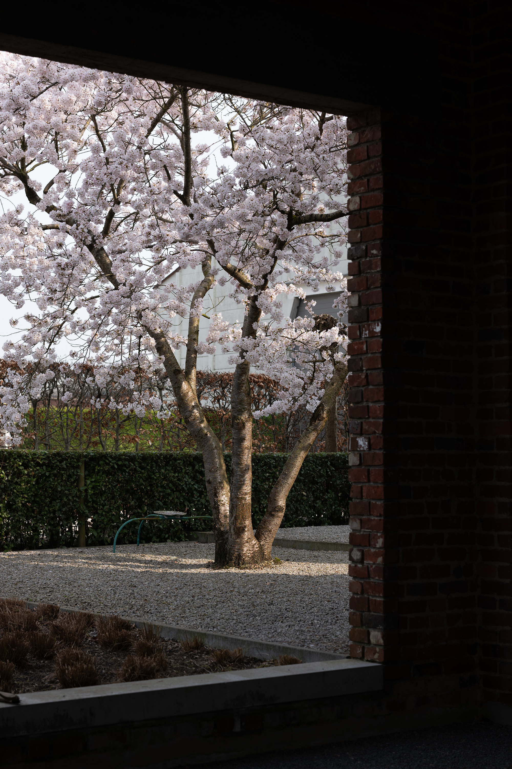 We wandered through the rest of the home-office hybrid, pausing at niches, sculptures, and soft light filtering across carefully selected materials. As we stepped back outside, the spring air was soft and the cherry trees were in full bloom — heavy with blossoms, their branches bowed under the weight. Frederic smiled and called it lucky timing. Nothing overdone, nothing out of place — just the right moment, in the right light.
