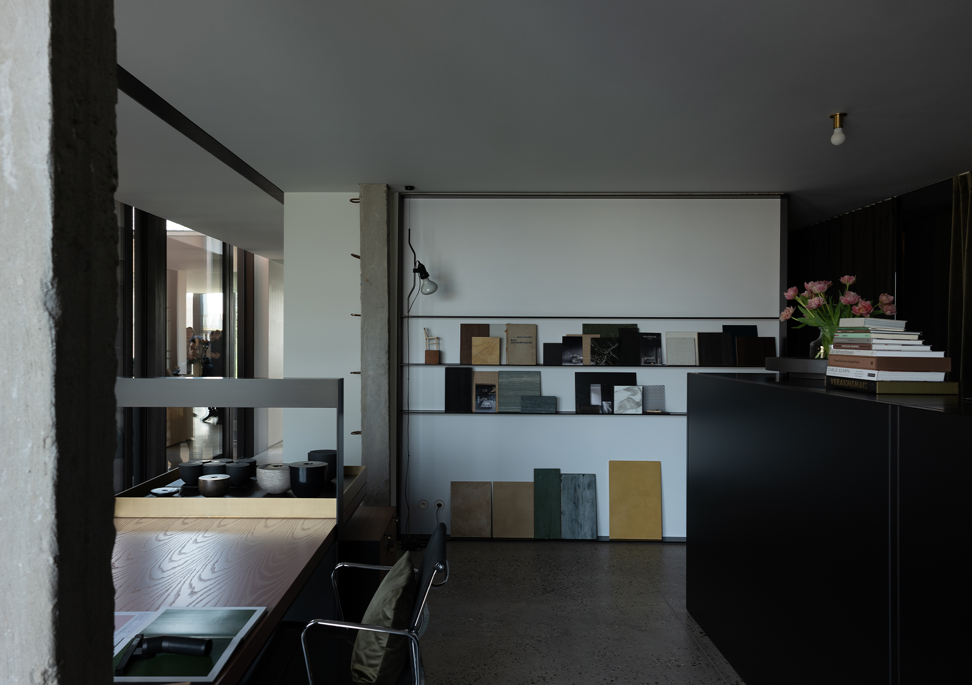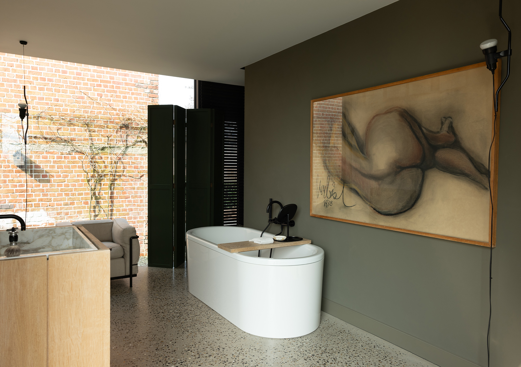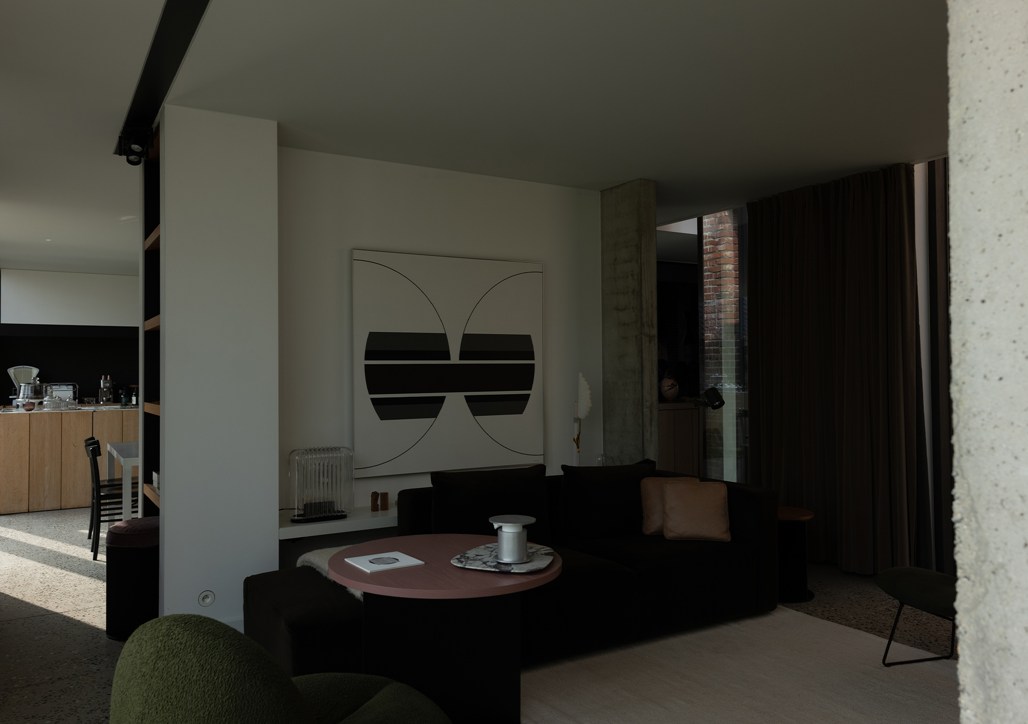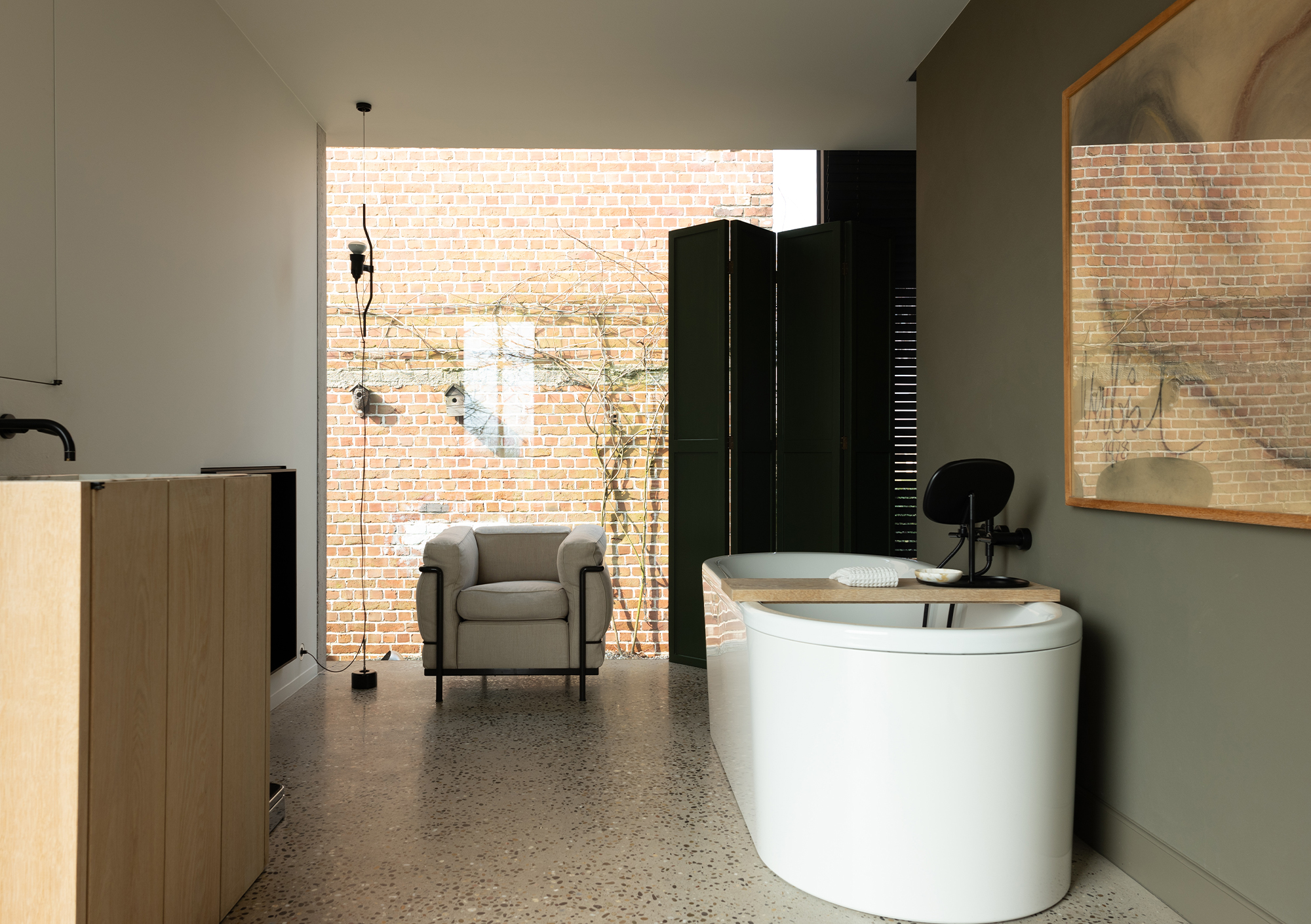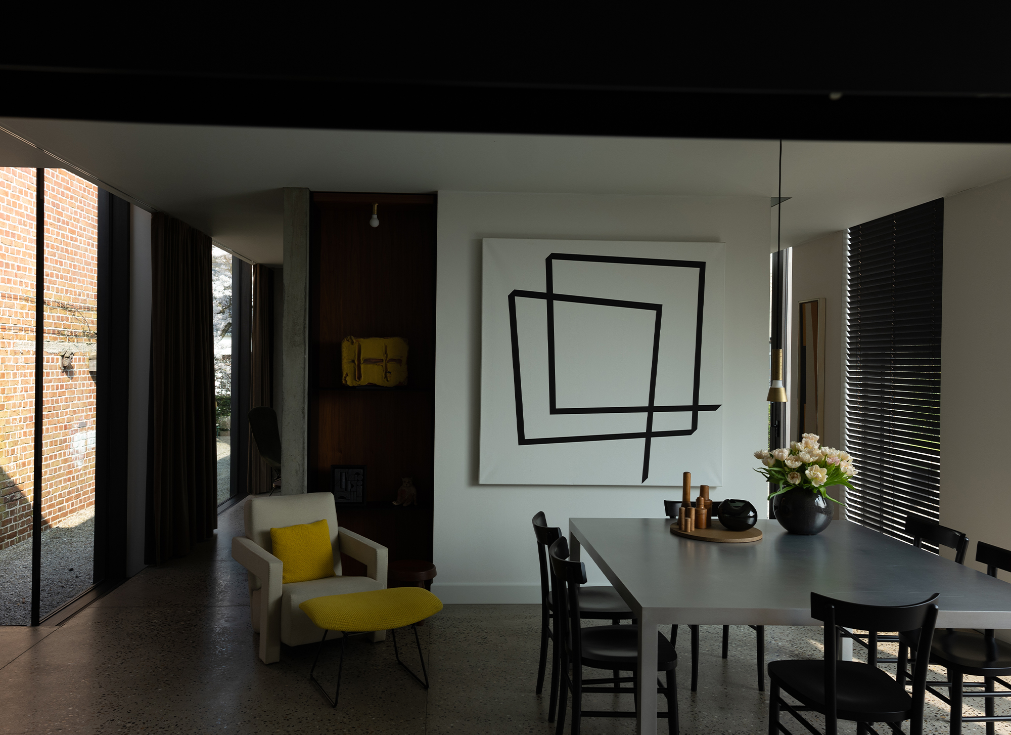 Even the layout bends expectations. The bathroom, for instance, sits just off the living area, visible from the street if curtains are open. Frederic laughed, saying his Italian mother still finds that a bit strange. But for him, it’s all part of rethinking how we live and work in the same space. His office, set just off the main area, is designed for deep focus. “When I need to concentrate, I work behind the wall,” he said.