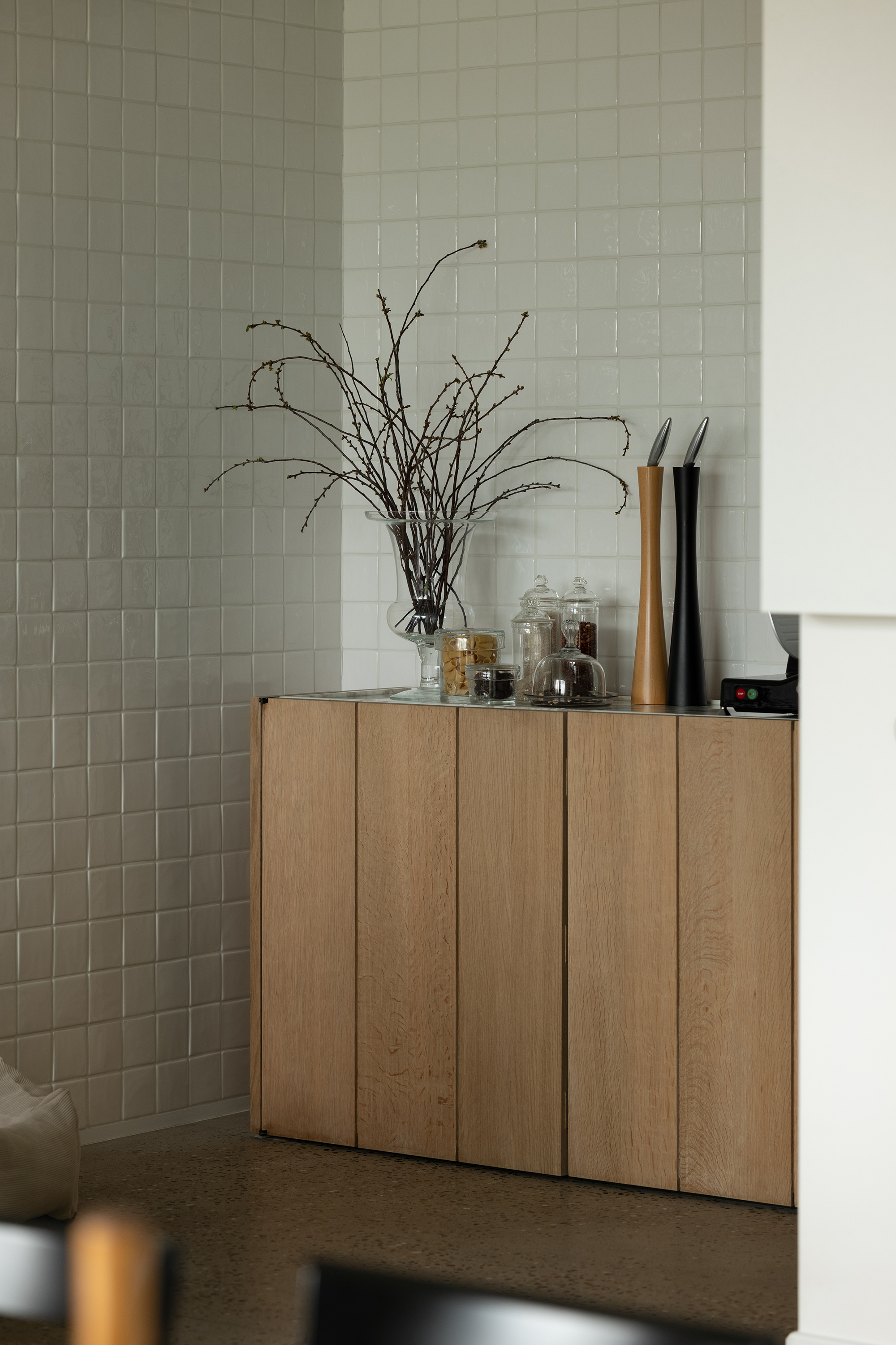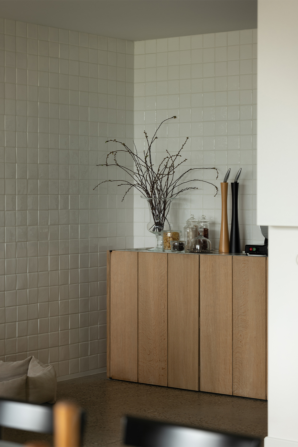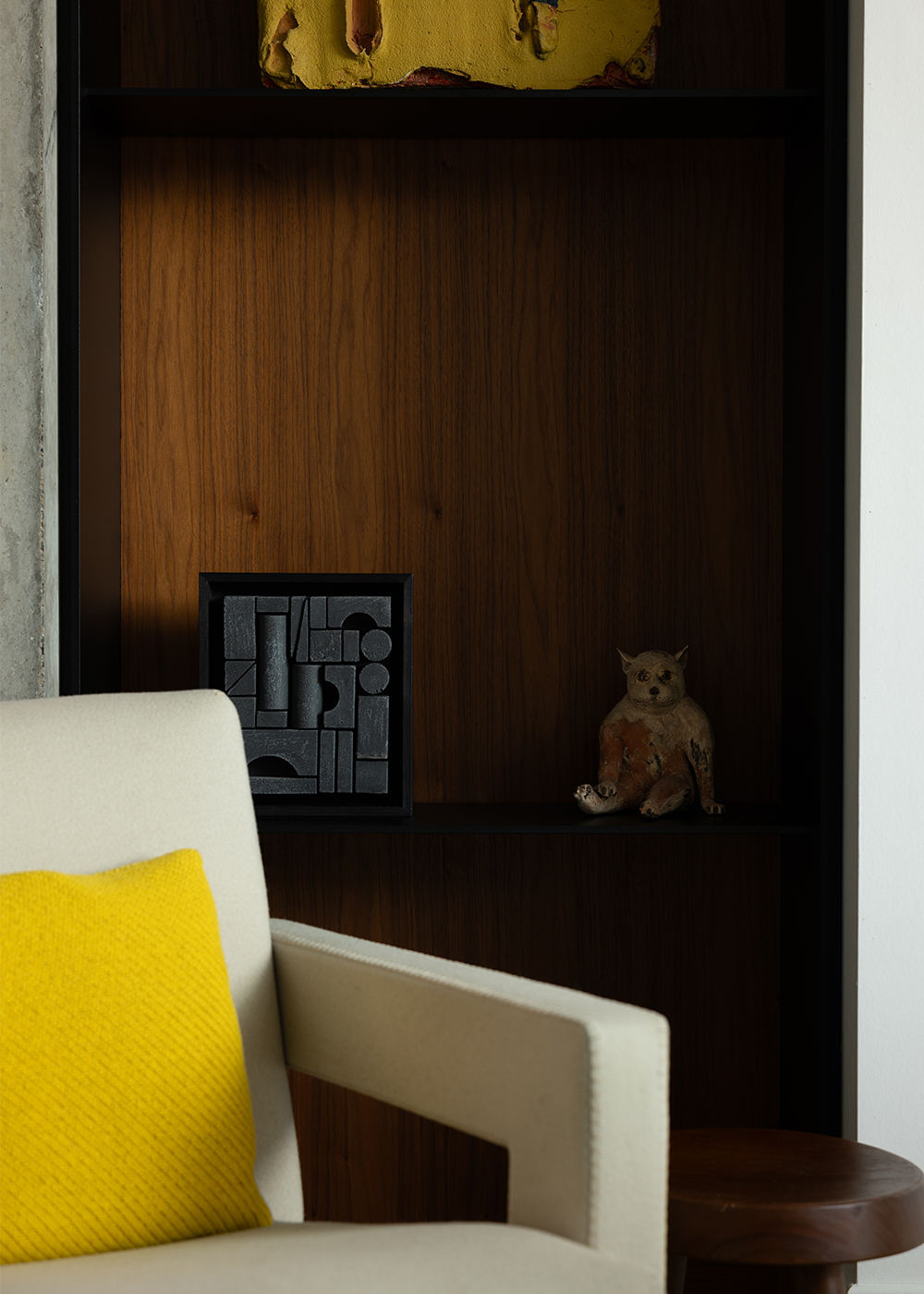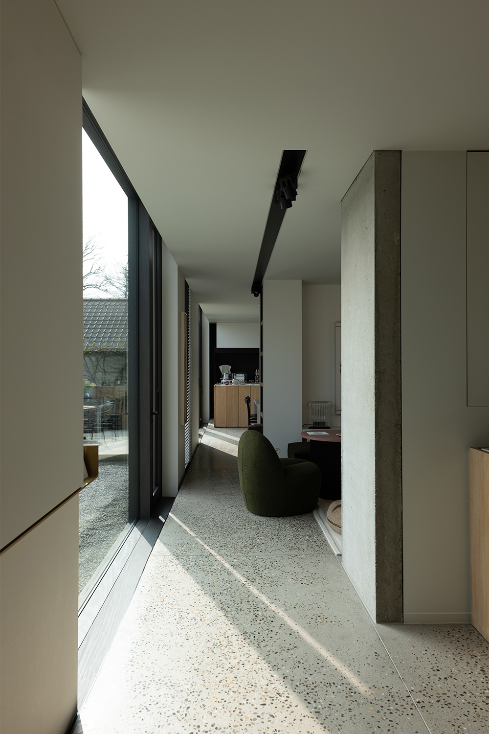 The floors underfoot are concrete, embedded with selectively placed stones. They shimmer just enough to echo the carefully curated palette — walnut hues nested in alcoves, solid oak cabinetry, and white tones that coolly balance the natural materials. The house breathes in tonal harmony.