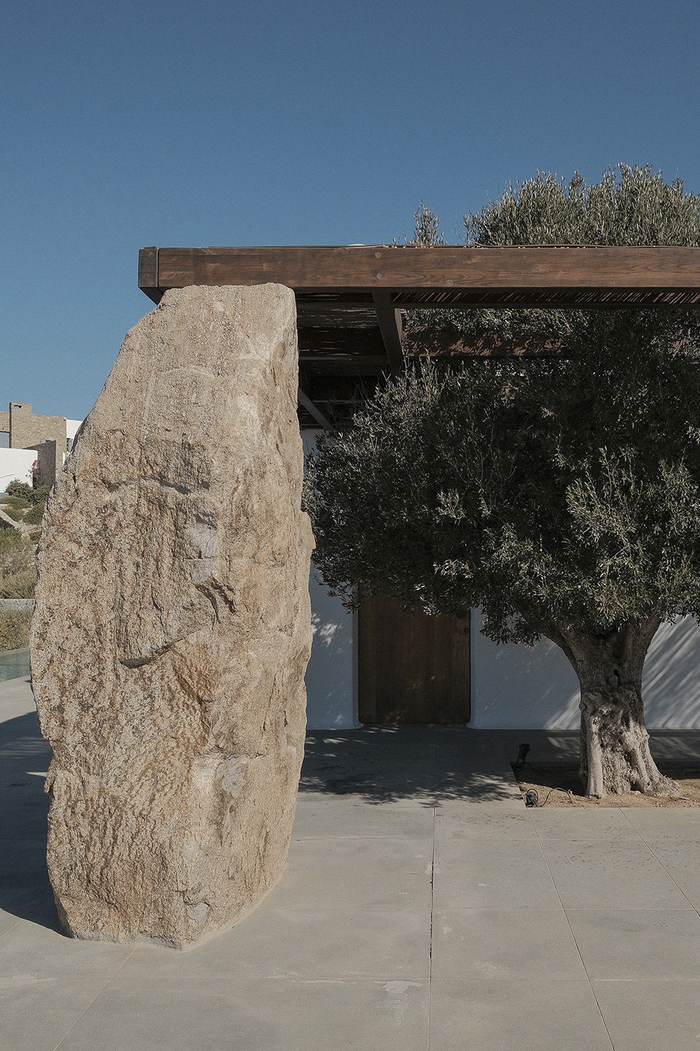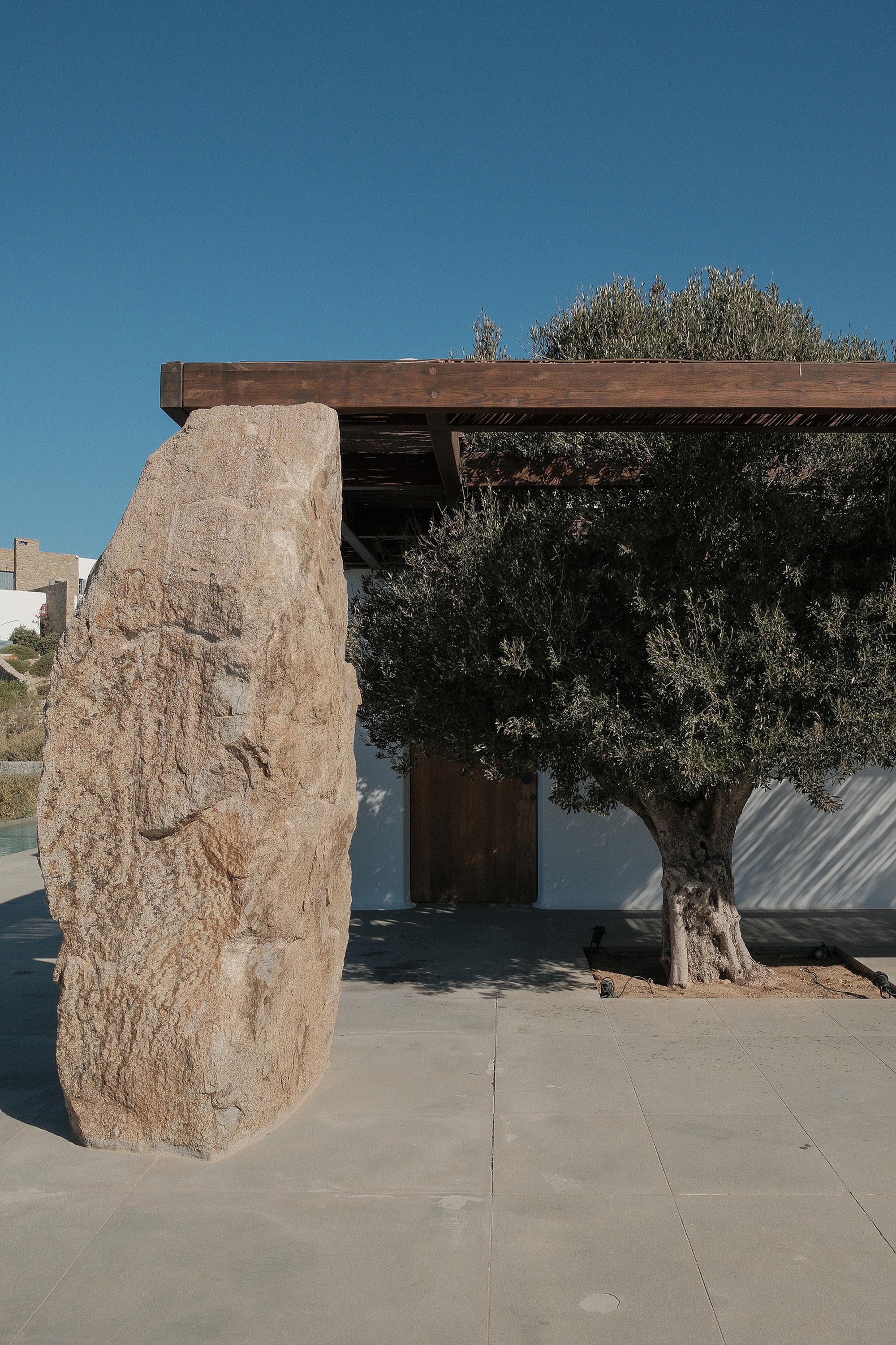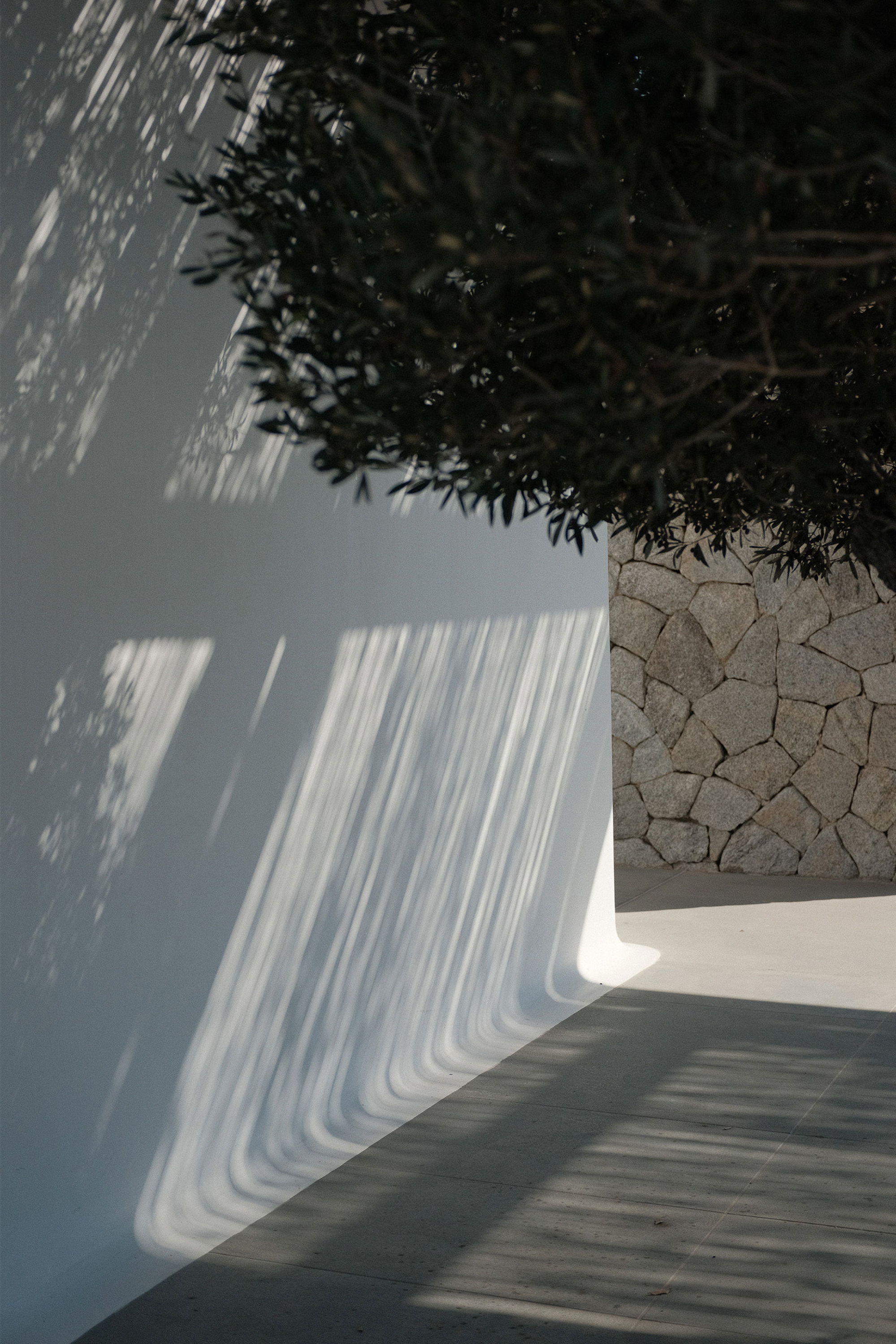 Two pure white volumes lie on the ridge like calm sculptures, and their simple geometric lines form a delicate tension with the jagged rocks. This architectural language is not a simple replication of minimalism, but a poetic translation of the traditional Greek "cave house". When the shadow of the chestnut pergola casts precise diamond-shaped light spots at noon, and when the branches and leaves of the olive tree sway on the lime wall to create a Byzantinian-style gold foil effect, we suddenly understand what it means to "capture light with stones".