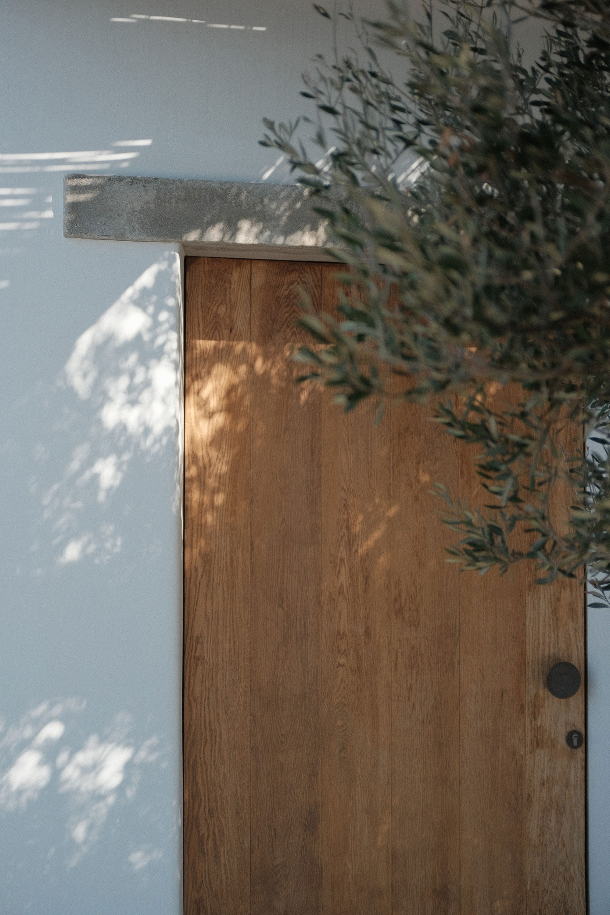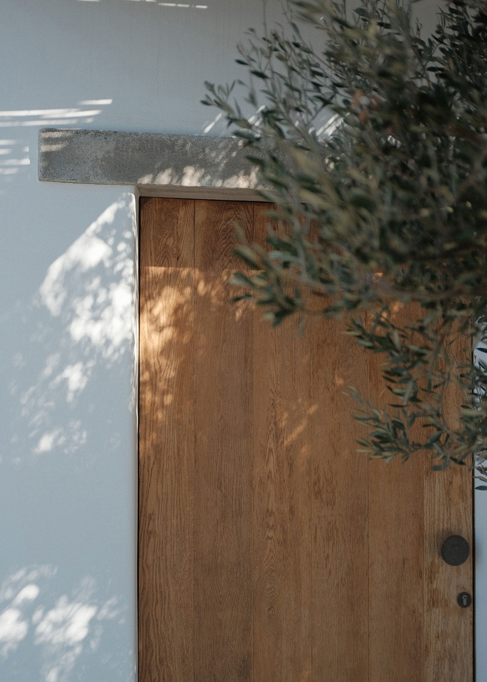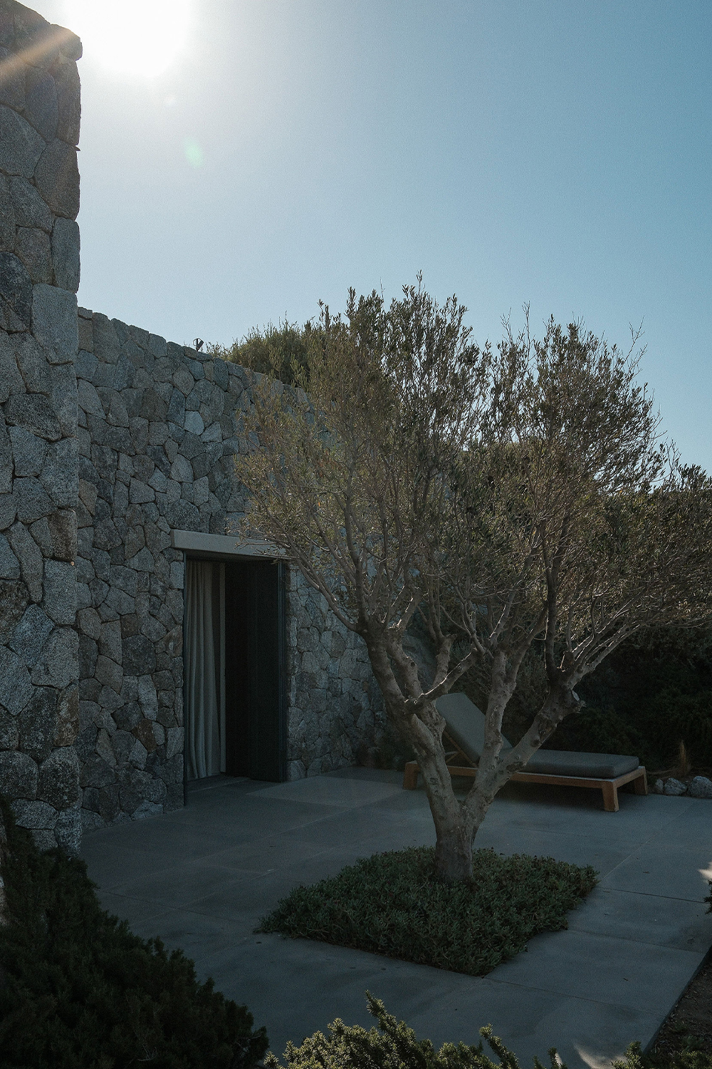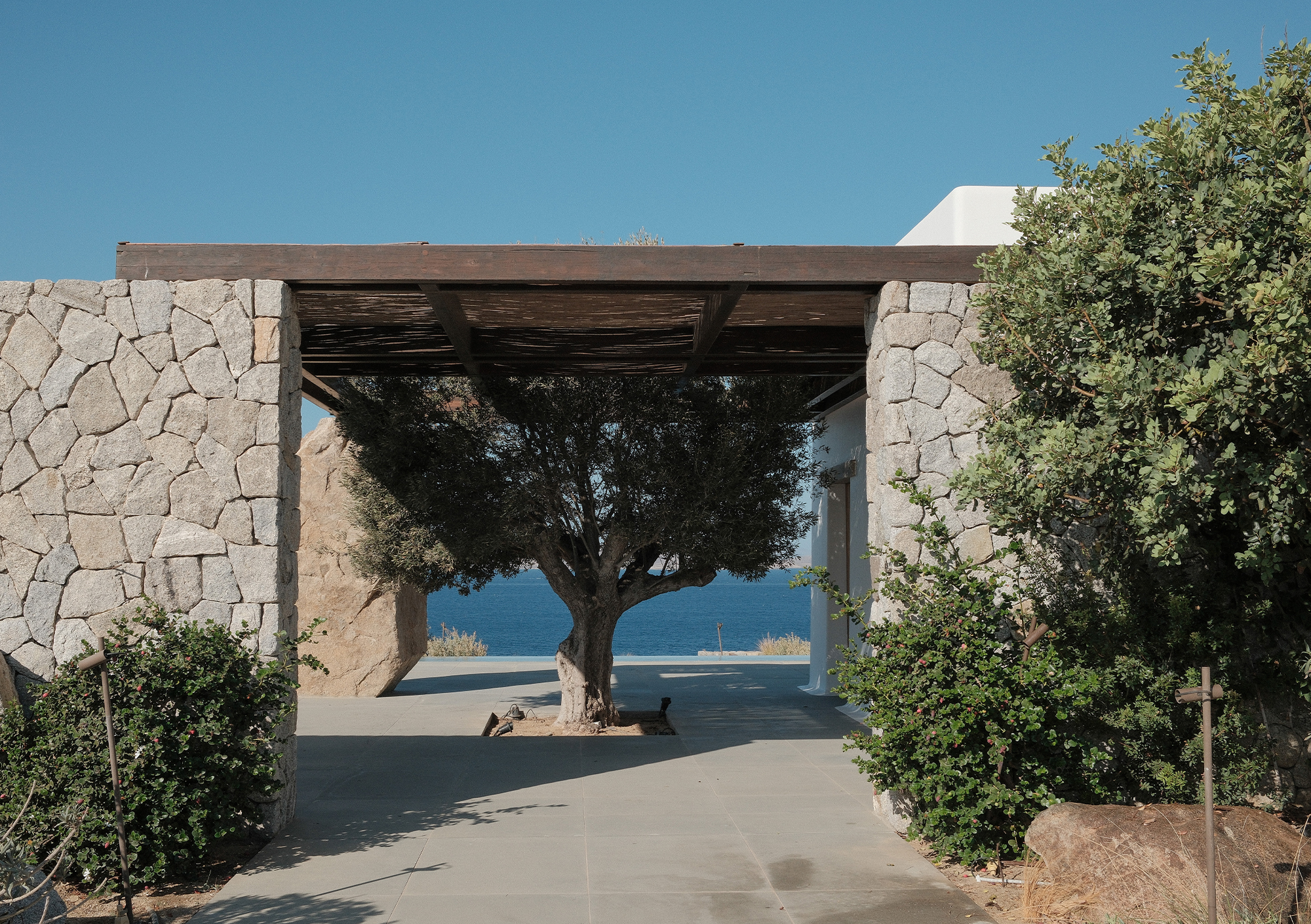 Two pure white volumes lie on the ridge like calm sculptures, and their simple geometric lines form a delicate tension with the jagged rocks. This architectural language is not a simple replication of minimalism, but a poetic translation of the traditional Greek "cave house". When the shadow of the chestnut pergola casts precise diamond-shaped light spots at noon, and when the branches and leaves of the olive tree sway on the lime wall to create a Byzantinian-style gold foil effect, we suddenly understand what it means to "capture light with stones".