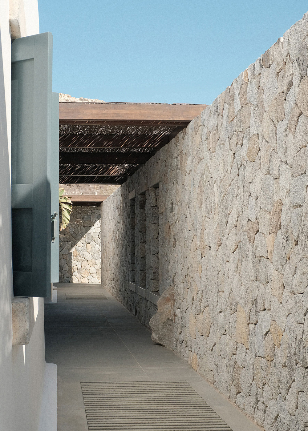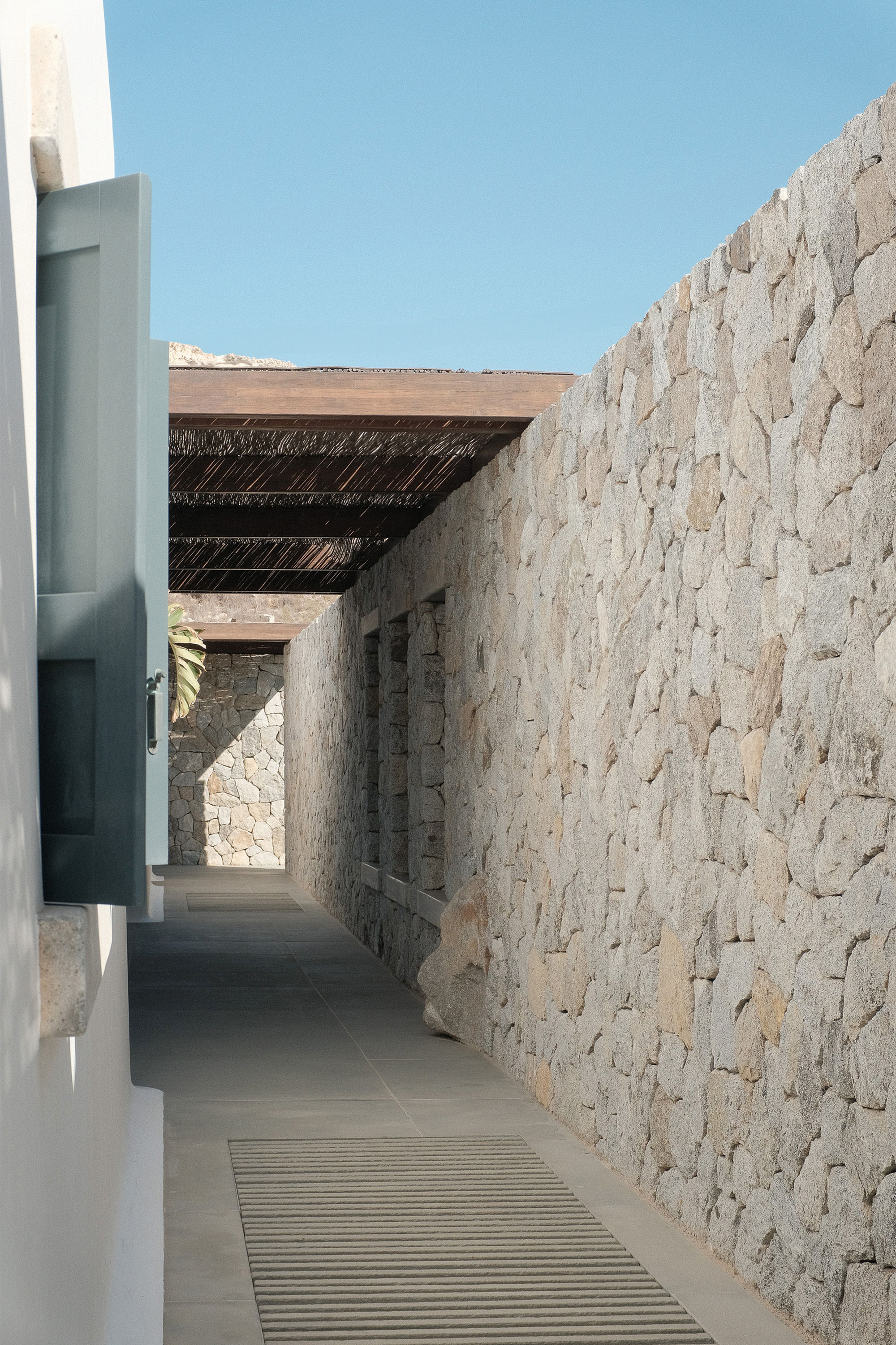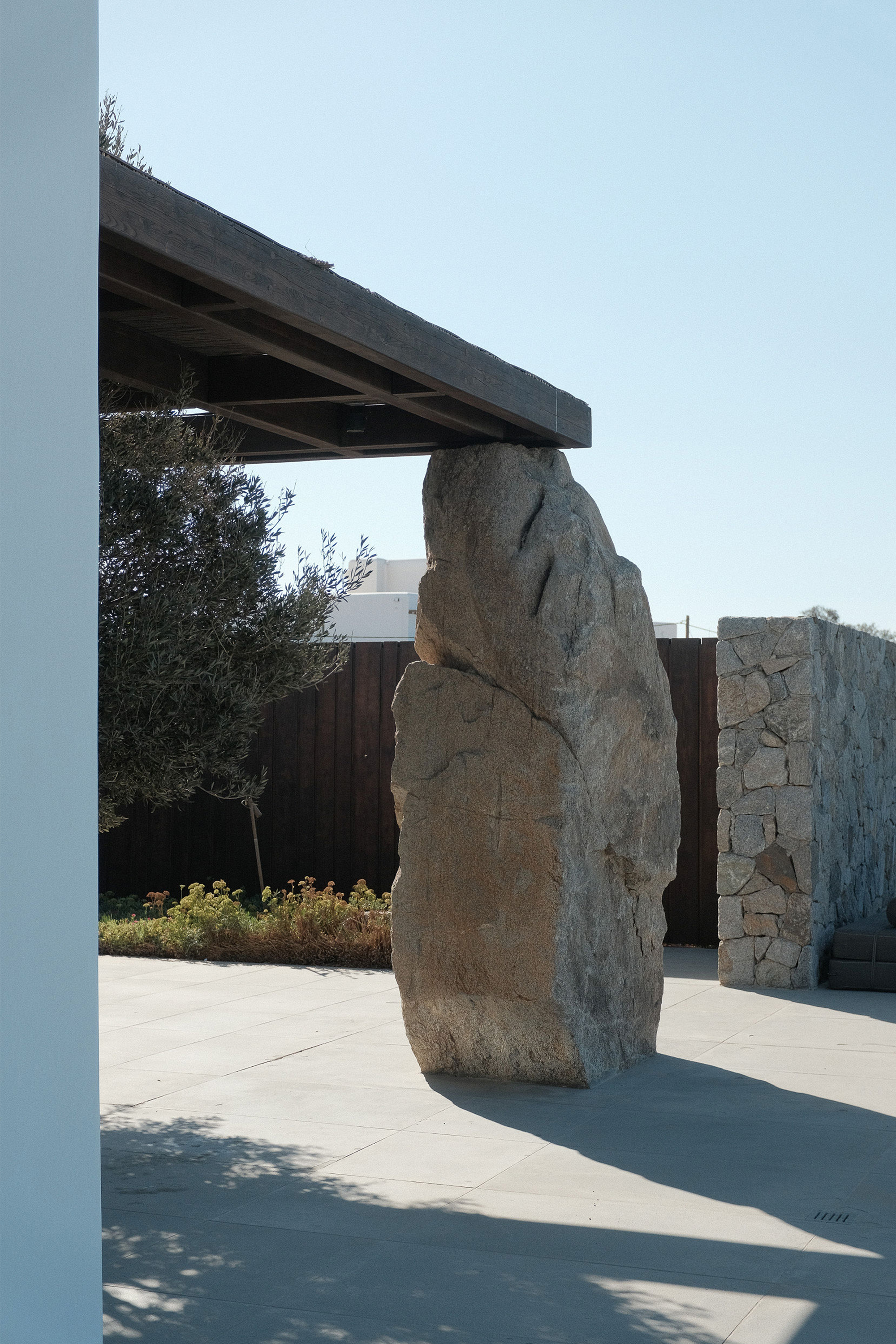 We visited this villa on a quiet early morning. The rough volcanic rocks spread out a geological epic at the entrance, and each mottled pattern tells the thousand-year-old memory of the island. The Karampatakis brothers and their numerous team of K-STUDIO, with the acumen of modern architects, respect and continue these ancient material grammars. They have transformed the stone walls from mere boundaries into a medium connecting the earth and the sky. Those seemingly random builds are actually precisely calculated frames for viewing. When sunlight penetrates the stone crevices at a specific Angle, the entire entrance hall turns into an installation art piece interwoven with light and shadow.