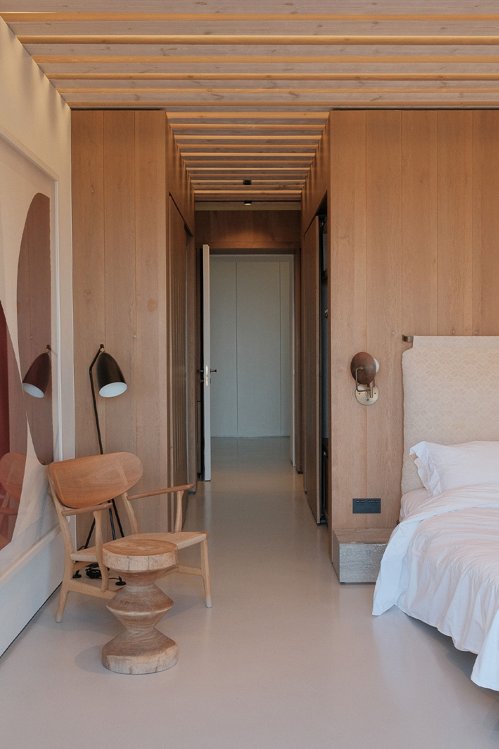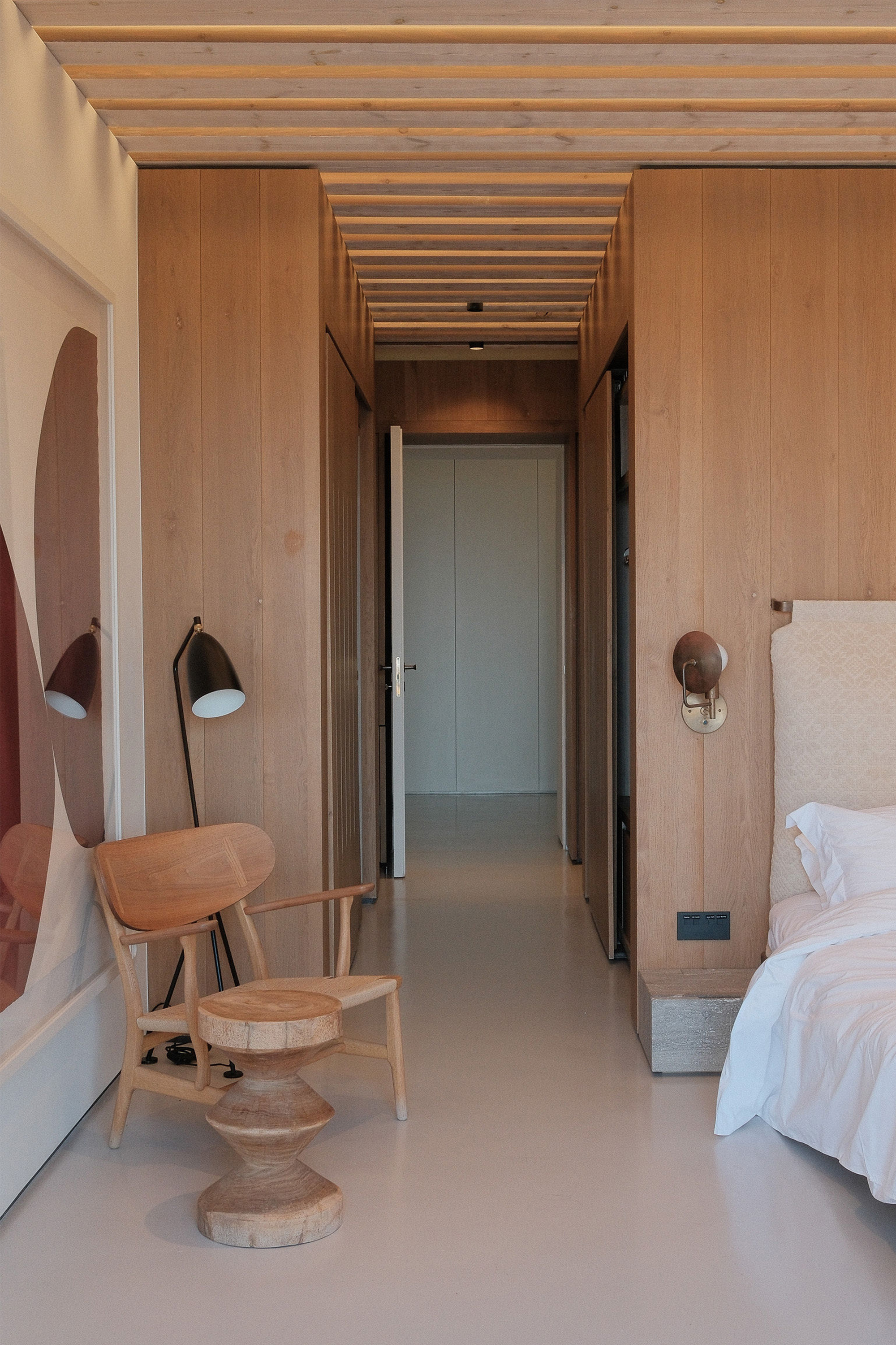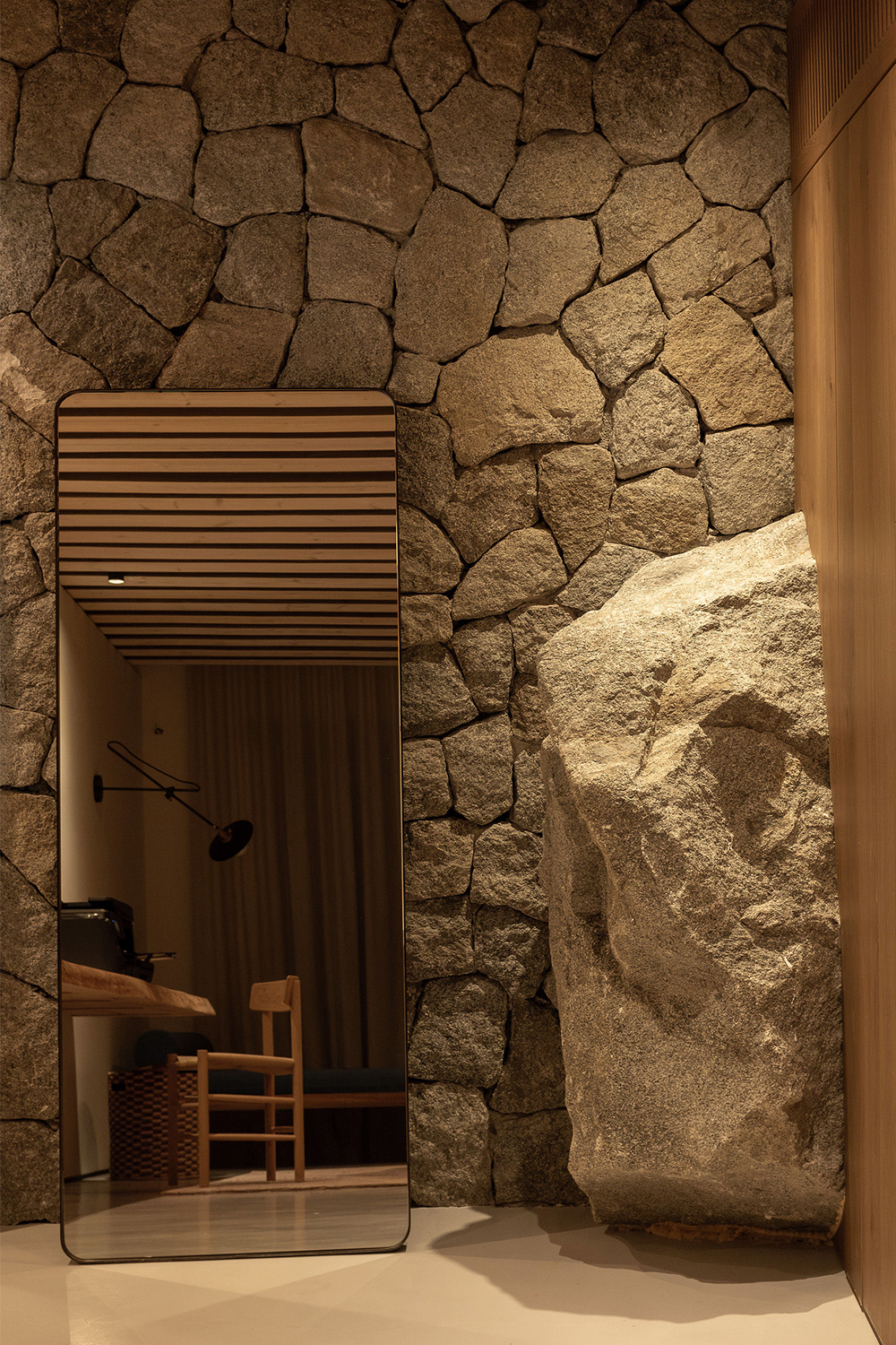 The choice of materials is simple and natural, yet with a rough and delicate touch - the warm touch of Cretan olive wood forms a tactile texture contrast with the rough texture of volcanic rock. The hand-plastered walls capture the changes of light at different times of the day, sometimes presenting the luster of mother-of-pearl and sometimes transforming into the texture of parchment. K-STUDIO's obsession with the "sense of incompleteness" reaches its peak here - those preserved stone joints and woodwork that retain tool marks all speak of the dignity of "handcrafting".