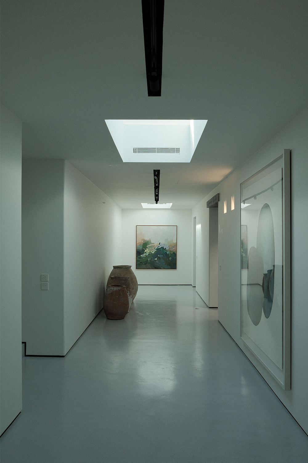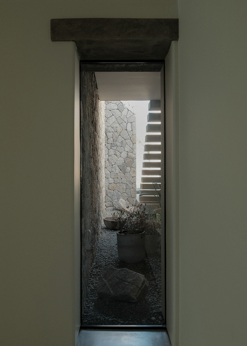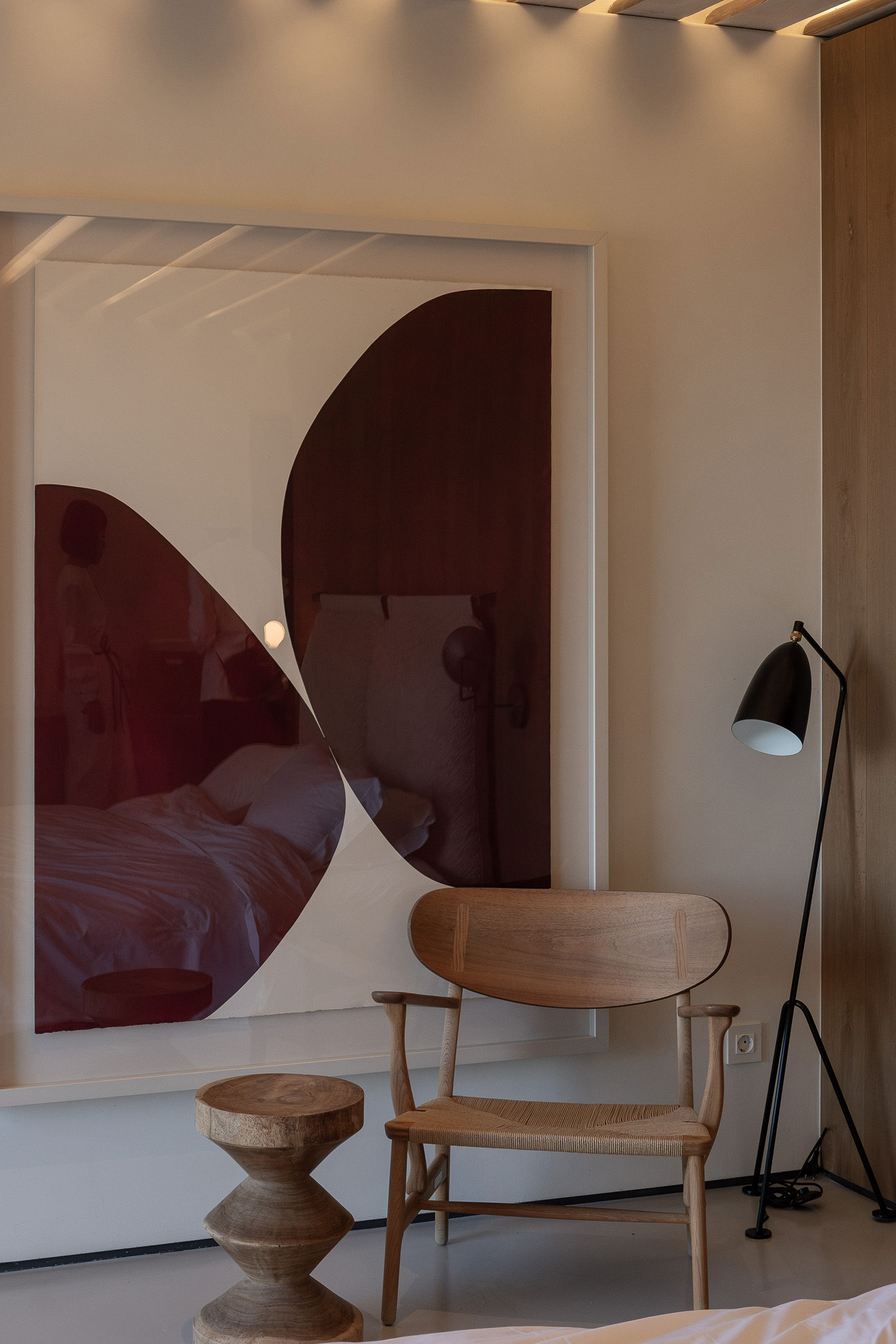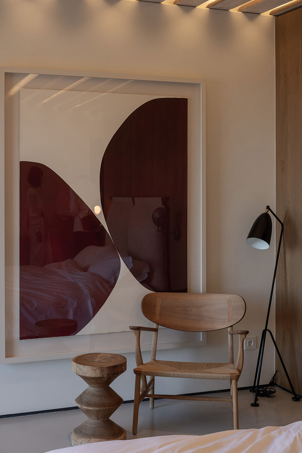 The central courtyard can be regarded as a lyric poem of Mediterranean life. The open-air living room covered with light pergolas presents a materialized representation of a slow-paced lifestyle. The designer uses an exquisite and mischievous step design to create a visual continuity between the swimming pool surface and the distant sea level. When the setting sun dyes Delos Island amber, three layers of blue gradually unfold in the eyes - the cobalt blue of the pool water, the azure of the near sea, and the indigo of the distant sea - just like the layers of color gradations in Monet's paintings.