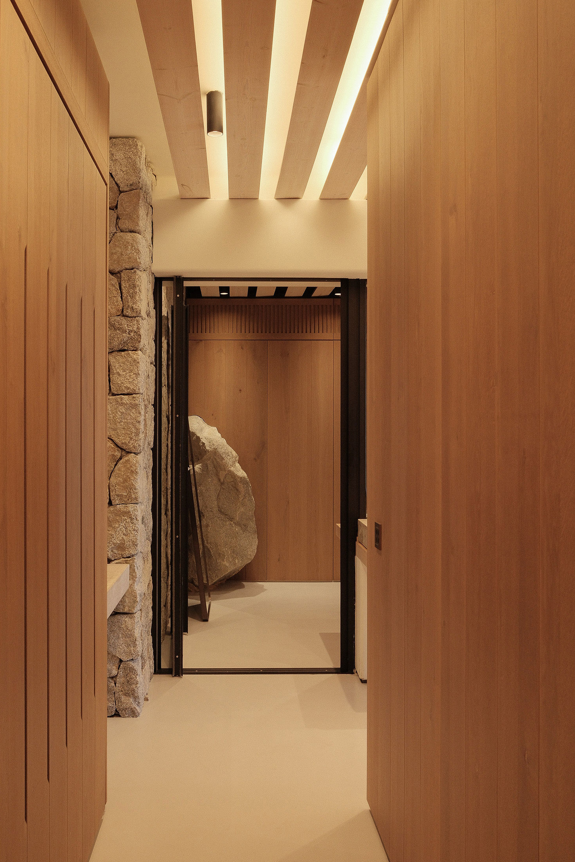 Entering the interior, the arrangement of the spatial sequence also conceals a mystery. The public areas embrace the scenery with an open attitude, while the private dormitories are embedded into the mountains like pearls. This "rise first and then fall" rhythm control enables people to switch freely between the hustle and bustle of social interaction and the tranquility of solitude. It is particularly worth noting those transitional Spaces - the dappled light and shadow filtered out by the wooden grilles and the light trajectories flowing upstream on the lime walls all present the melting of the boundaries between the inside and outside.