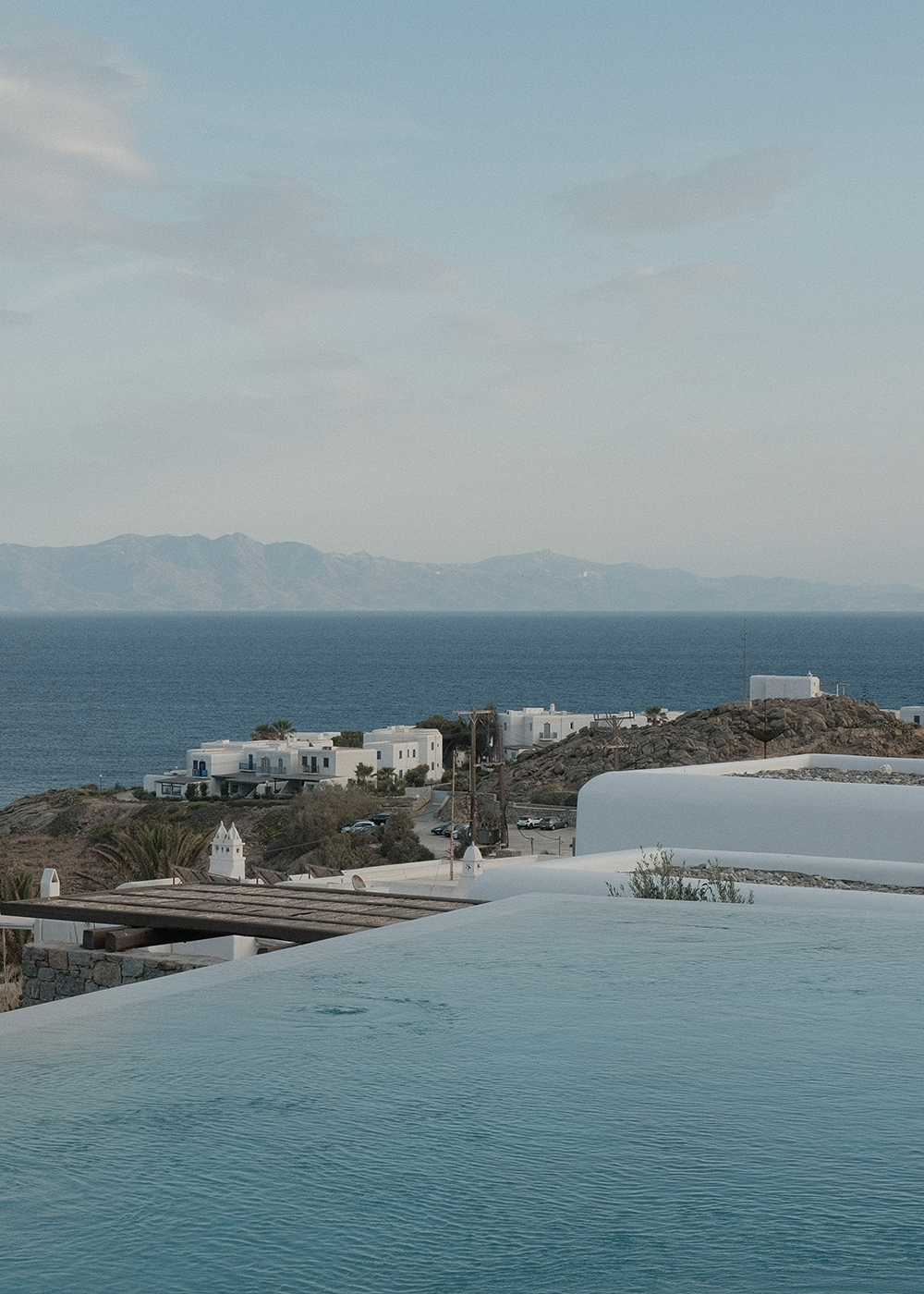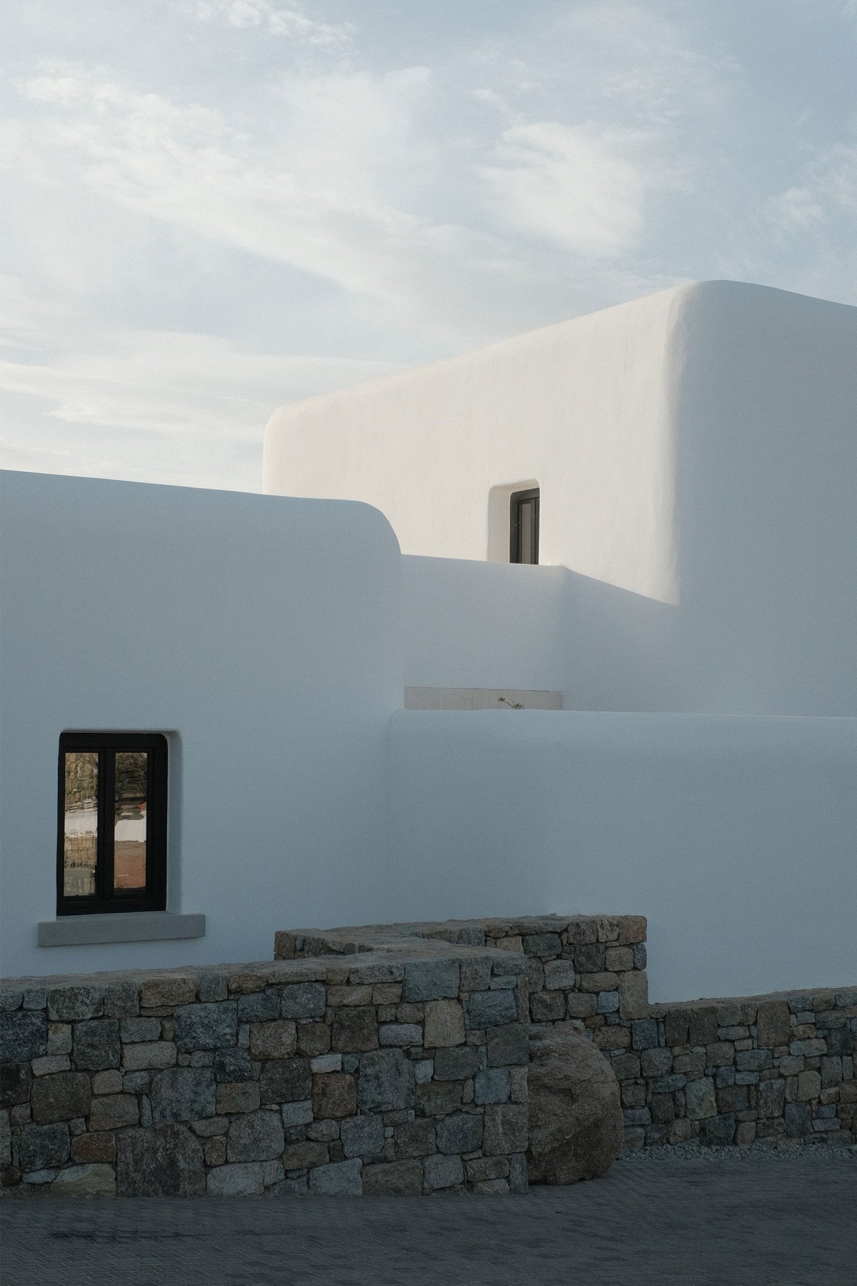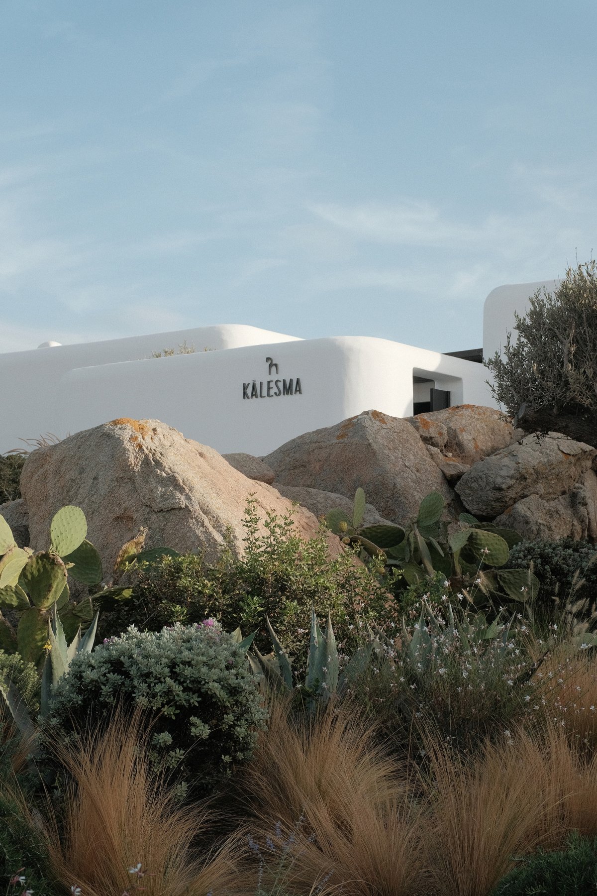 We left the bustling town and made our way to the ridge along the northwest of Mykonos. The noise faded behind us, replaced by an expanse where time seemed to stand still. In the distance, a cluster of white buildings lay quietly along the hilltop, like a natural amphitheater carved by sunlight. This is Kalesma—a vessel for light envisioned by designer Vangelis Bonios, a place where time, nature, and the soul return to harmony.