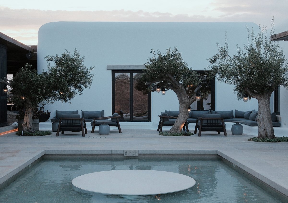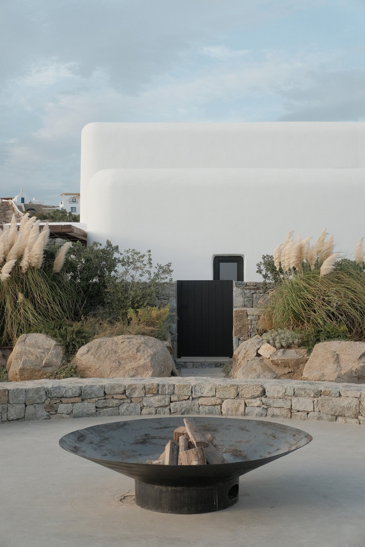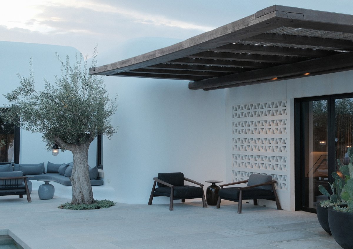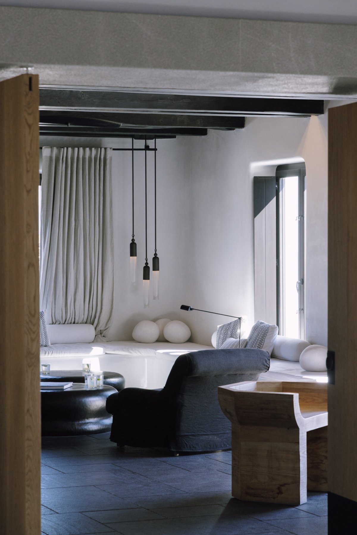 Material becomes the quiet narrator of this architecture. Beneath the minimalist structure, richness flows through detail: beyond the binary of black and white, gradients of brown and grey unfold with warmth. Old timber beams and bamboo weave whisper the traces of time, while the wooden panels behind the reception desk exude a natural glow. Hand-plastered walls recall the vernacular language of Mykonian homes; a sculptural fireplace stands at the centre, its forged details carrying the soul of local craftsmanship. The sofas flanking it reinterpret traditional furniture—ancient in form, yet enlivened by contemporary accents.