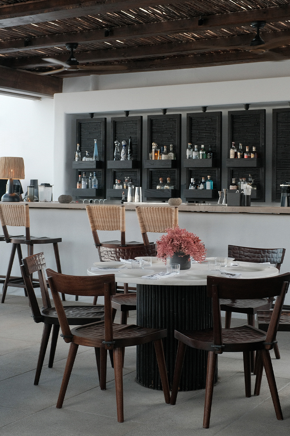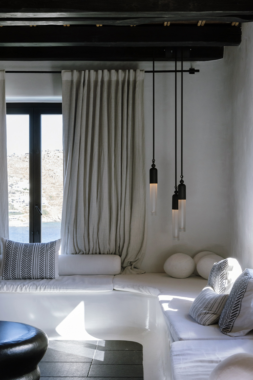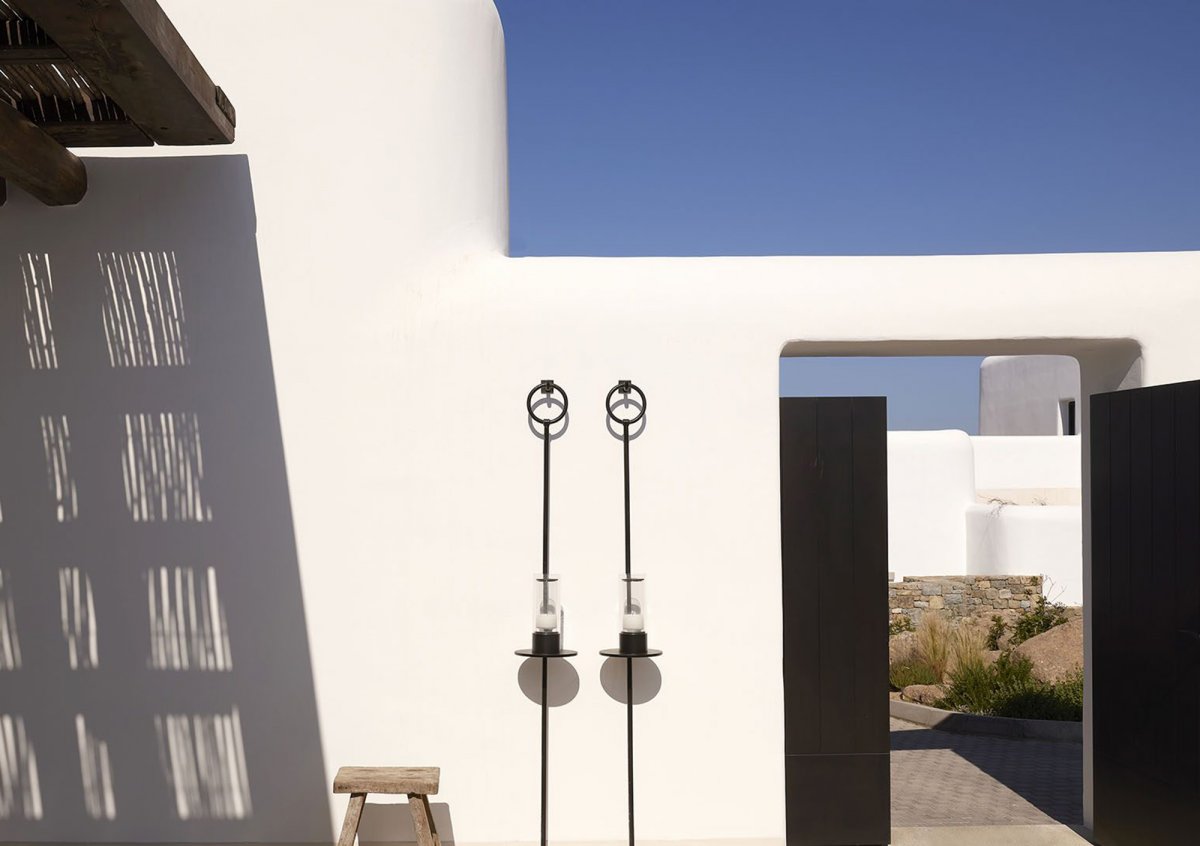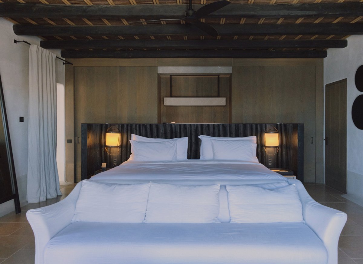 Material becomes the quiet narrator of this architecture. Beneath the minimalist structure, richness flows through detail: beyond the binary of black and white, gradients of brown and grey unfold with warmth. Old timber beams and bamboo weave whisper the traces of time, while the wooden panels behind the reception desk exude a natural glow. Hand-plastered walls recall the vernacular language of Mykonian homes; a sculptural fireplace stands at the centre, its forged details carrying the soul of local craftsmanship. The sofas flanking it reinterpret traditional furniture—ancient in form, yet enlivened by contemporary accents.
