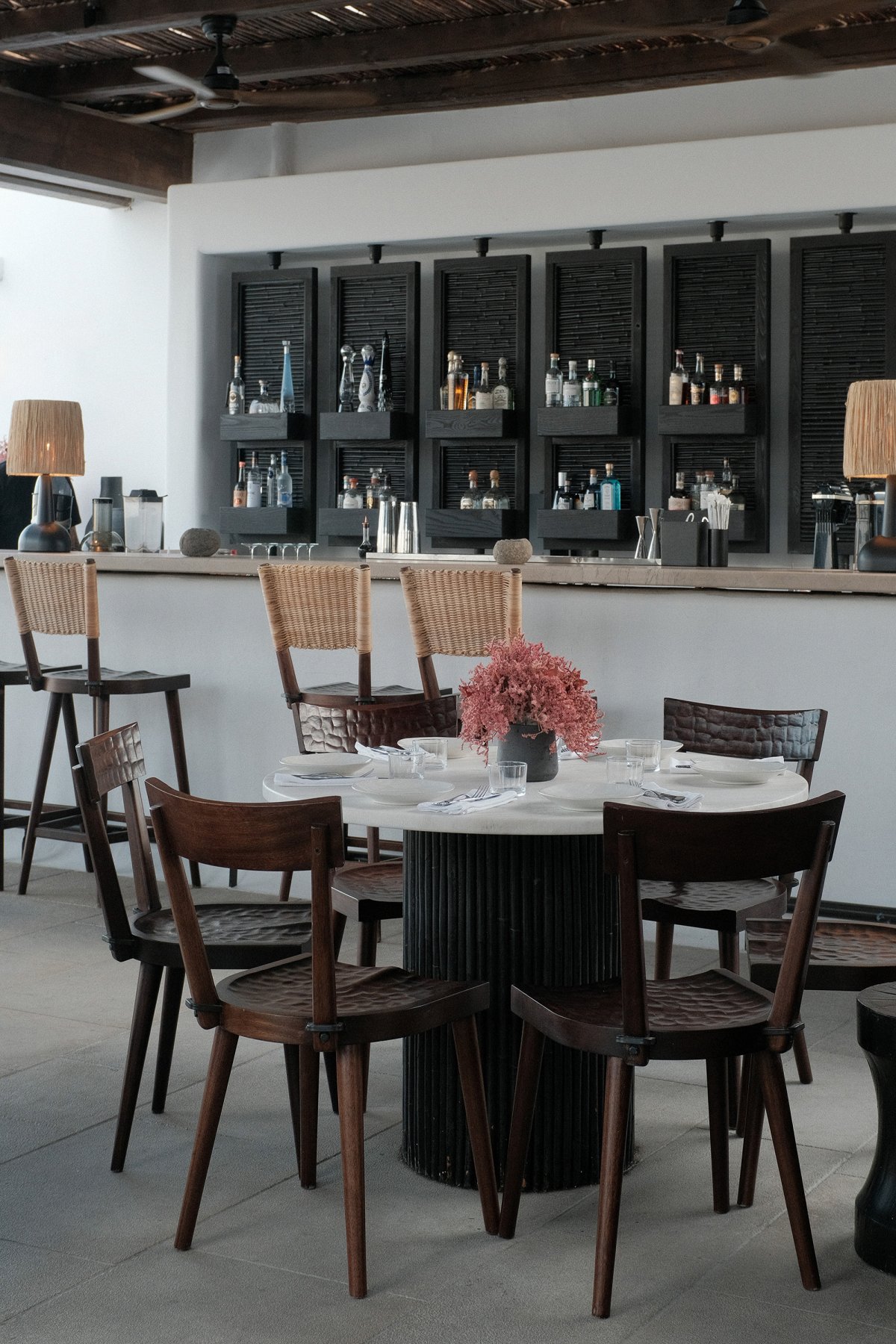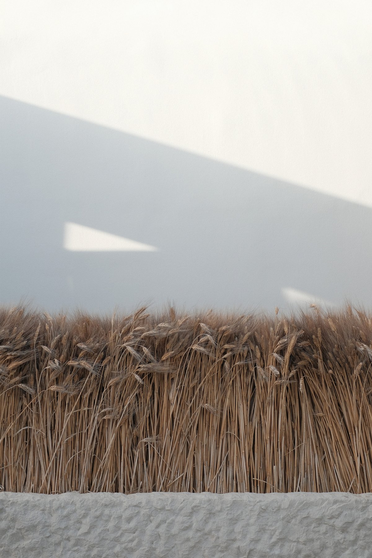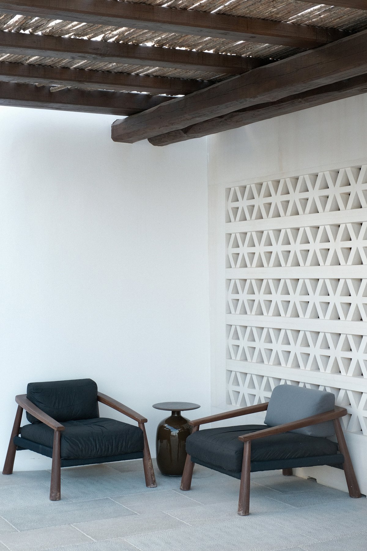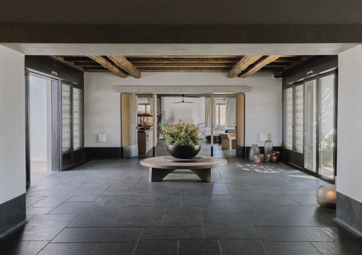 Material becomes the quiet narrator of this architecture. Beneath the minimalist structure, richness flows through detail: beyond the binary of black and white, gradients of brown and grey unfold with warmth. Old timber beams and bamboo weave whisper the traces of time, while the wooden panels behind the reception desk exude a natural glow. Hand-plastered walls recall the vernacular language of Mykonian homes; a sculptural fireplace stands at the centre, its forged details carrying the soul of local craftsmanship. The sofas flanking it reinterpret traditional furniture—ancient in form, yet enlivened by contemporary accents.