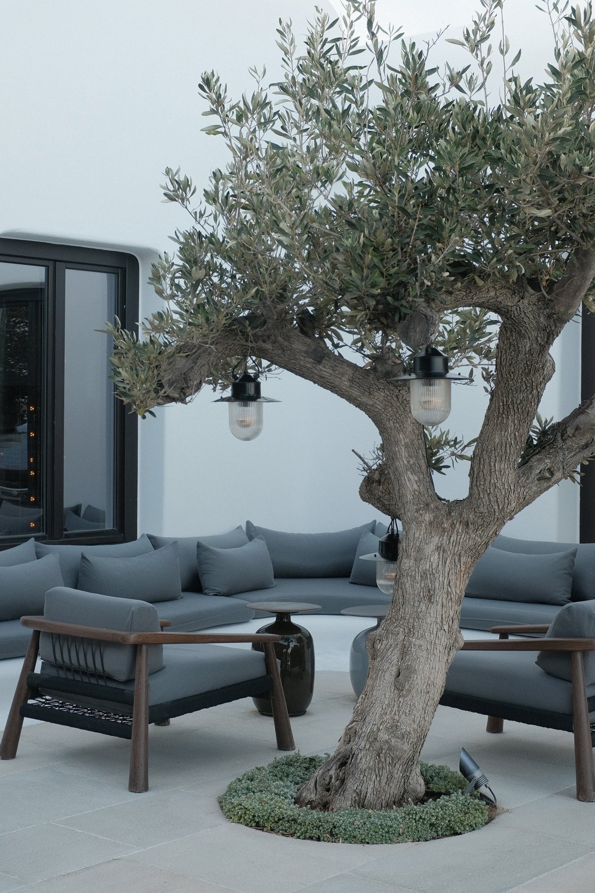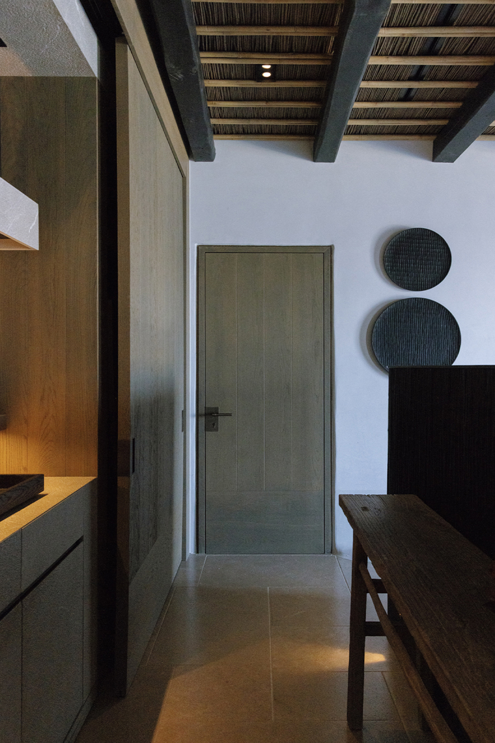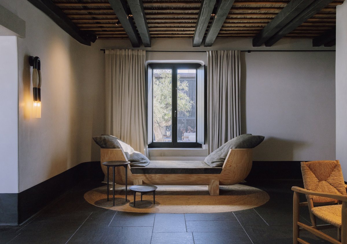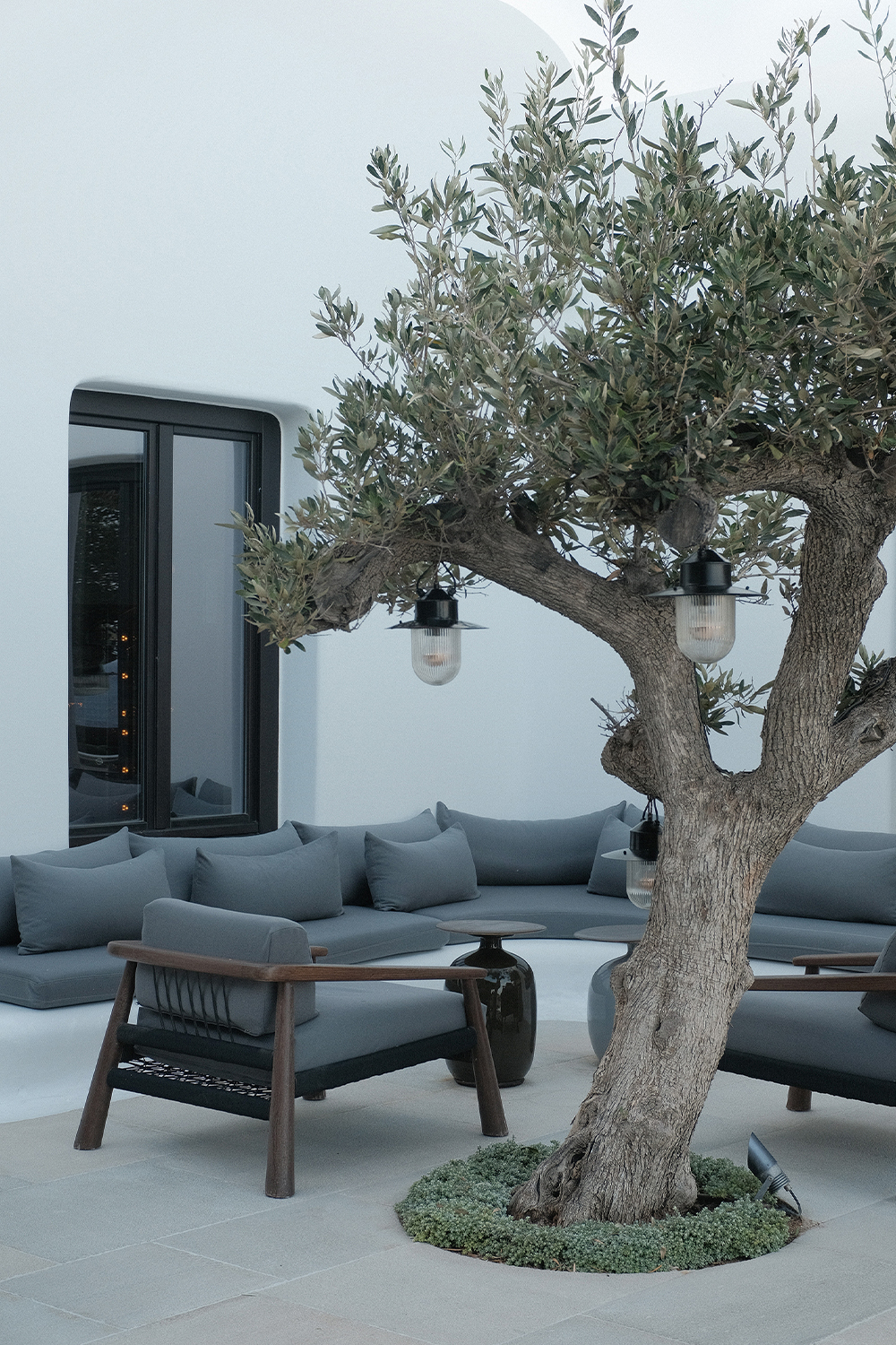 The entrance unfolds as a modest yet elegant outdoor foyer. An ancient olive tree stands still, its leaves trembling gently in the breeze—as if whispering: the ritual of serenity begins here. Stepping into the lobby, daylight retreats at once; the gaze narrows, condensing the sea and sky into a single point of focus. “Light requires the praise of shadow,” says Vangelis, running his fingers along the rough stone wall. “Just as in Greek mythology, the underworld makes Olympus’s light more sacred.” He deliberately lowers the brightness of the space, letting darkness become the prelude to light—this cave-like stillness was a seed planted five years ago with K-Studio, marking the island’s first interior defined by deep, moody tones.