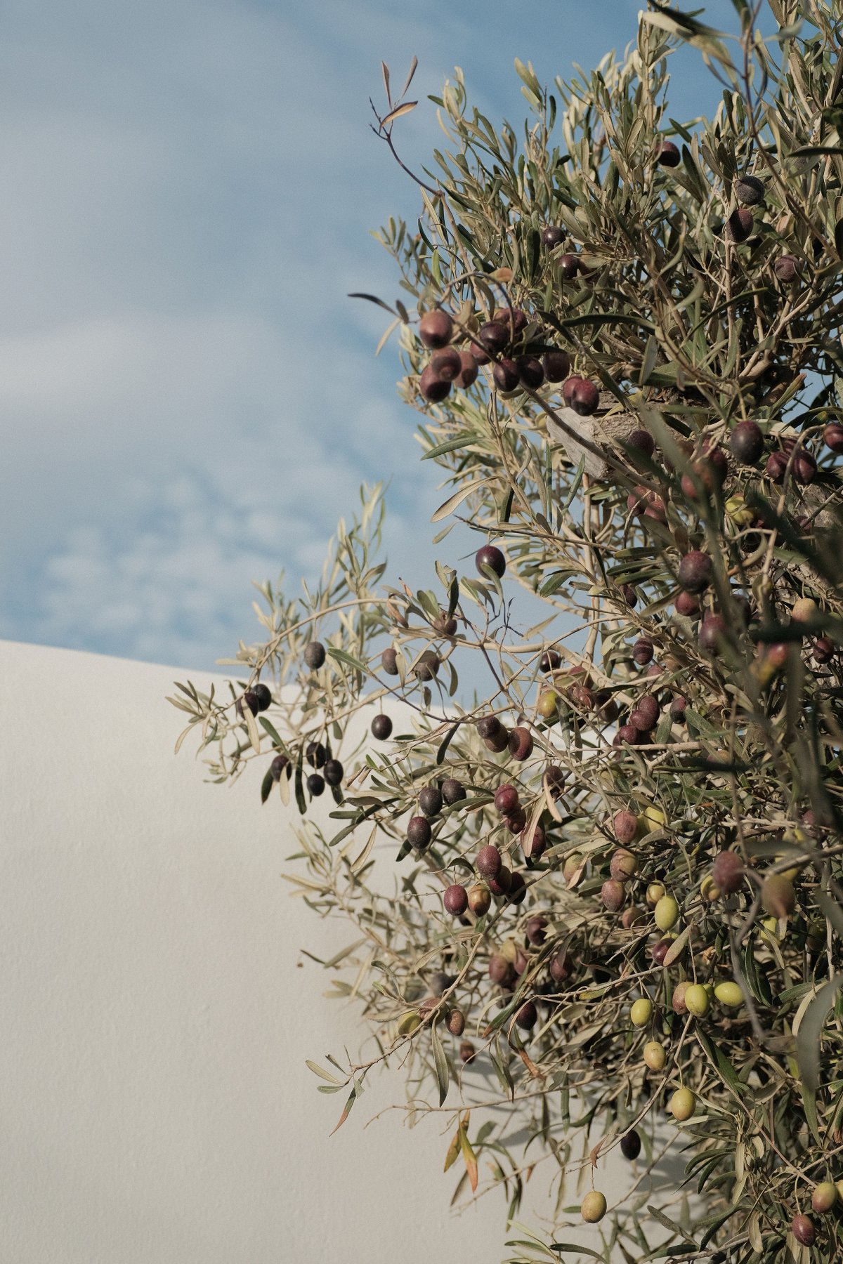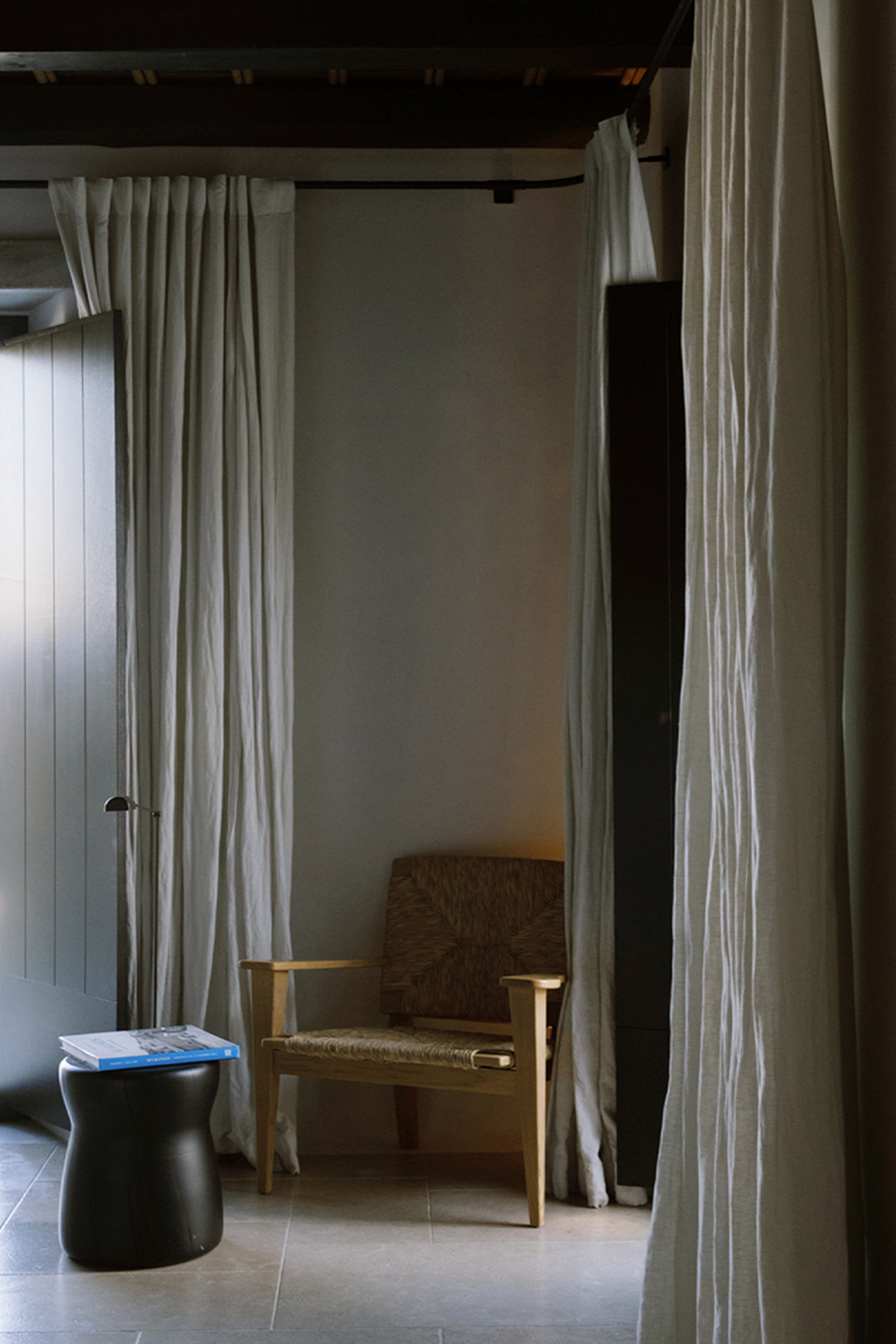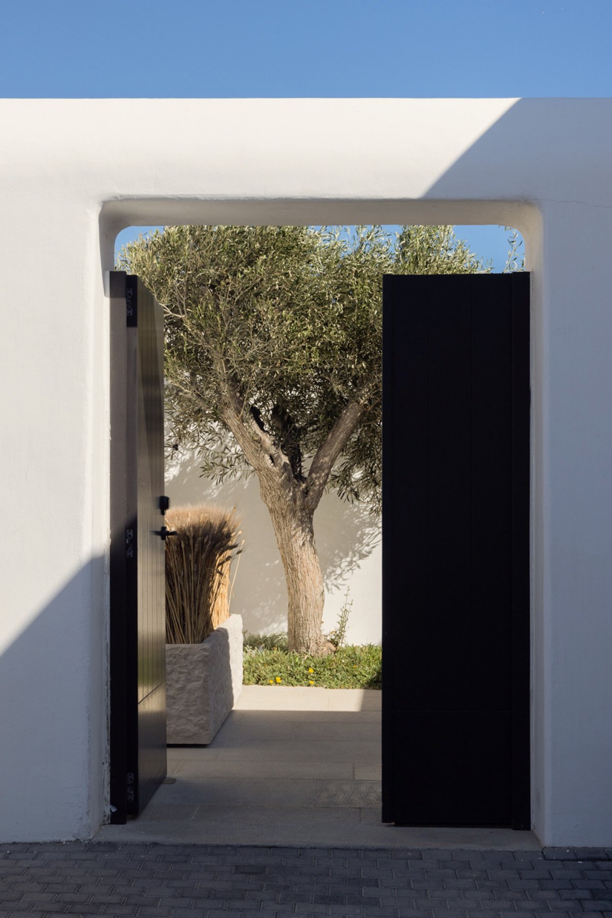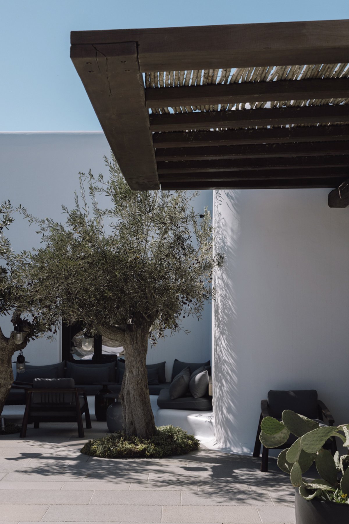 The entrance unfolds as a modest yet elegant outdoor foyer. An ancient olive tree stands still, its leaves trembling gently in the breeze—as if whispering: the ritual of serenity begins here. Stepping into the lobby, daylight retreats at once; the gaze narrows, condensing the sea and sky into a single point of focus. “Light requires the praise of shadow,” says Vangelis, running his fingers along the rough stone wall. “Just as in Greek mythology, the underworld makes Olympus’s light more sacred.” He deliberately lowers the brightness of the space, letting darkness become the prelude to light—this cave-like stillness was a seed planted five years ago with K-Studio, marking the island’s first interior defined by deep, moody tones.