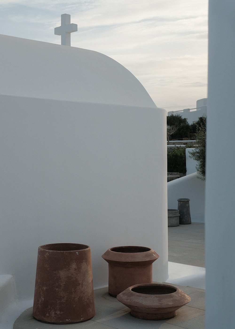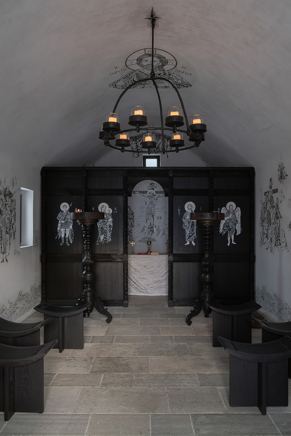 We emerge from the shadows, and light bursts open—the vast Aegean unfolds before our eyes. Around the corner, a minimalist white chapel stands quietly, stirring our curiosity. Inside, the soul seems to be gently cleansed by light and silence: the charred-wood screen bears a calm texture; hand-forged iron chandeliers descend, infusing solemnity; low black benches line the floor, inviting visitors to pause and pray. Vangelis paints biblical fragments in monochrome, bringing divinity back to the realm of perception. When the setting sun filters through glass and casts its glow upon the mural, gold leaf shimmers within the dark surface—the sanctity of the moment lies not in gilded domes, but in the subtle breath between light and time.