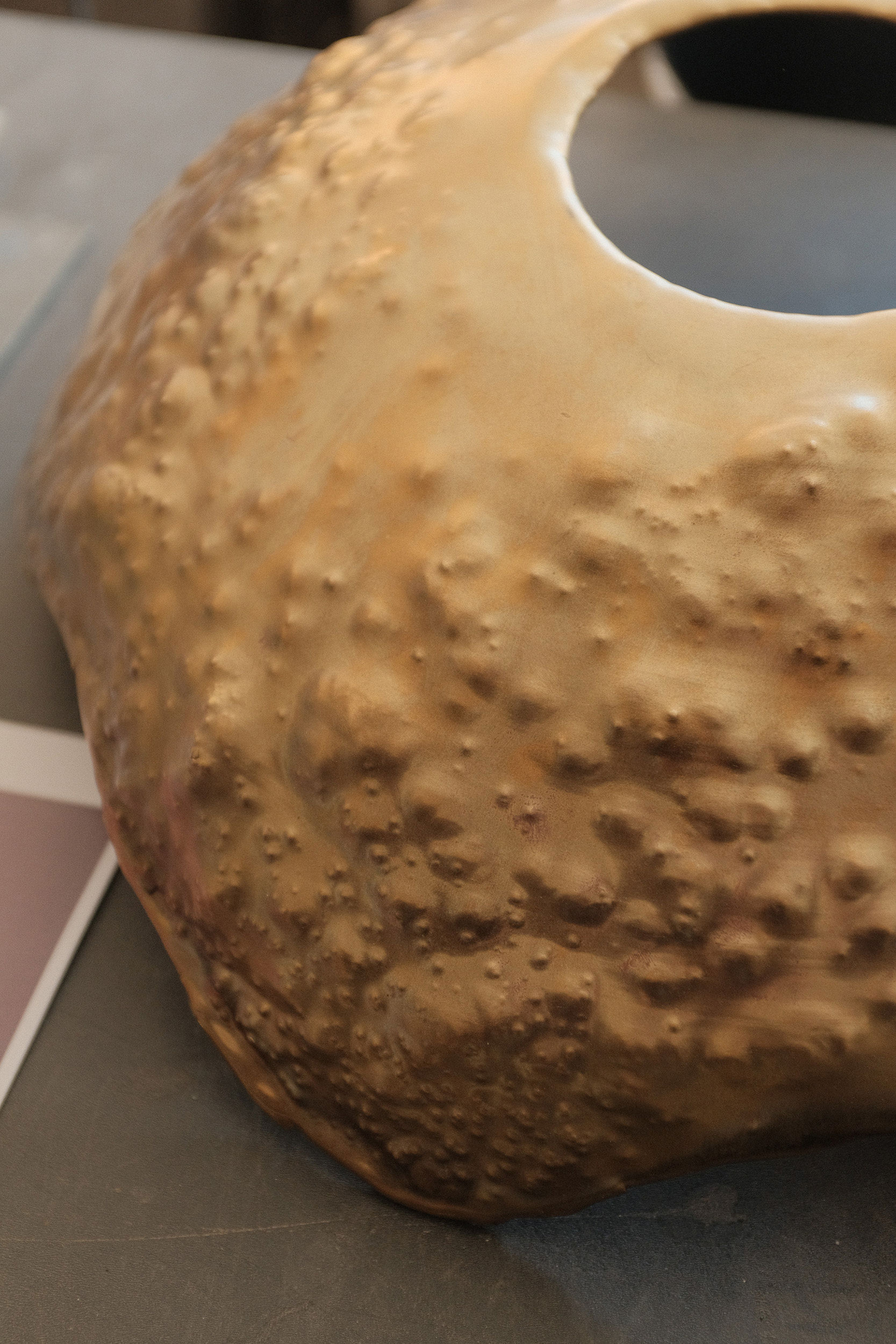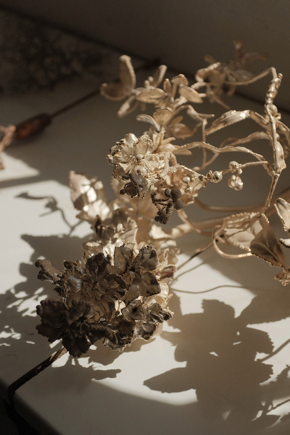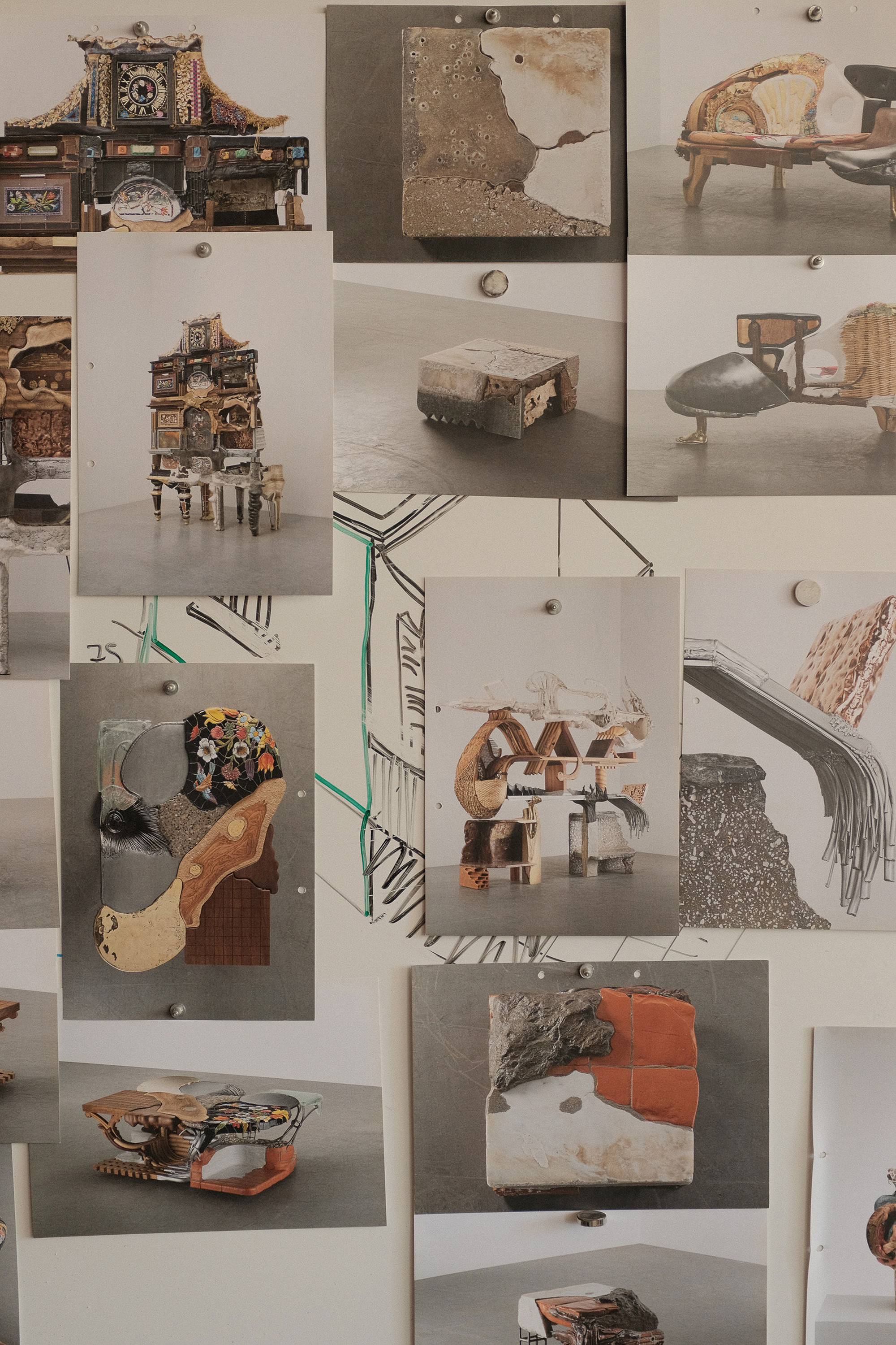 “I want to challenge the idea that preciousness must come from scarce materials,” Kostas explained, pointing to *Elemental Cabinet*, the graduation project that brought him recognition in the art world. The piece ironically replicates Florence's “most expensive Baroque furniture” while questioning the boundaries between “original” and “reproduction.” It brings together decorative elements from ancient and modern craftsmanship, blending noble and humble materials—from bronze and ceramics to embroidery and melted remnants of old plastic chairs—culminating in a work that defies tradition.