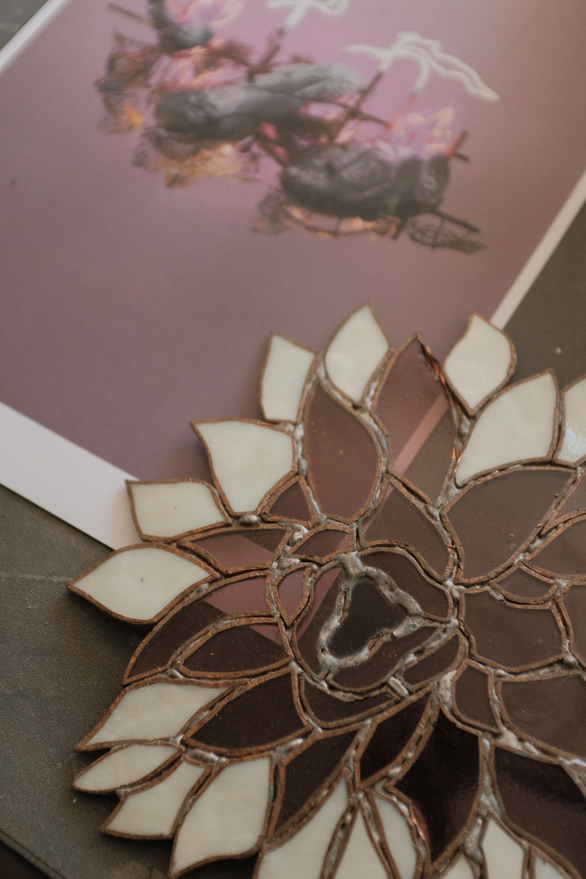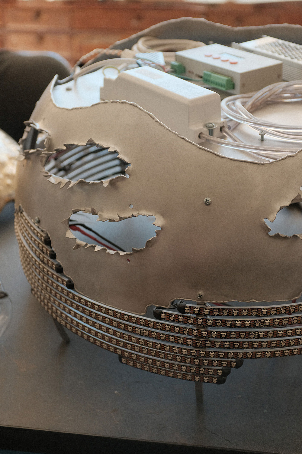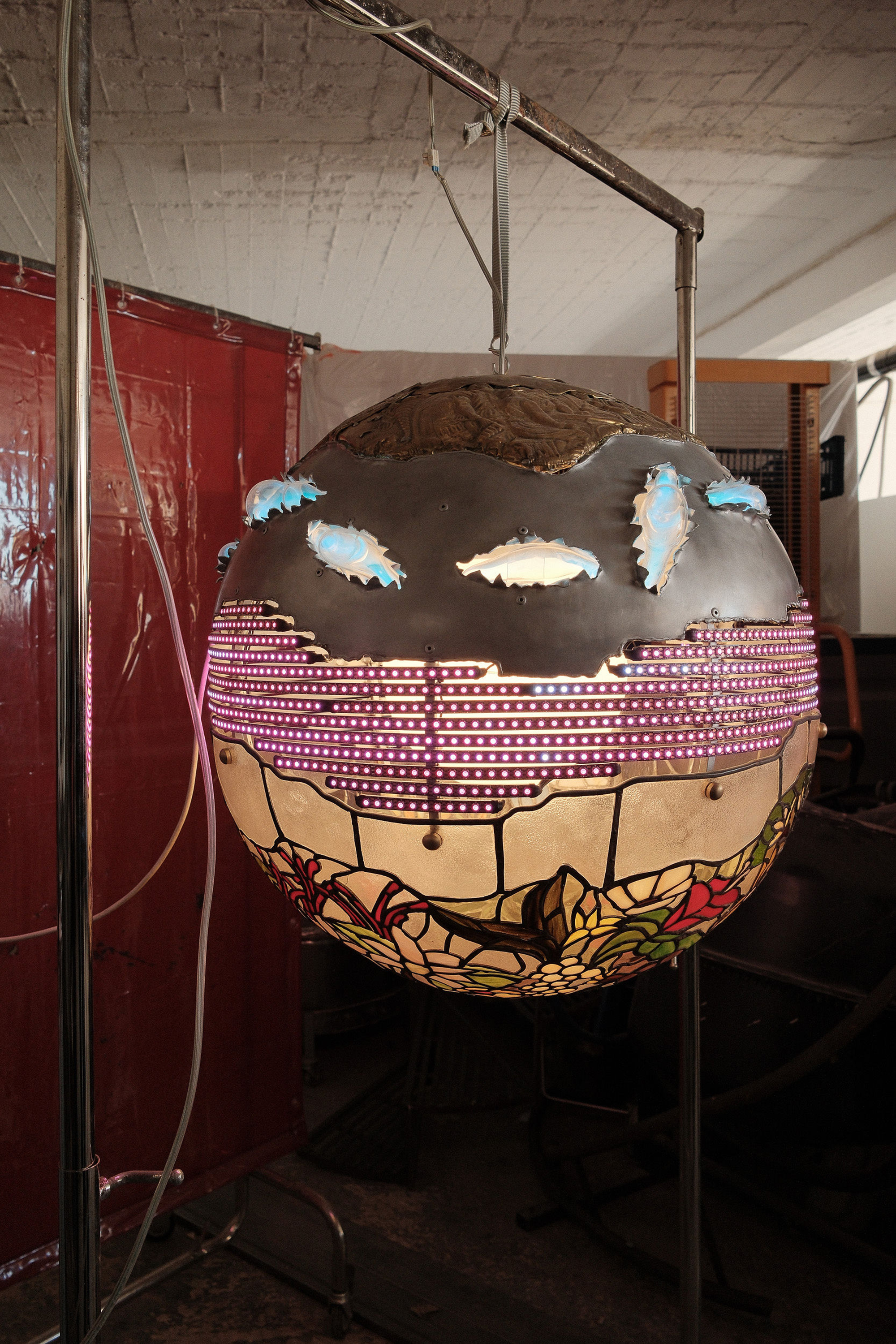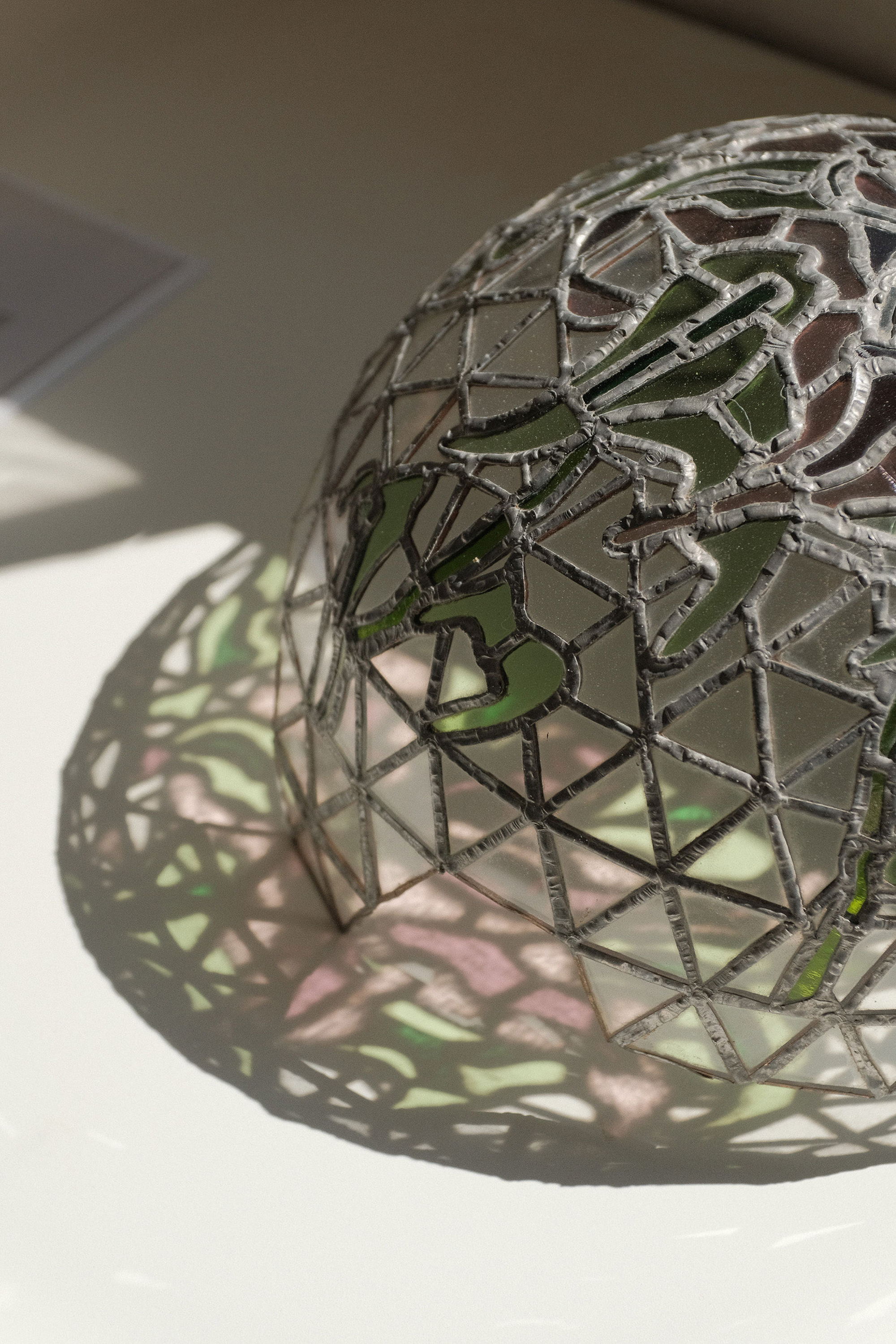 Light filters through stained glass, casting patterns on the wall. Reflections from copper sheets interweave with the cool glow of neon—Kostas switches on a chandelier from the same series exhibited in Paris. Materials from different eras and properties are “squeezed” into a single form: LED bulbs connected to vintage incandescent lights, colored glass inlaid with copper and aluminum sheets, neon tubes coiled around brass supports.