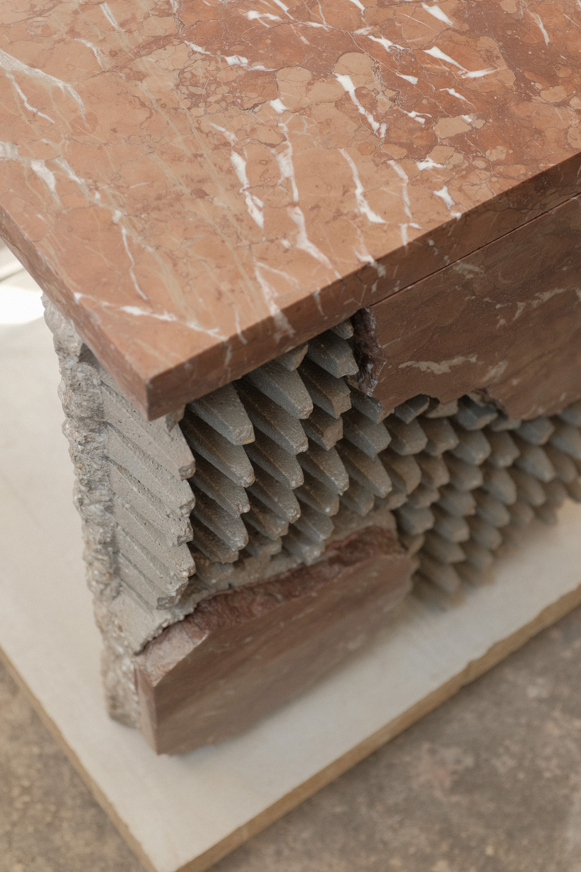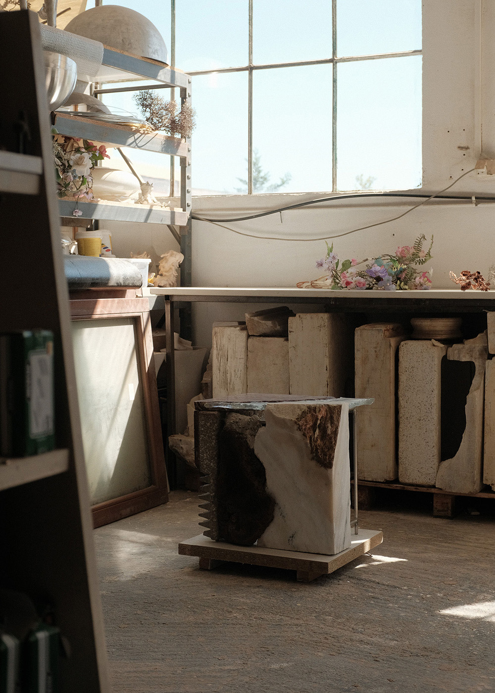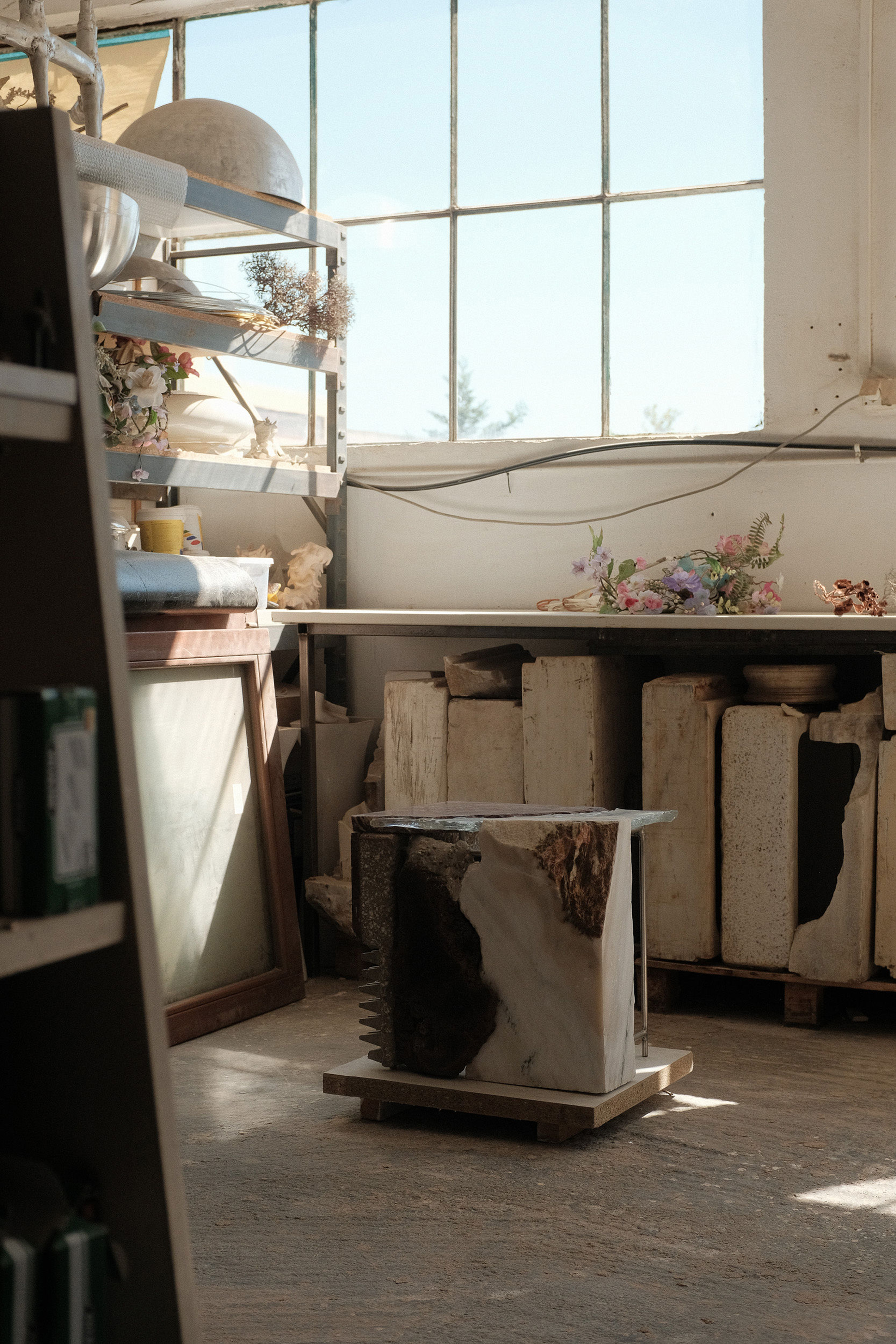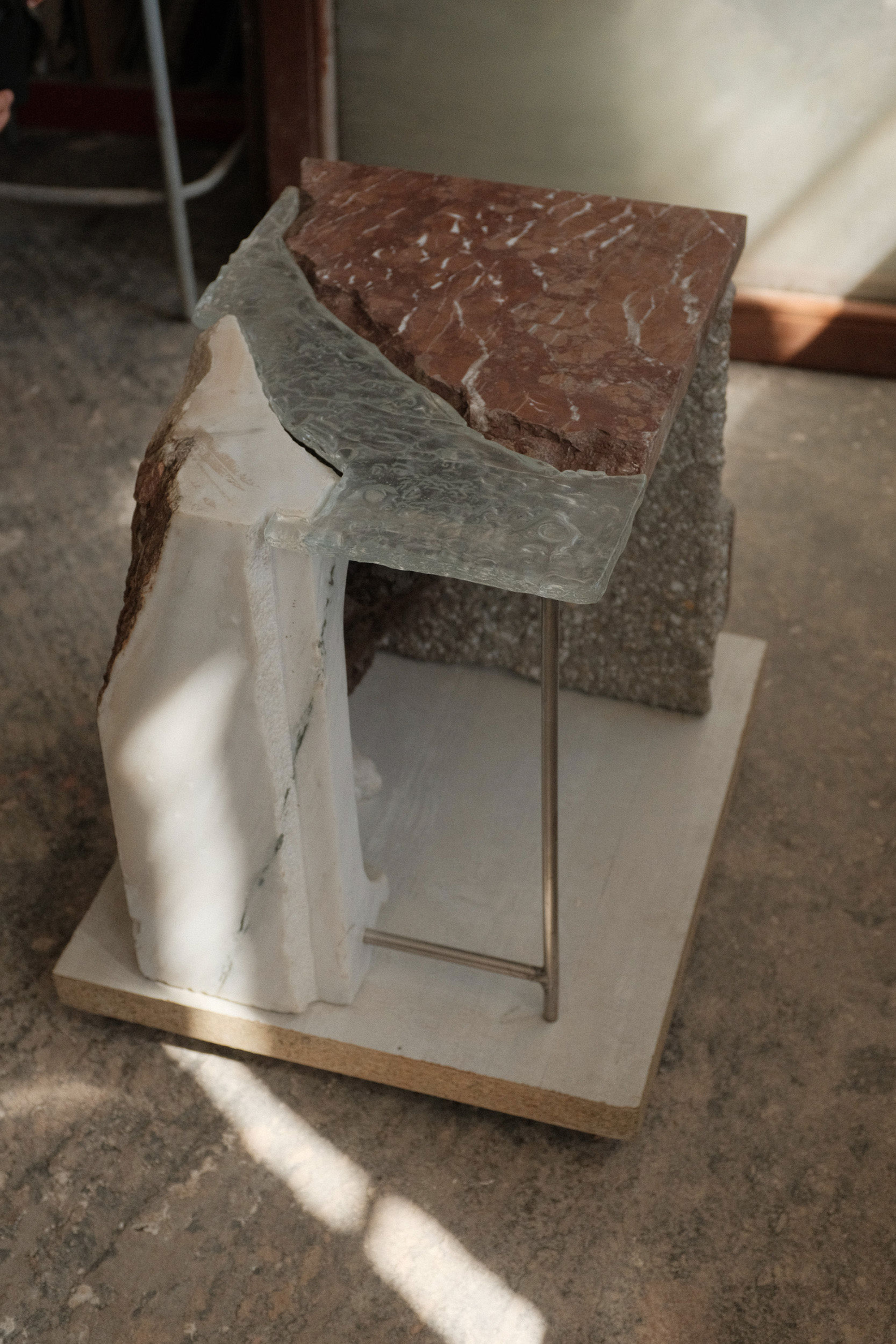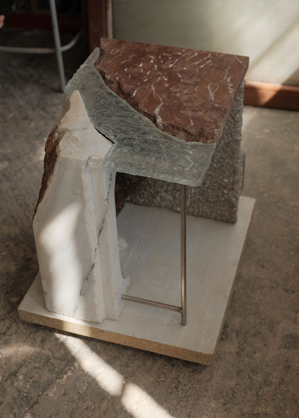 A table composed of two types of stone represents another experimental creation. The white marble, bathed in sunlight, reveals a warm and delicate texture, while the concrete on the other side exudes a raw, unpolished tension. Between them, a translucent plastic surface is inserted with restrained precision, creating a remarkable symbiotic balance—soft, rough, and transparent—all coexisting on the same plane.