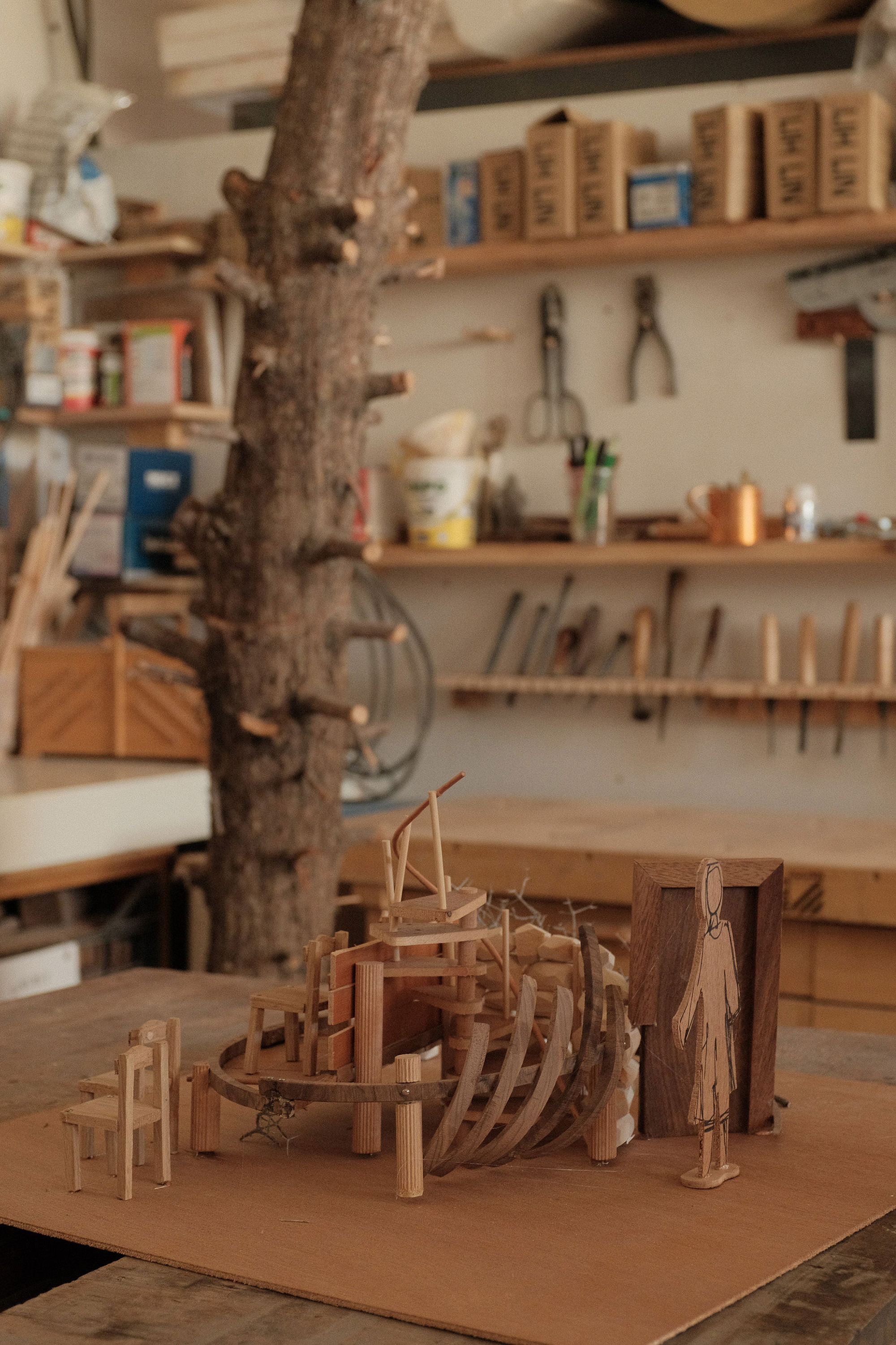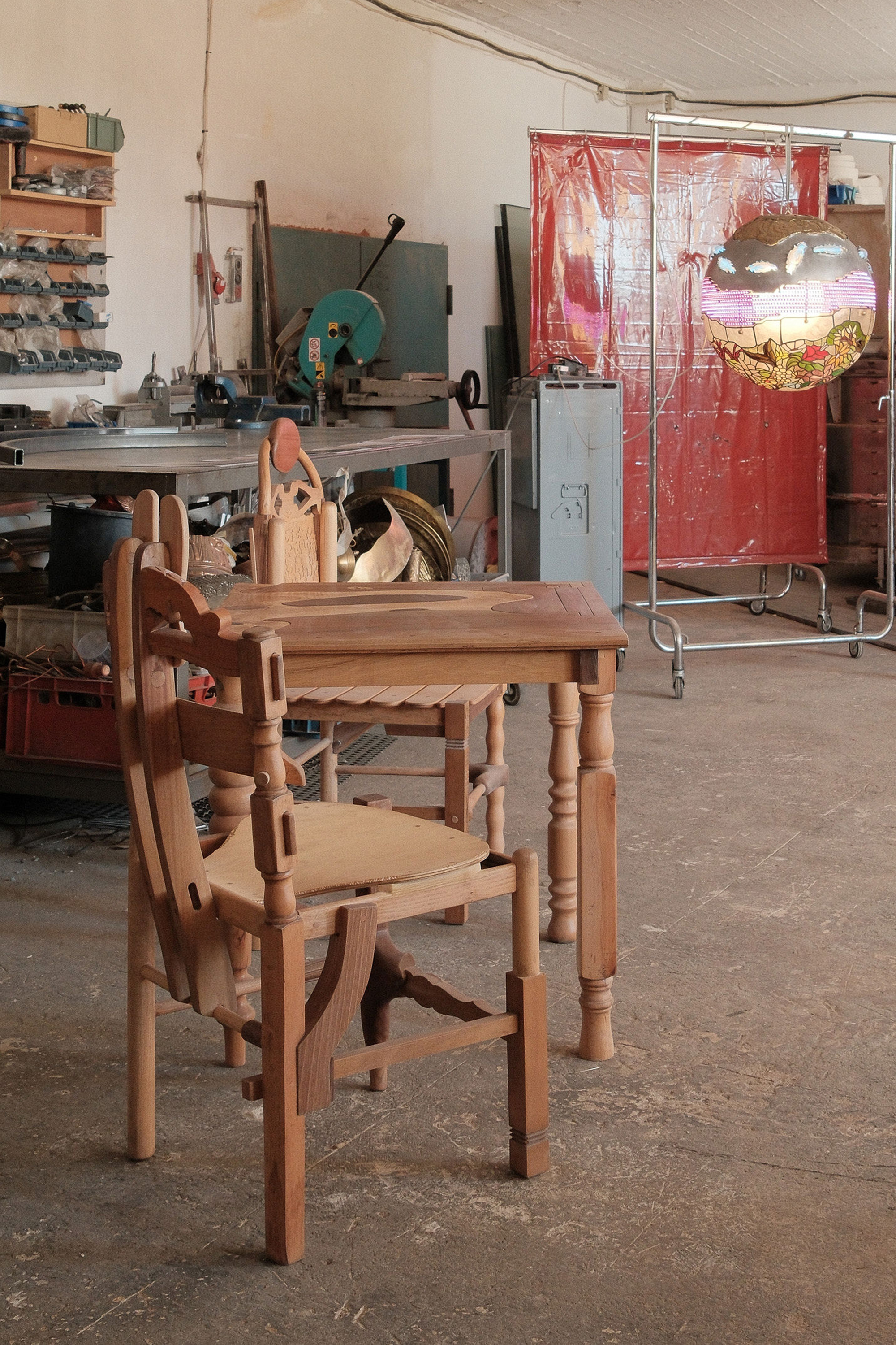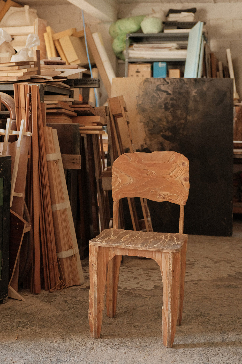 Beyond the blue iron door, the earthy fragrance of aged wood mingled with the sharp, clean scent of metal polish. The studio felt like a living colony of materials, each corner dedicated to a different essence: metal, stone, plastic, and wood. In the woodworking area, logs over two meters tall stood solemnly, while meticulously carved blocks awaited assembly. The metal section displayed components with strangely textured surfaces. Marble in the stone zone gleamed with a cool light, and plastic works cast colorful shadows across tabletops. “It doesn't matter to me whether something was found in the trash or cost a thousand euros—I treat it with the same respect, or lack thereof,” Kostas remarked.