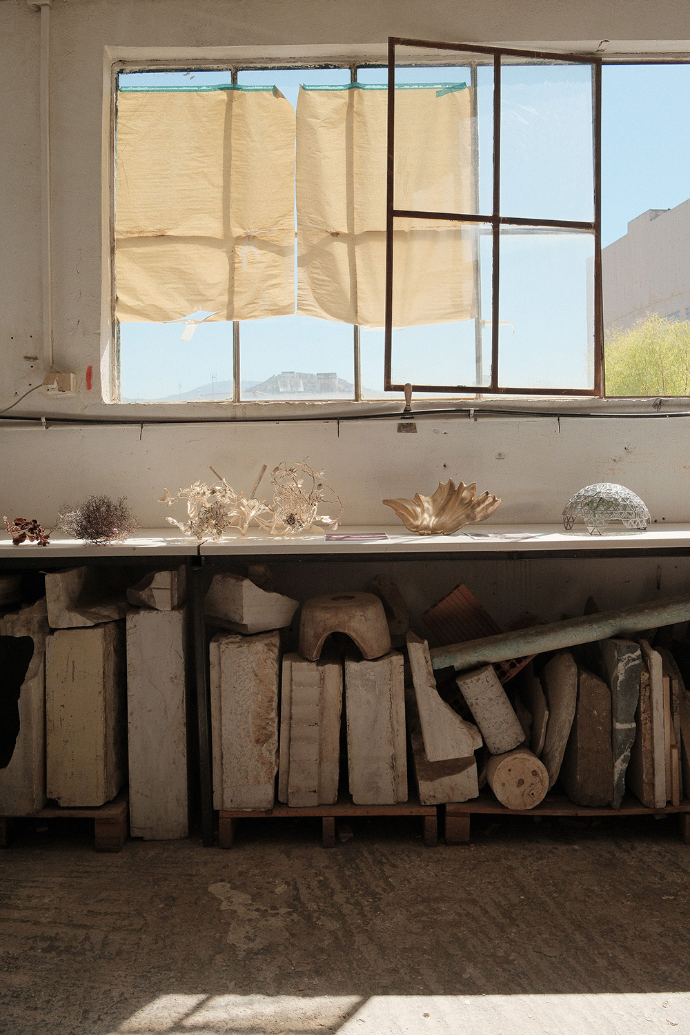 We quickened our pace and arrived at the young Greek artist's studio on the second floor. This is where he practices what he calls “material egalitarianism,” a creative realm where copper and plastic, antique wood carvings and automotive waste collide, merge, and spark inspiration.