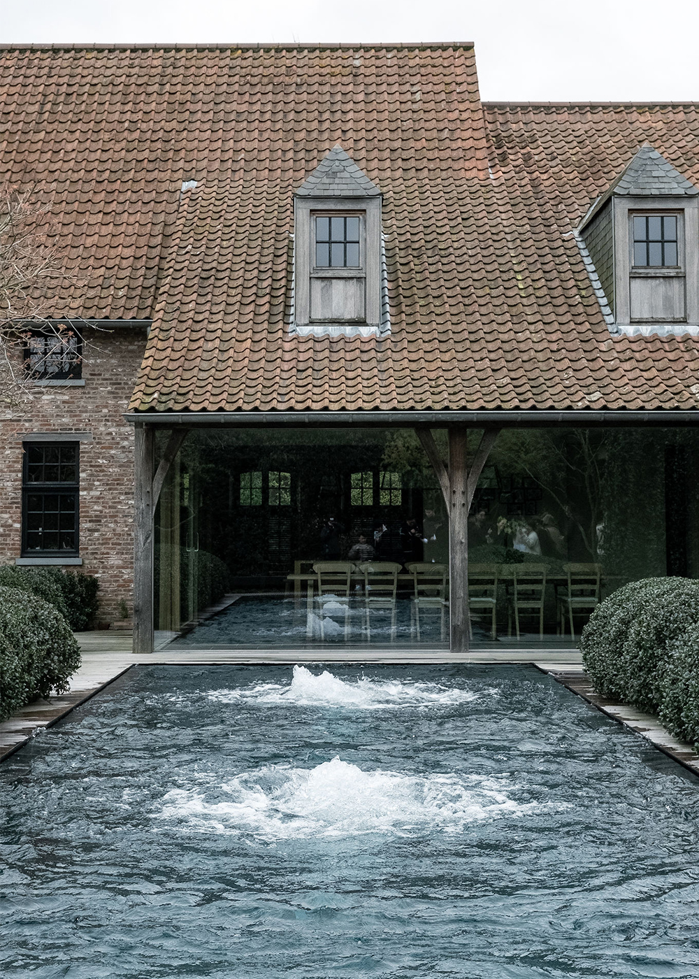 Residence M in Oudenburg is set in a picturesque area and is owned by Bart Monbaliu, founder and owner of Monbaliu & Biopool. Within the orderly garden, a sleek black modern pool stretches out quietly, forming a striking contrast with the adjacent historic brick-and-stone architecture. Designed by Belgian interior architect Frederic Kielemoes, the house becomes the starting point from which he leads us on a journey through art and design.