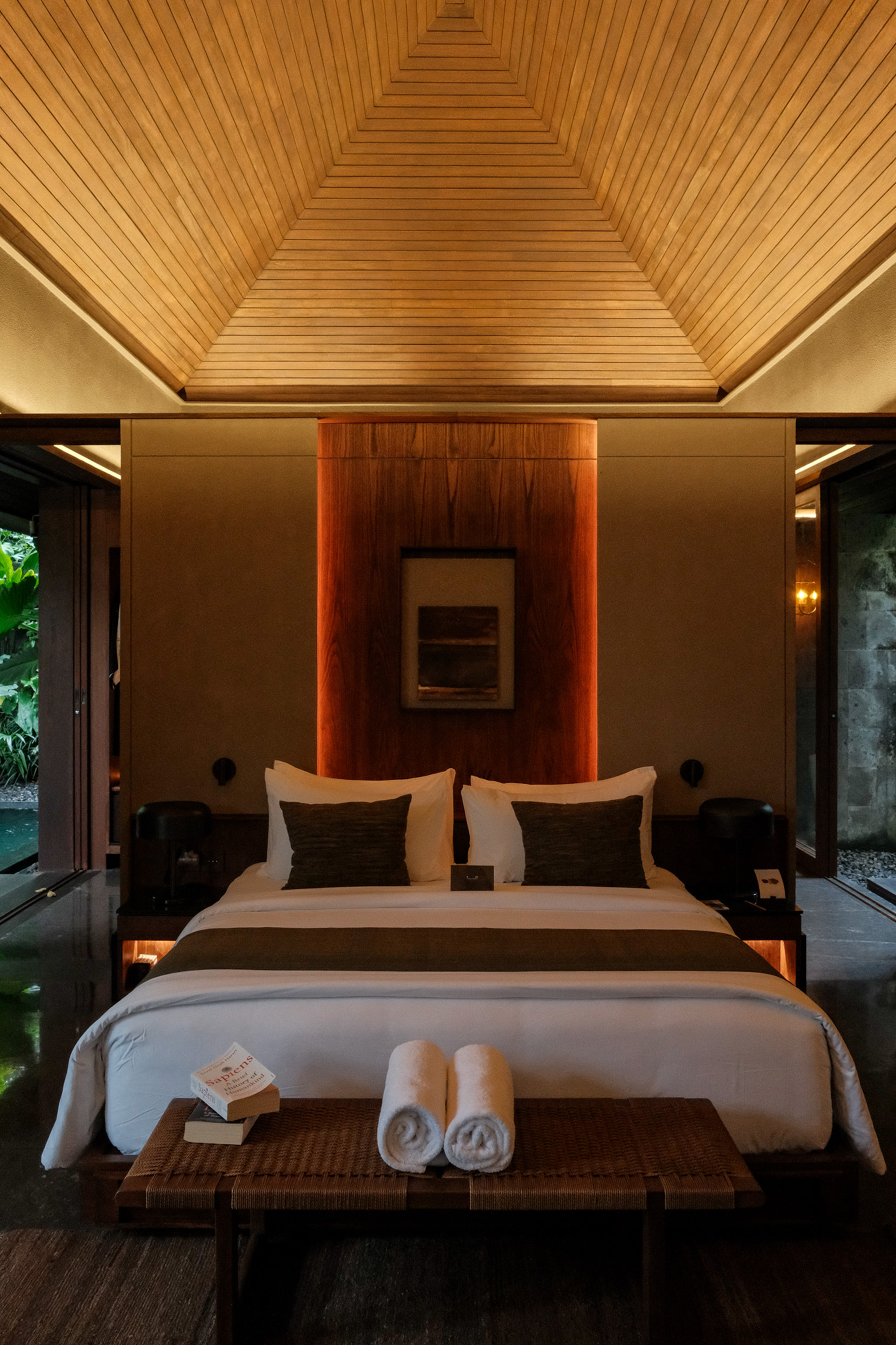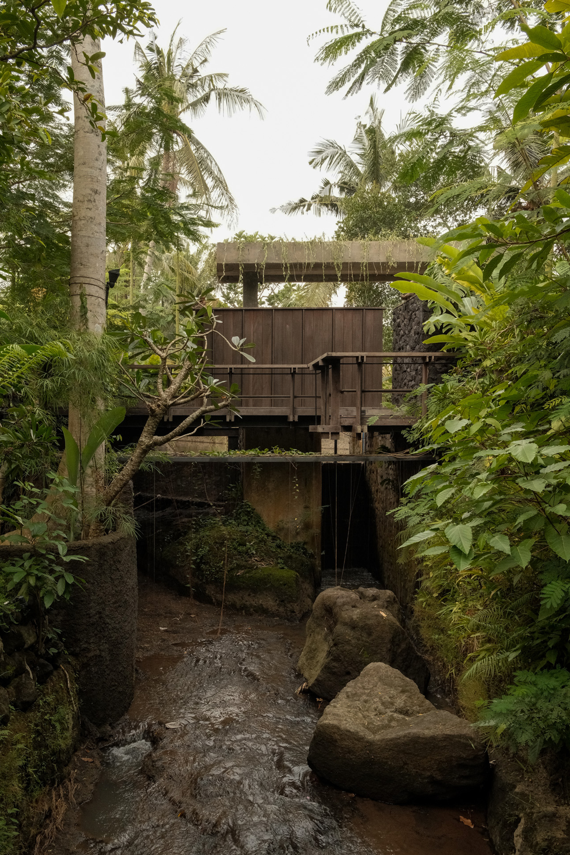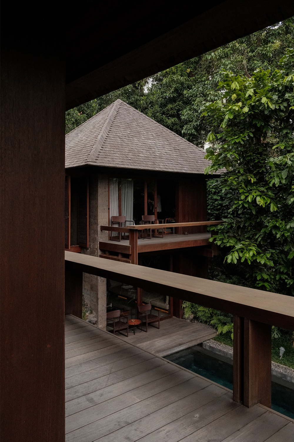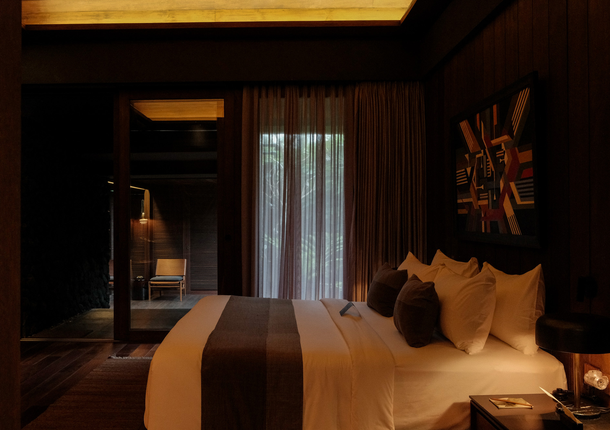Designed by Nataneka Architect in 2022 (opening December 2024), the site is bisected by a natural creek. On the high ground, the owner’s residence overlooks vistas; across the water, four villas and communal areas nestle on gentle slopes. A wooden bridge connects both worlds, while a horizontally grown tree at eye level screens the private quarters. "We added this tree deliberately," the owner states by the window. "Guests crossing the bridge now only glimpse riverlight through leaves. Amid Canggu’s architectural clamor, true challenge lies in becoming one with the environment."
